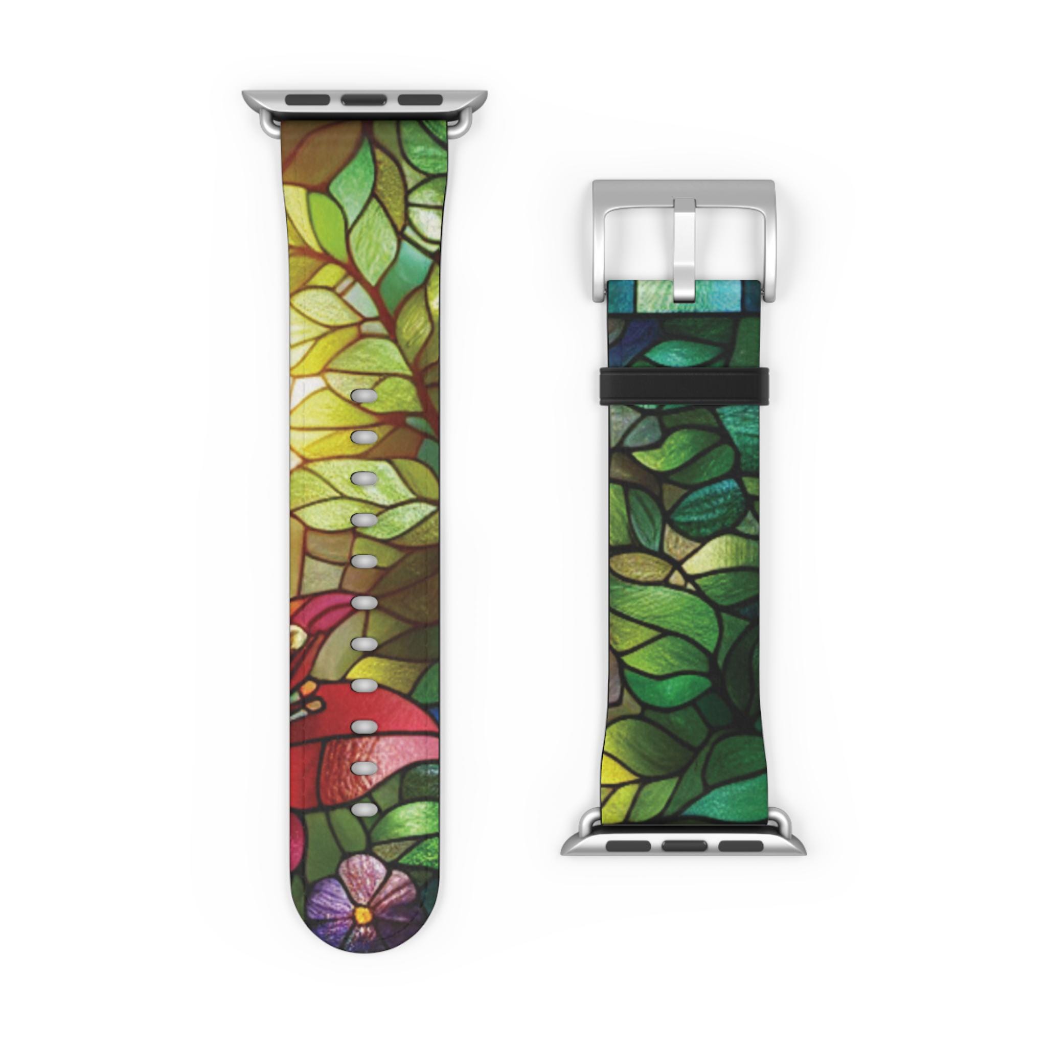 Apple watch stained glass art floral watch band. Elevate your style with this stunning Watch Band, designed for the modern individual who appreciates both functionality and artistry. Crafted from high-quality 100% polyester faux leather, this band showcases a vibrant floral design that brings a touch of nature to your wrist. With a stainless steel buckle and adaptor, it seamlessly attaches to Apple Watch Series 1 through 9 and SE devices, ensuring you stay connected without compromising your style.