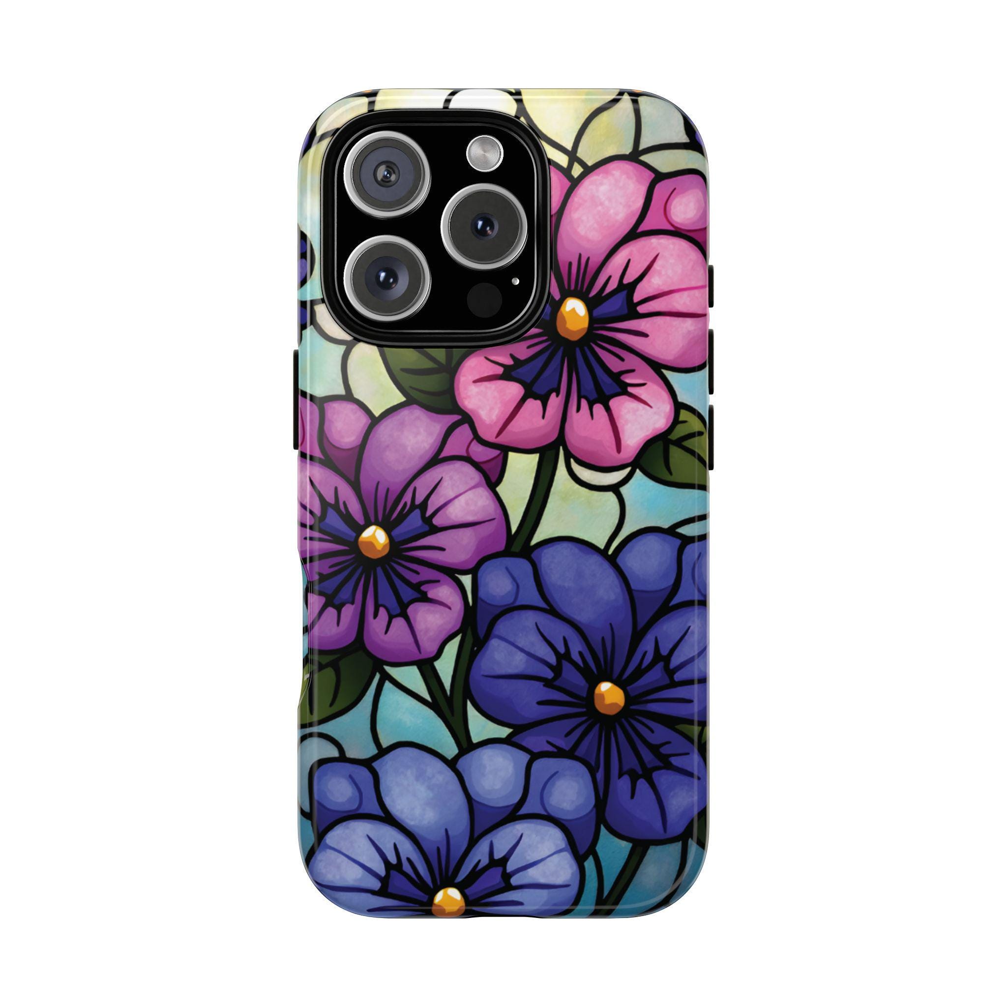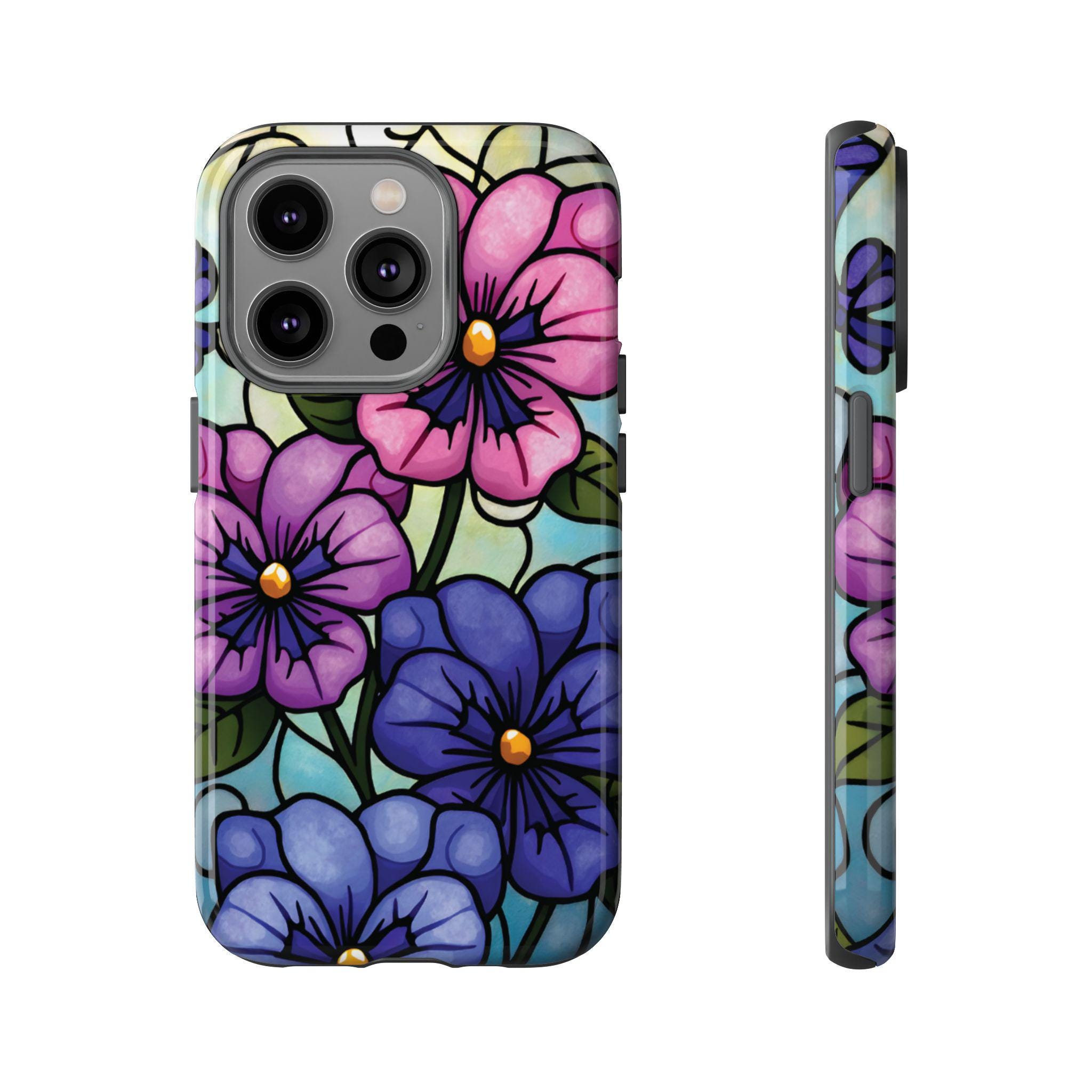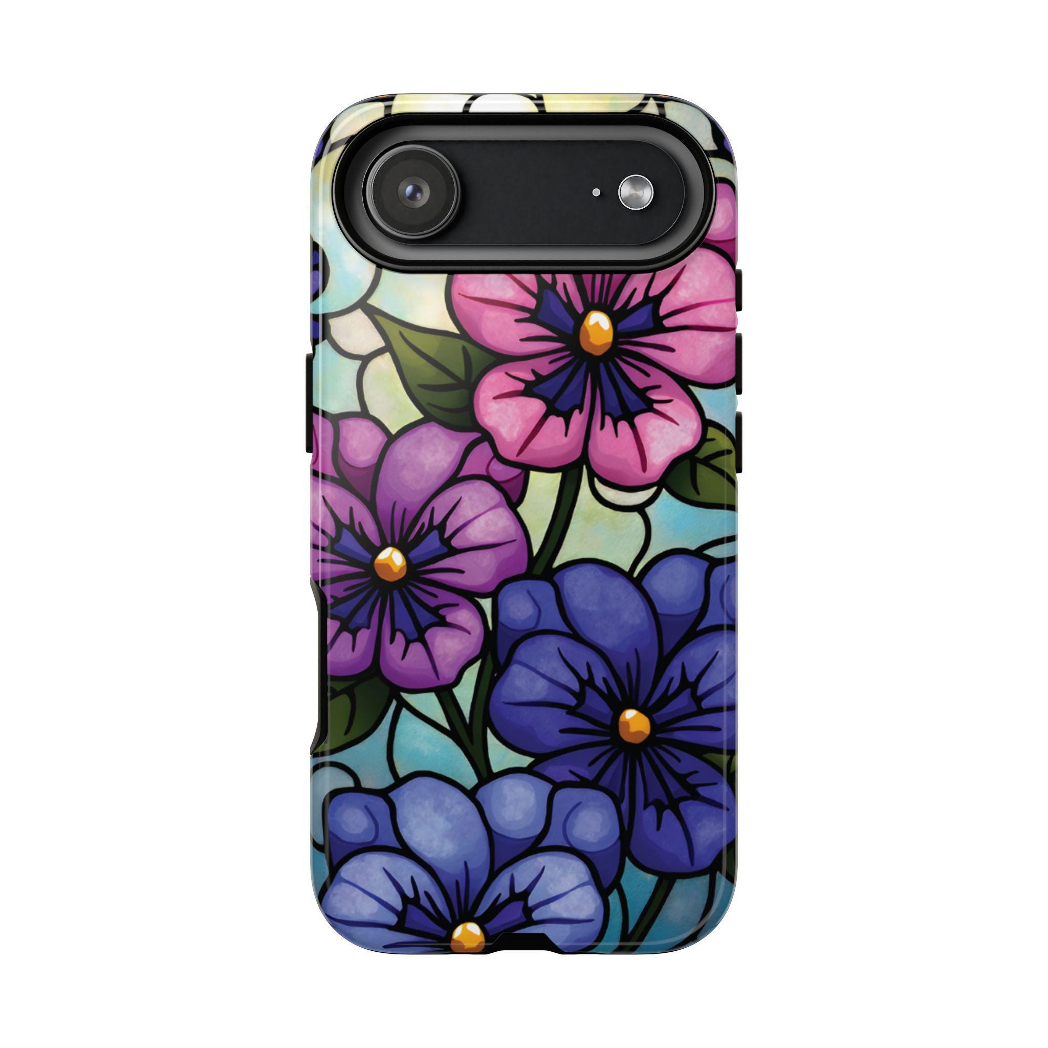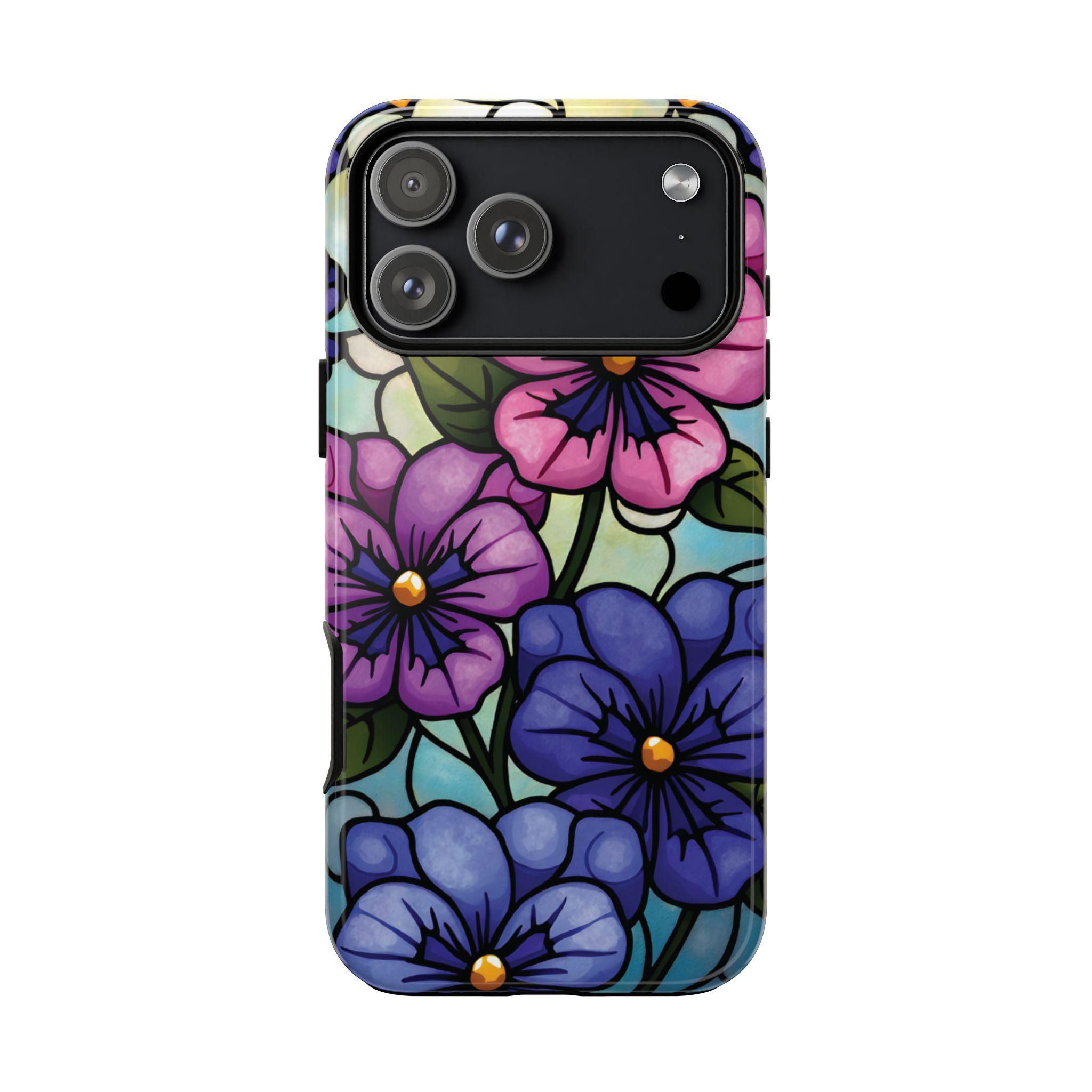 Pansies stained glass IPhone tough case. Introducing our vibrant phone case, designed to brighten your everyday life with stunning artwork. This product adds a cheerful and artistic touch to your phone, making it not just a protective accessory but also a statement piece. Perfect for nature lovers, this sturdy case is ideal for adults seeking both style and durability. Great for gifting during holidays like birthdays, Mother's Day, or any occasion where you want to bring a smile. Use it to enhance your daily routines, whether at work, school, or leisure activities, and enjoy the subconscious uplift that beautiful designs can bring to your life.