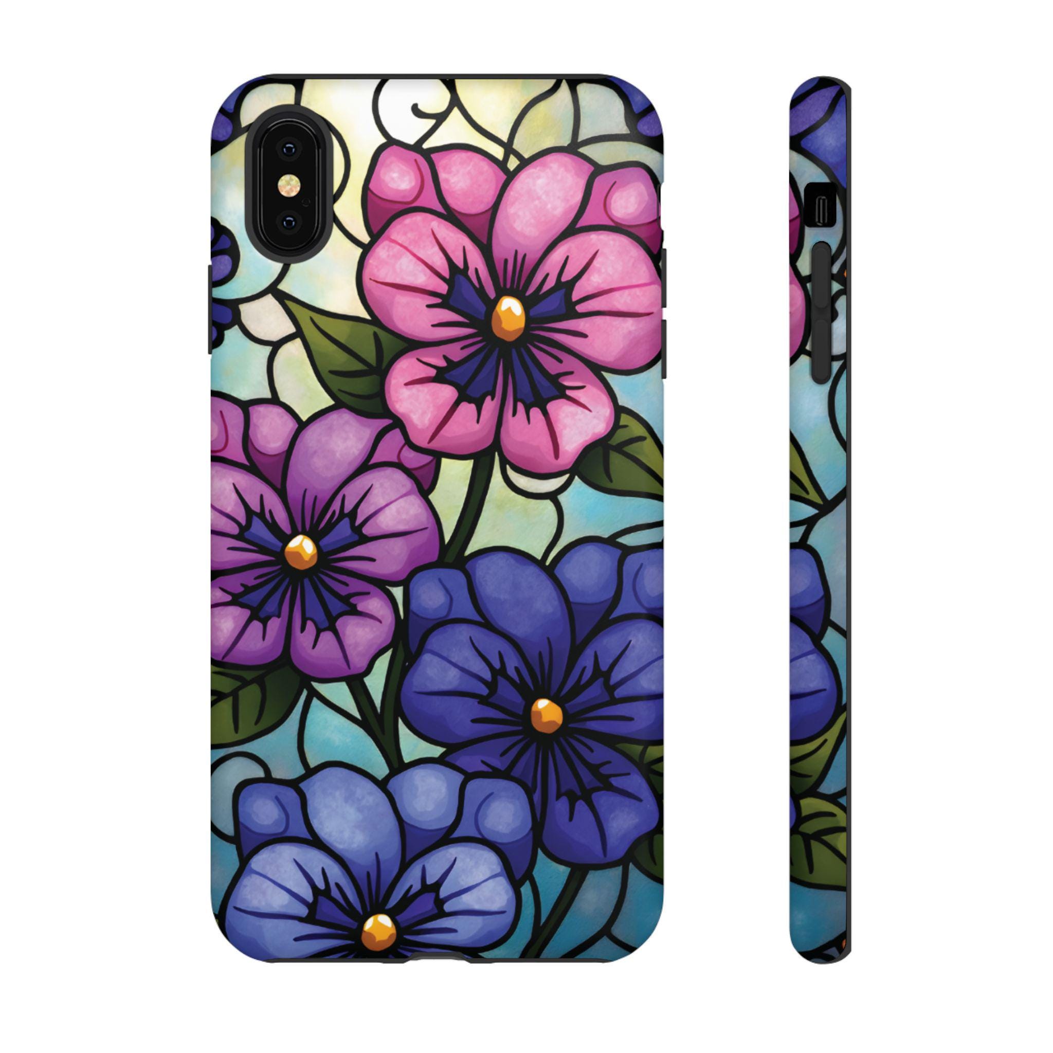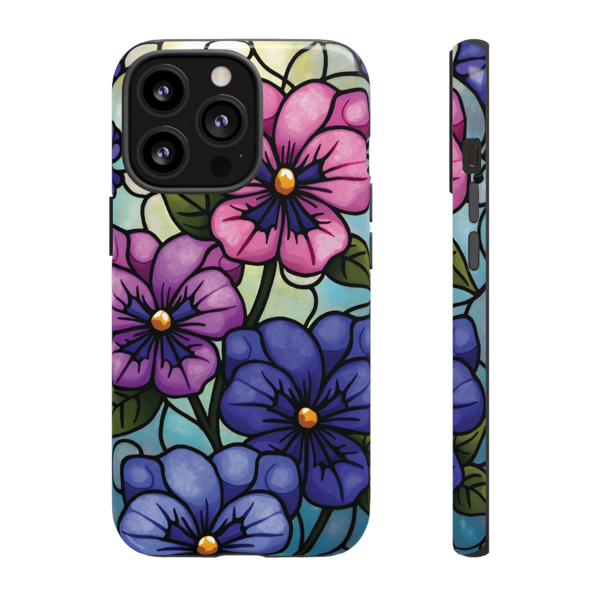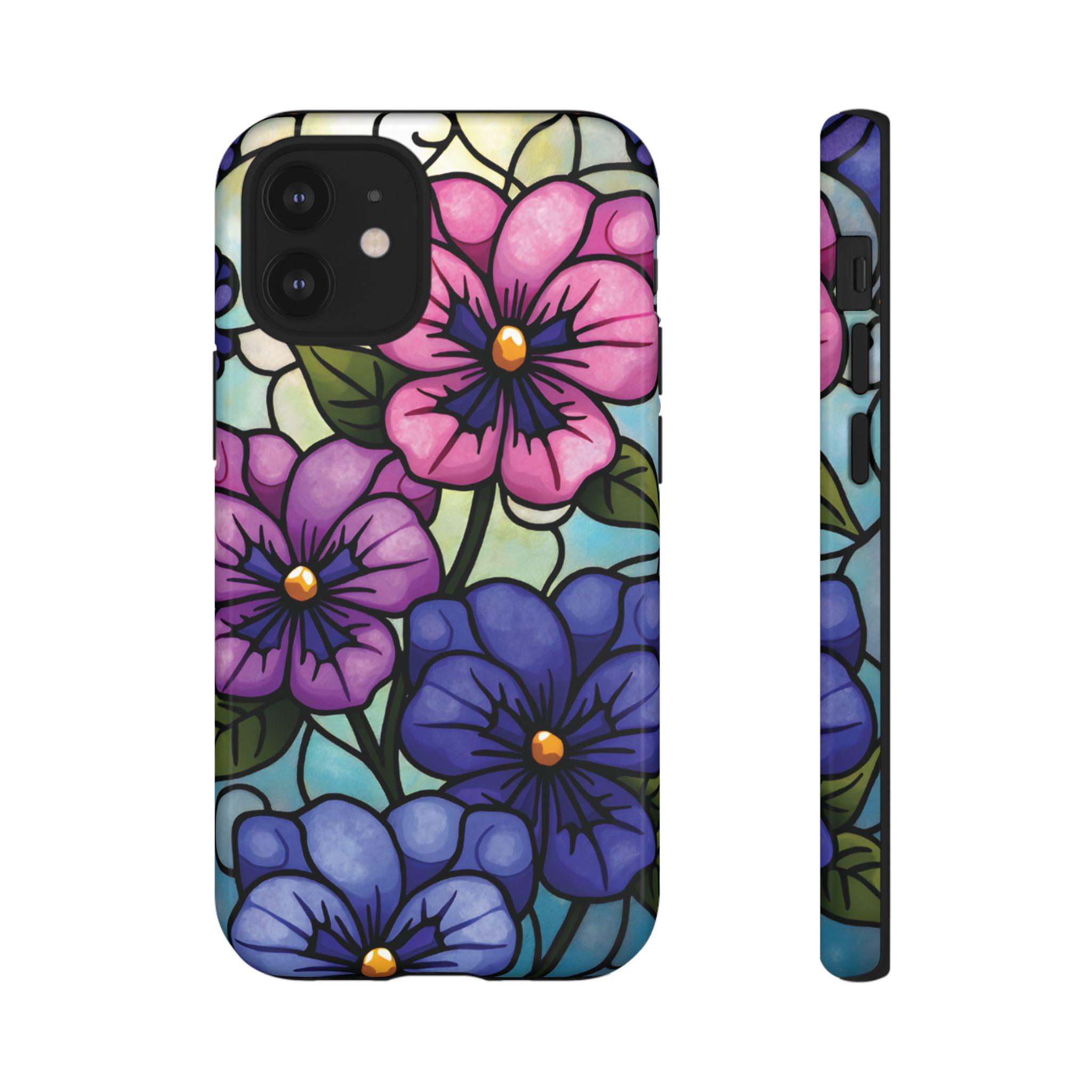 Pansies stained glass IPhone tough case. Introducing our vibrant phone case, designed to brighten your everyday life with stunning artwork. This product adds a cheerful and artistic touch to your phone, making it not just a protective accessory but also a statement piece. Perfect for nature lovers, this sturdy case is ideal for adults seeking both style and durability. Great for gifting during holidays like birthdays, Mother's Day, or any occasion where you want to bring a smile. Use it to enhance your daily routines, whether at work, school, or leisure activities, and enjoy the subconscious uplift that beautiful designs can bring to your life.