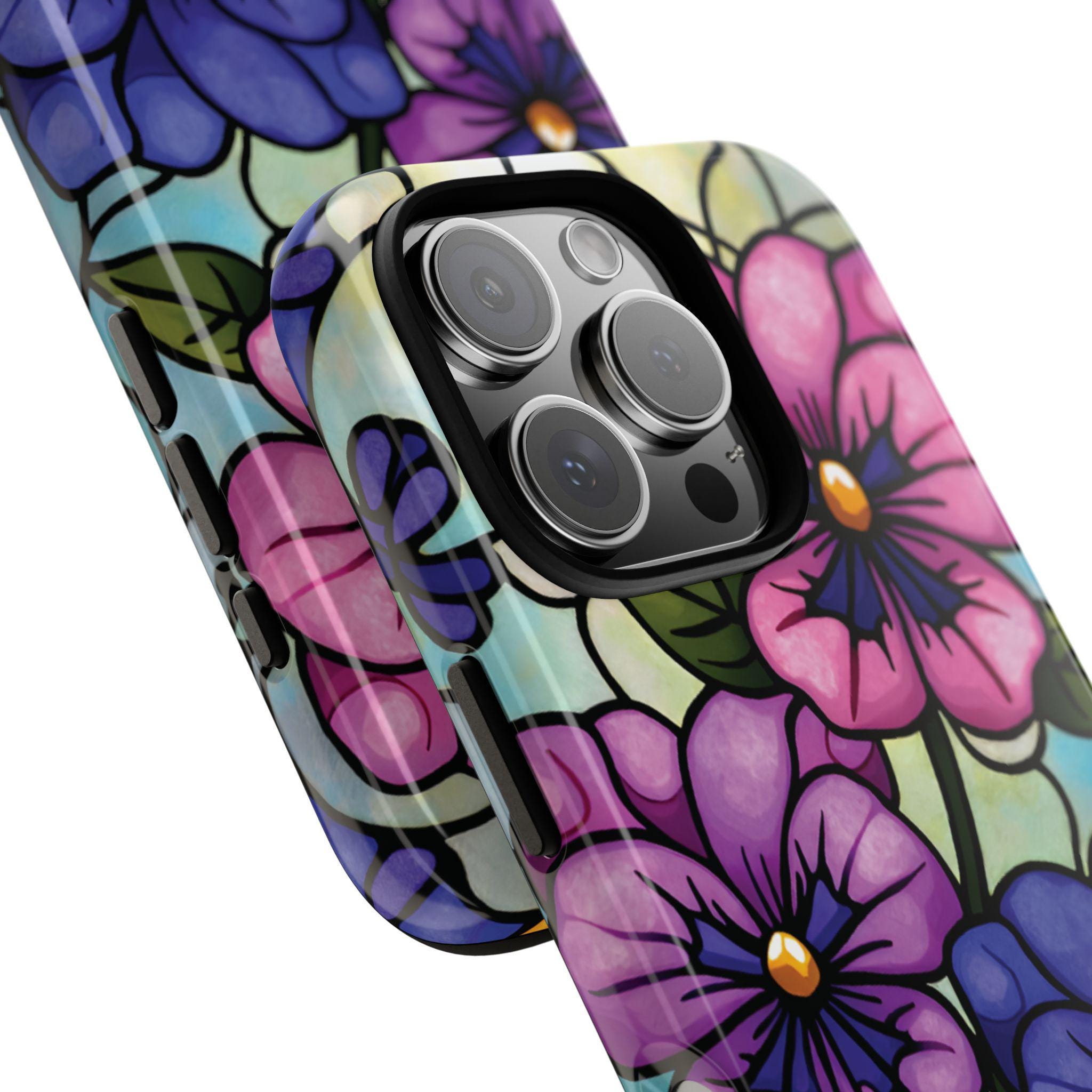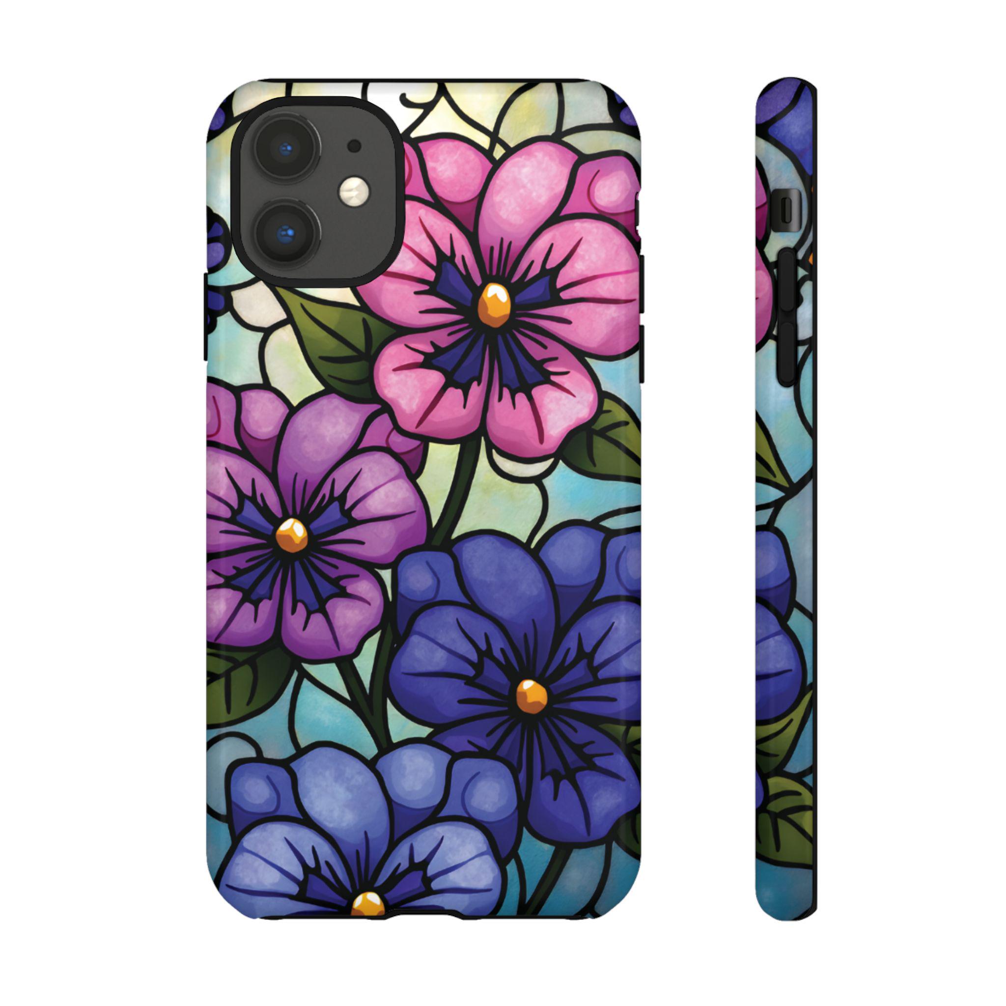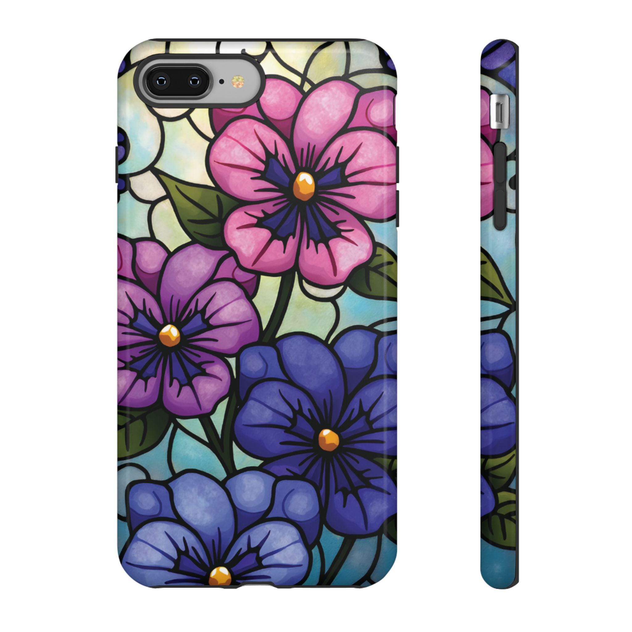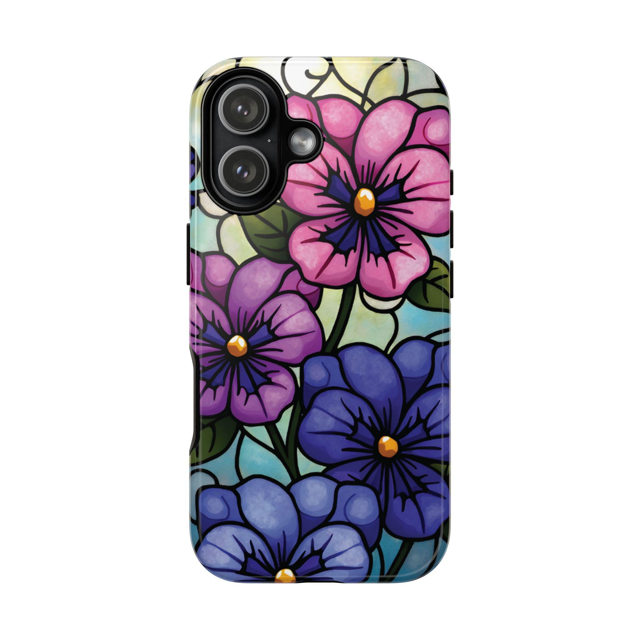 Pansies stained glass IPhone tough case. Introducing our vibrant phone case, designed to brighten your everyday life with stunning artwork. This product adds a cheerful and artistic touch to your phone, making it not just a protective accessory but also a statement piece. Perfect for nature lovers, this sturdy case is ideal for adults seeking both style and durability. Great for gifting during holidays like birthdays, Mother's Day, or any occasion where you want to bring a smile. Use it to enhance your daily routines, whether at work, school, or leisure activities, and enjoy the subconscious uplift that beautiful designs can bring to your life.