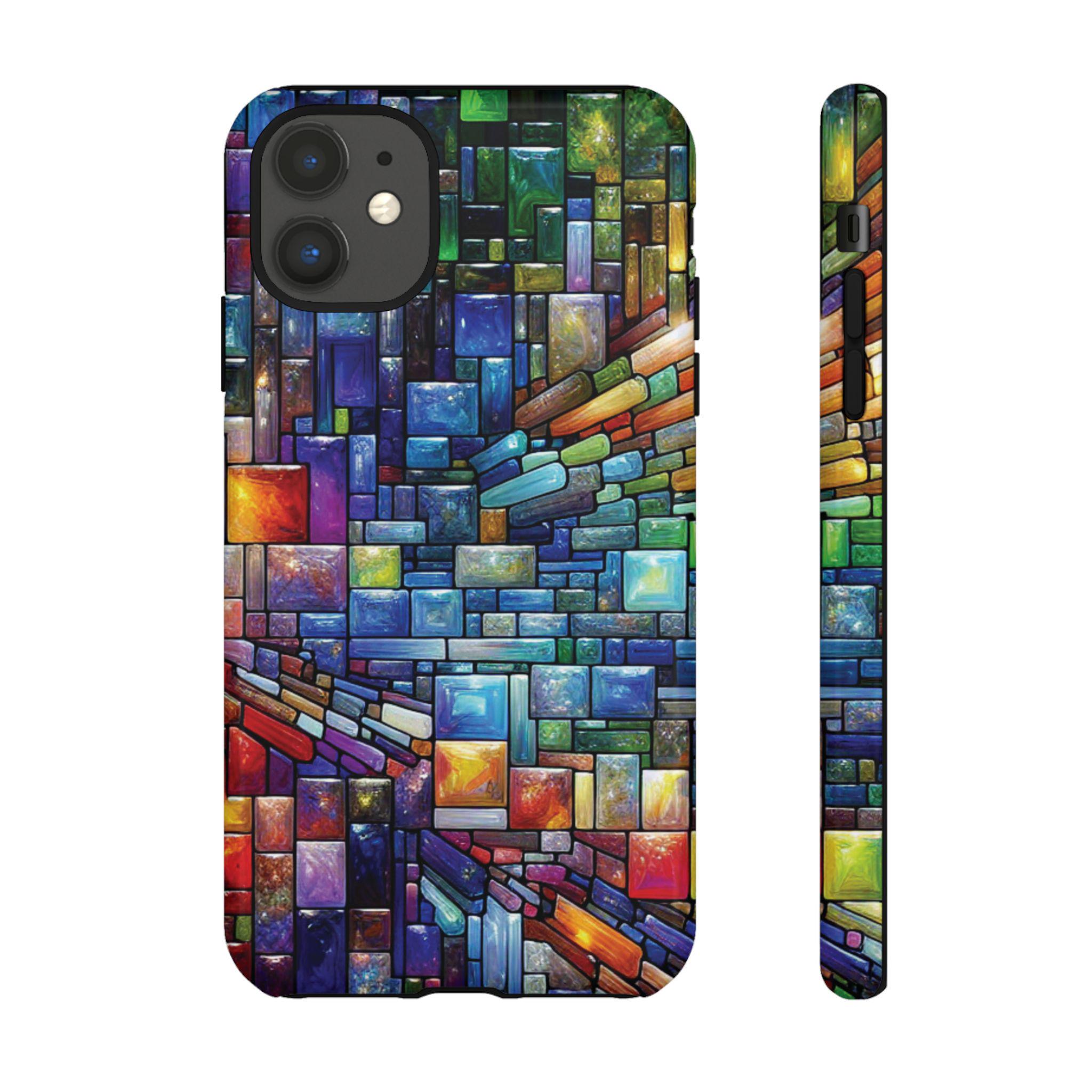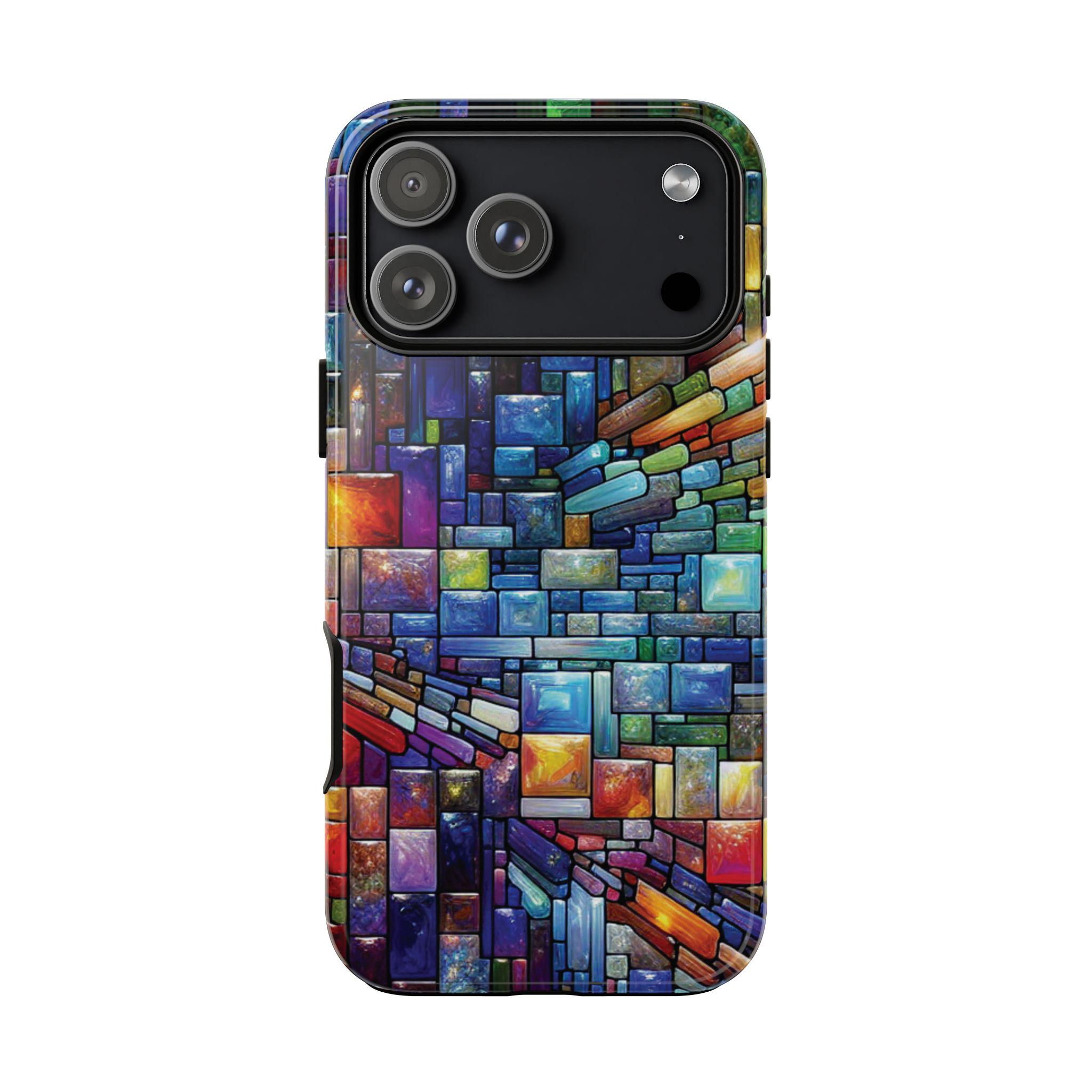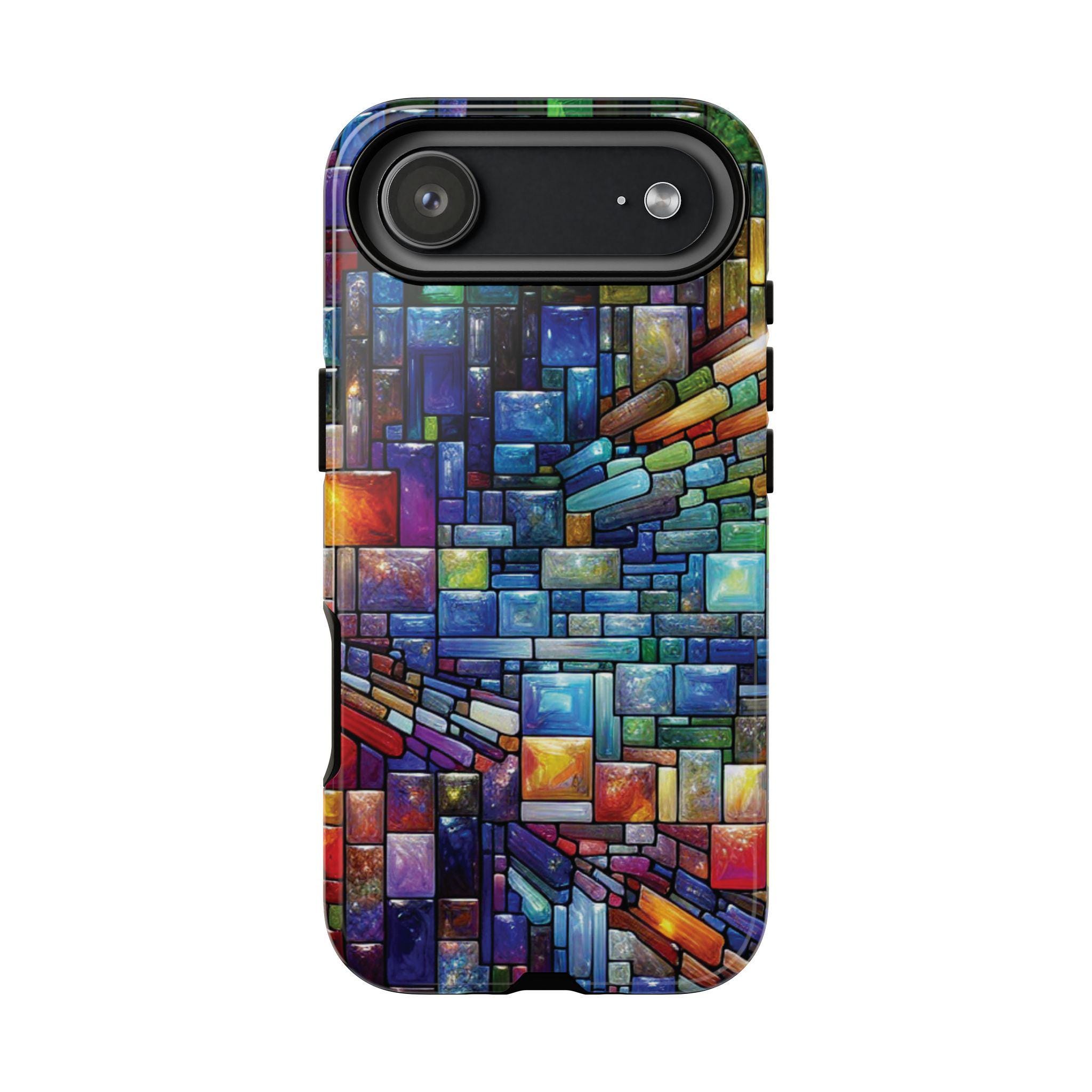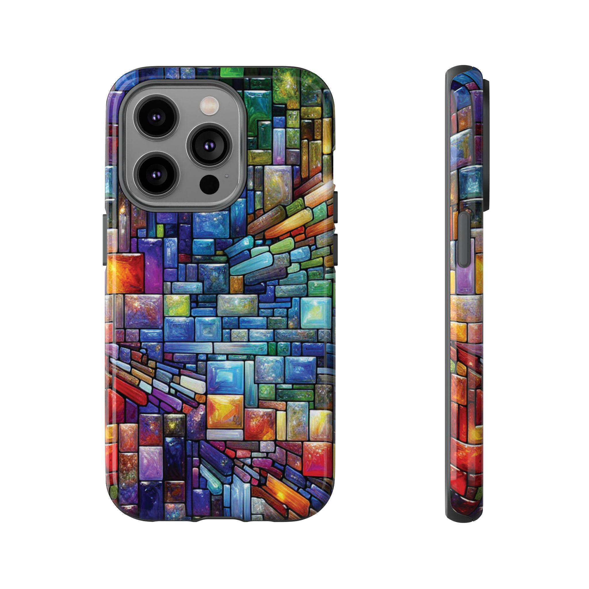 Vibrant stained glass square modaic IPhone tough case. Introducing our vibrant phone case, designed to brighten your everyday life with stunning artwork. This product adds a cheerful and artistic touch to your phone, making it not just a protective accessory but also a statement piece. This sturdy case is ideal for adults seeking both style and durability. Great for gifting during holidays like birthdays, Mother's Day, or any occasion where you want to bring a smile. Use it to enhance your daily routines, whether at work, school, or leisure activities, and enjoy the subconscious uplift that beautiful designs can bring to your life.