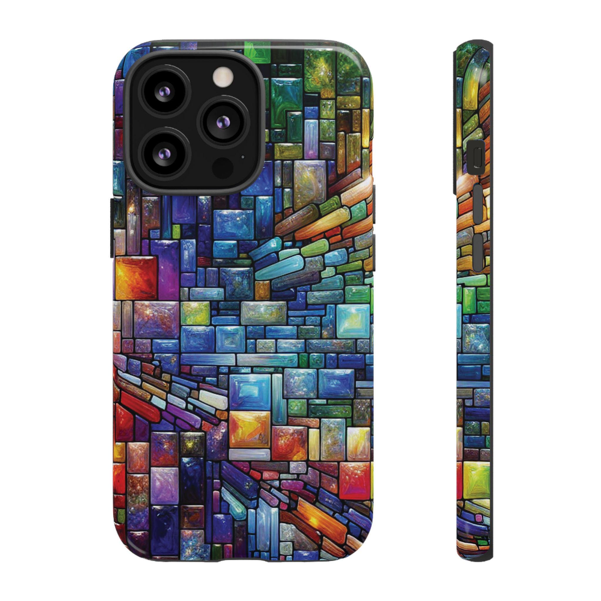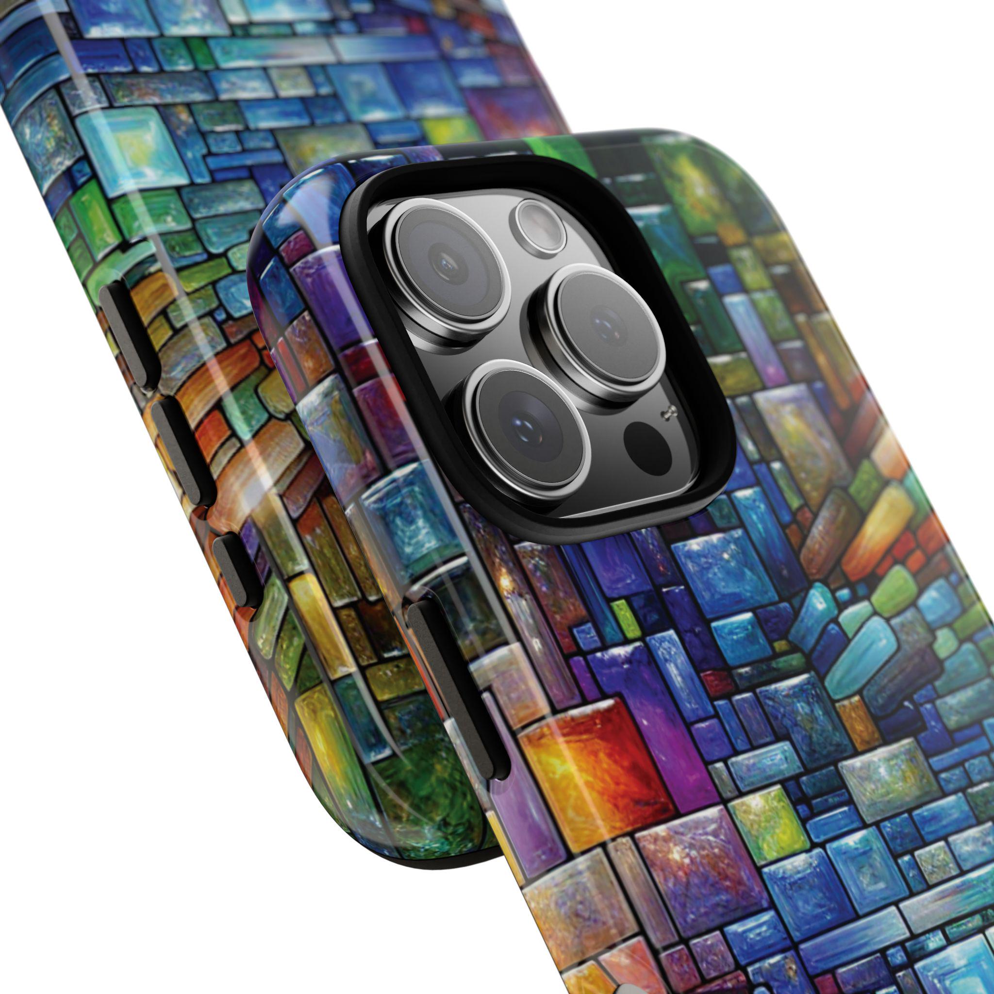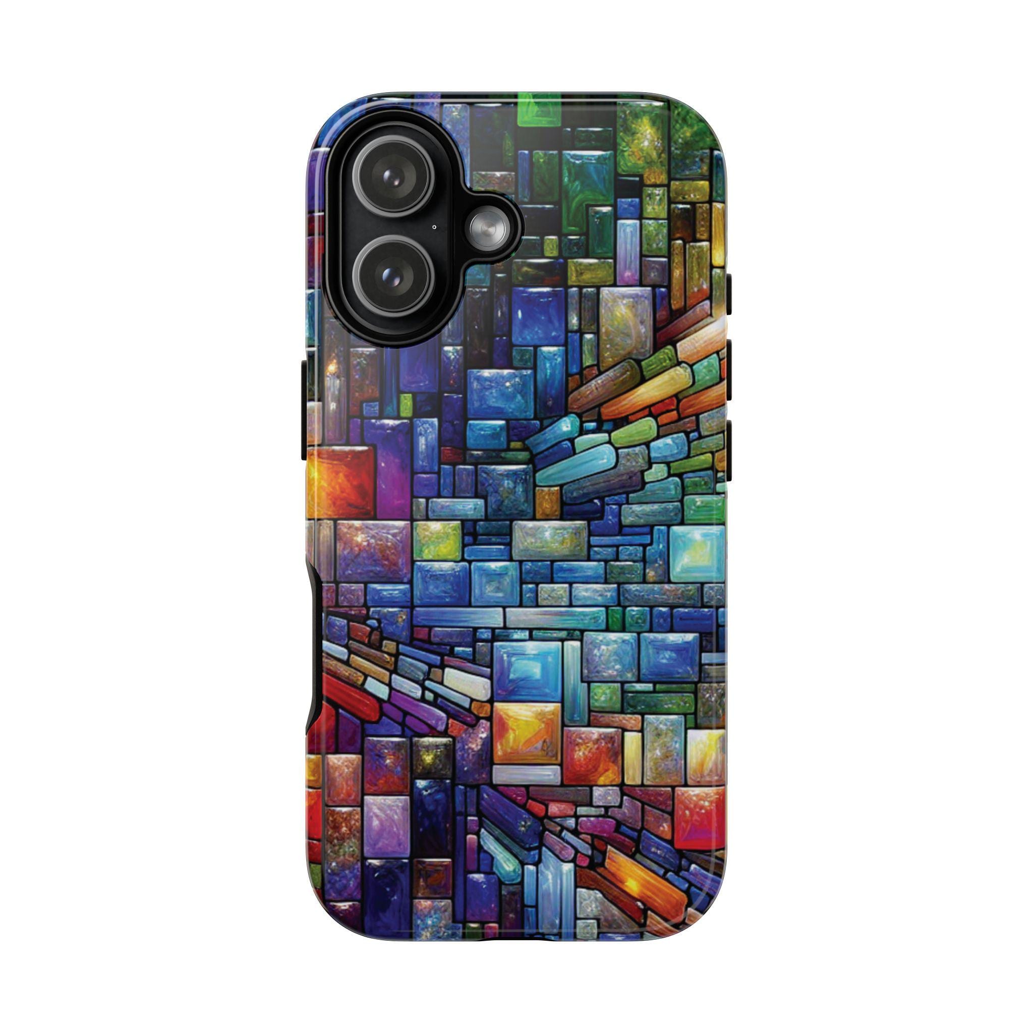 Vibrant stained glass square modaic IPhone tough case. Introducing our vibrant phone case, designed to brighten your everyday life with stunning artwork. This product adds a cheerful and artistic touch to your phone, making it not just a protective accessory but also a statement piece. This sturdy case is ideal for adults seeking both style and durability. Great for gifting during holidays like birthdays, Mother's Day, or any occasion where you want to bring a smile. Use it to enhance your daily routines, whether at work, school, or leisure activities, and enjoy the subconscious uplift that beautiful designs can bring to your life.