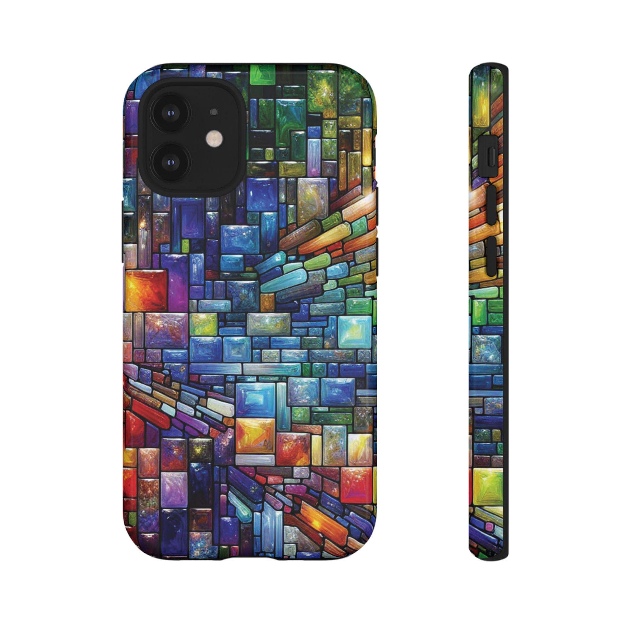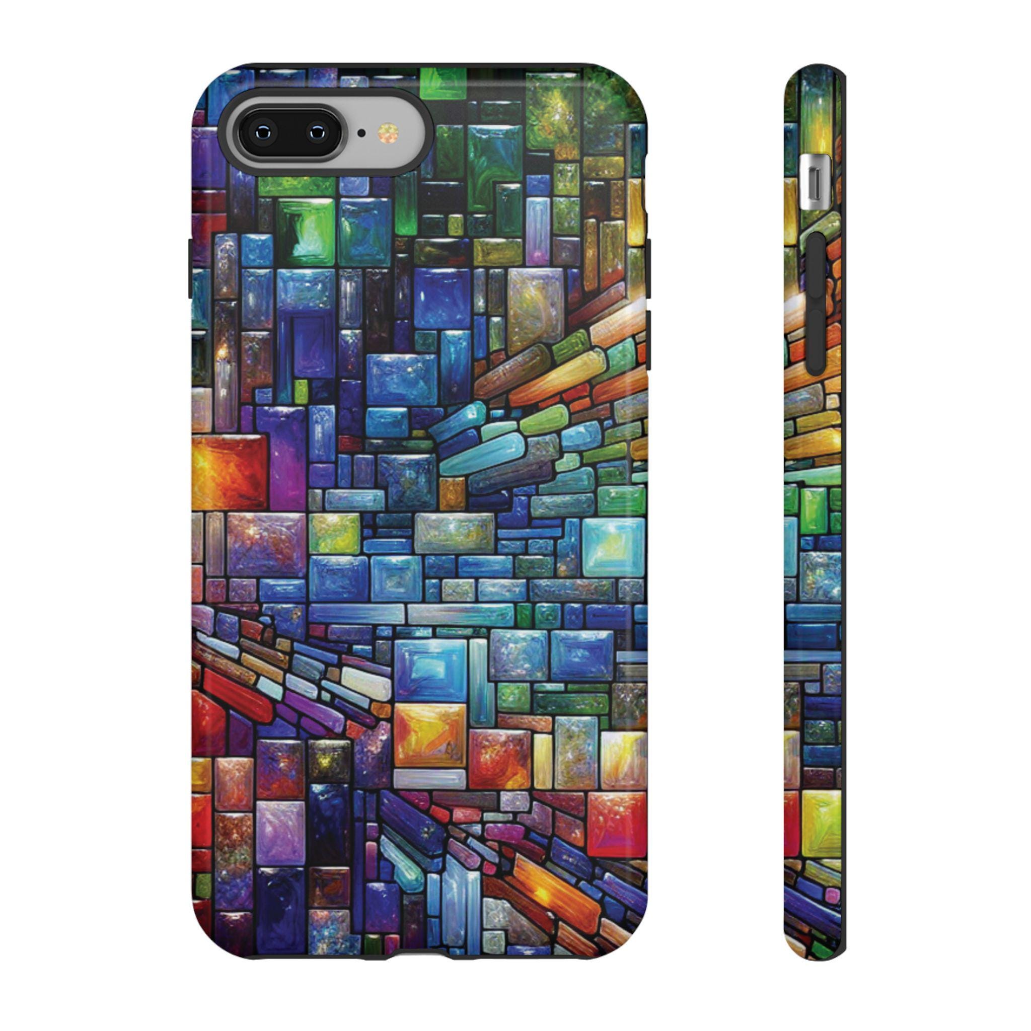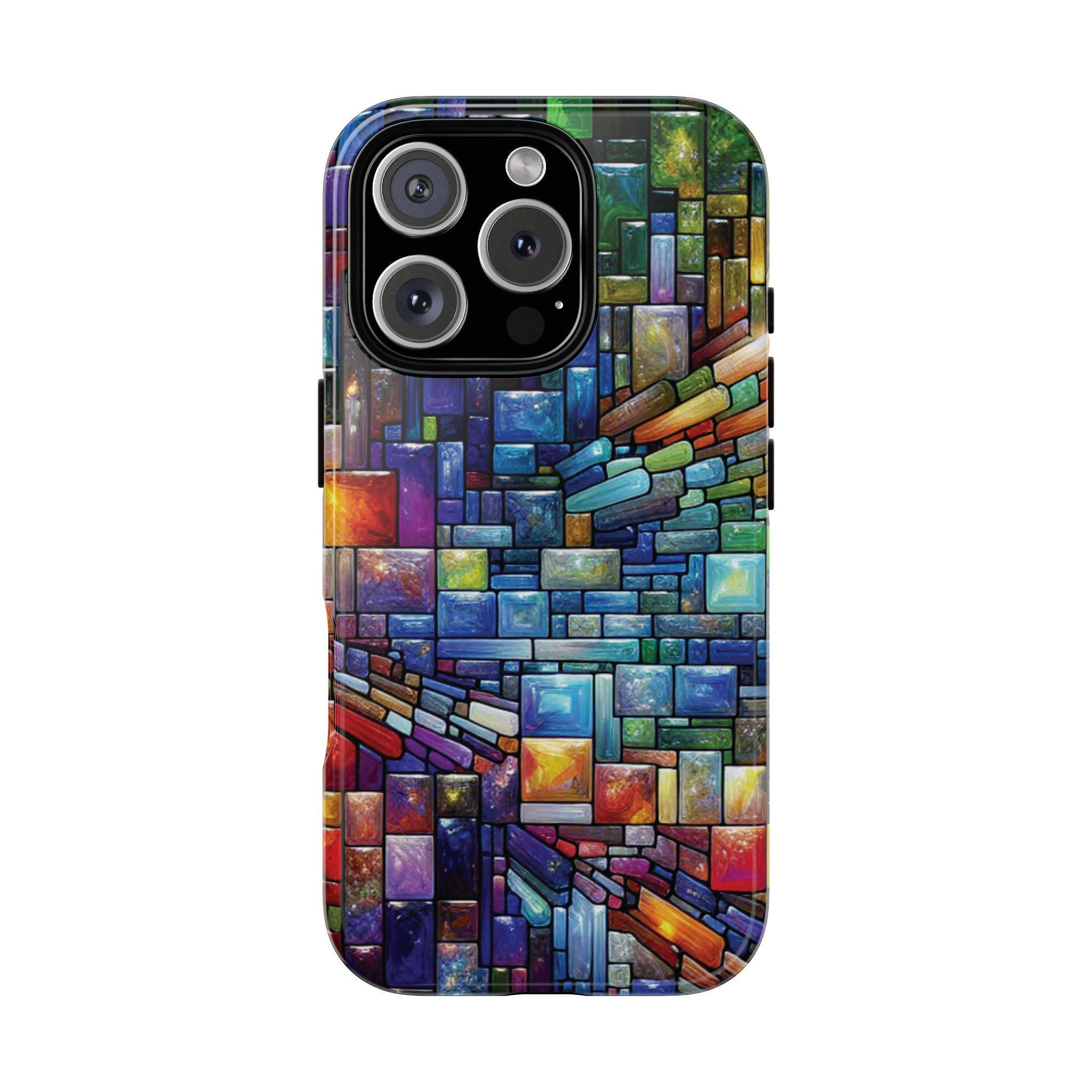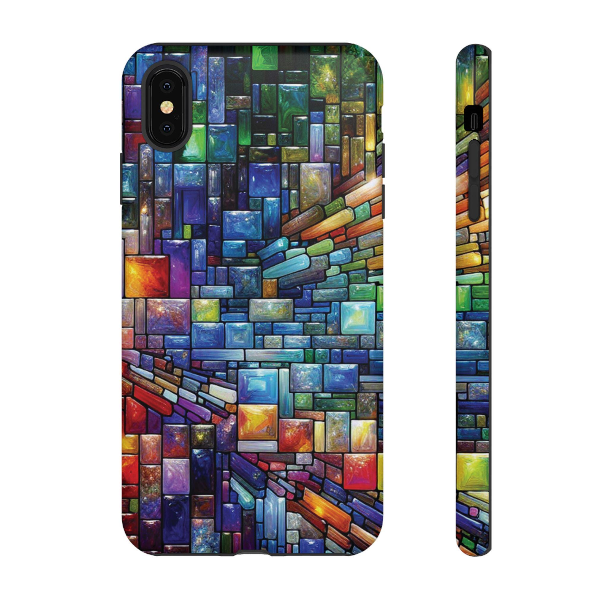 Vibrant stained glass square modaic IPhone tough case. Introducing our vibrant phone case, designed to brighten your everyday life with stunning artwork. This product adds a cheerful and artistic touch to your phone, making it not just a protective accessory but also a statement piece. This sturdy case is ideal for adults seeking both style and durability. Great for gifting during holidays like birthdays, Mother's Day, or any occasion where you want to bring a smile. Use it to enhance your daily routines, whether at work, school, or leisure activities, and enjoy the subconscious uplift that beautiful designs can bring to your life.