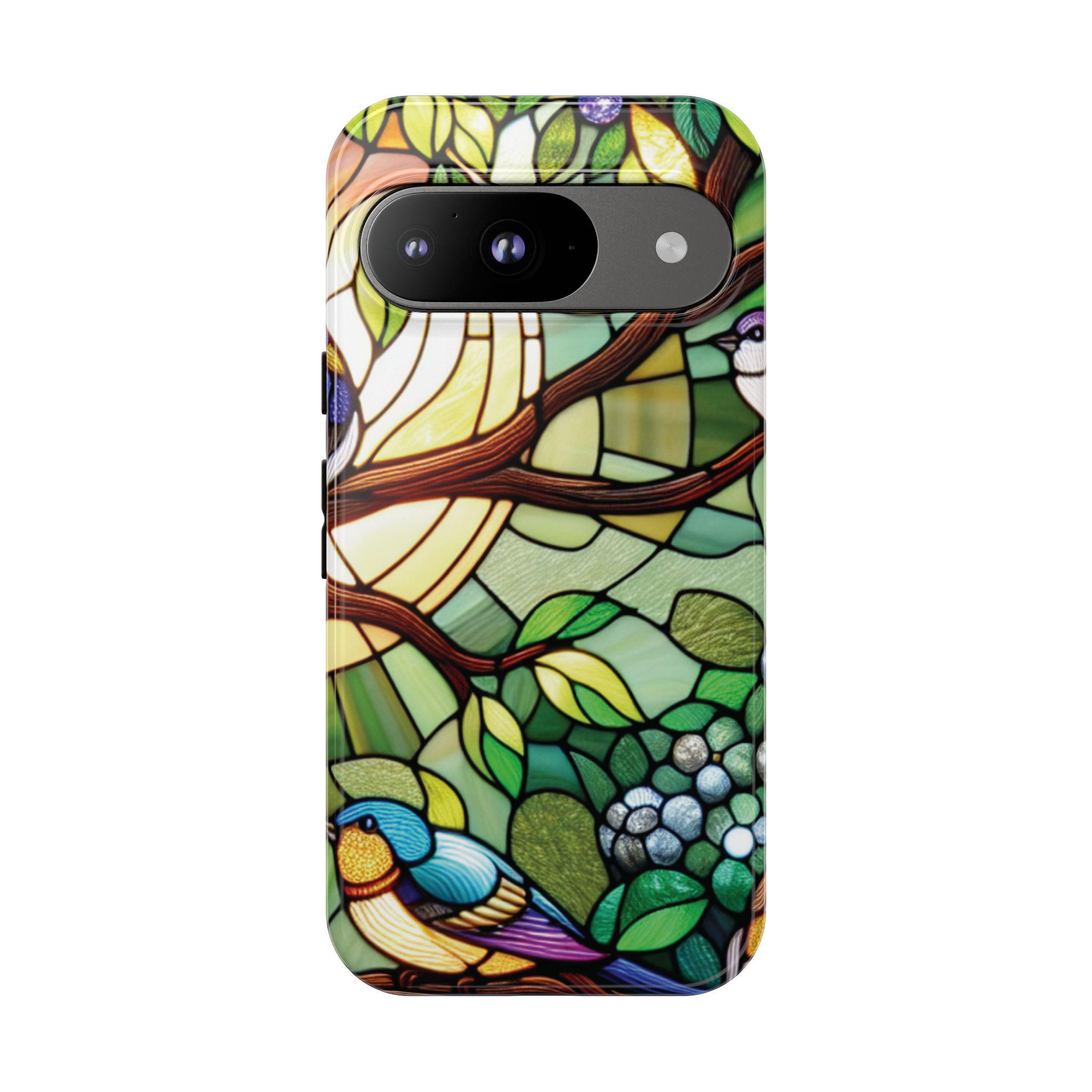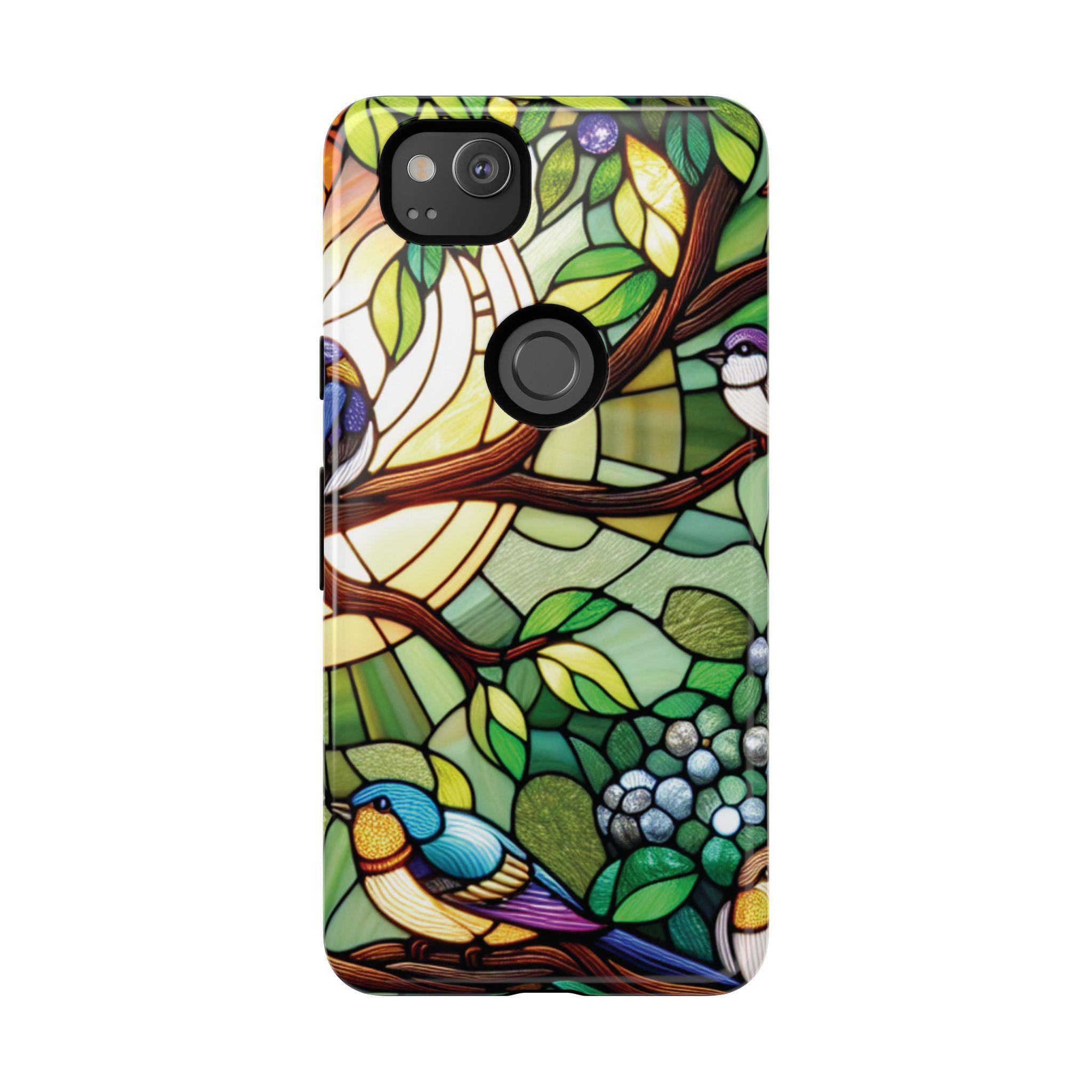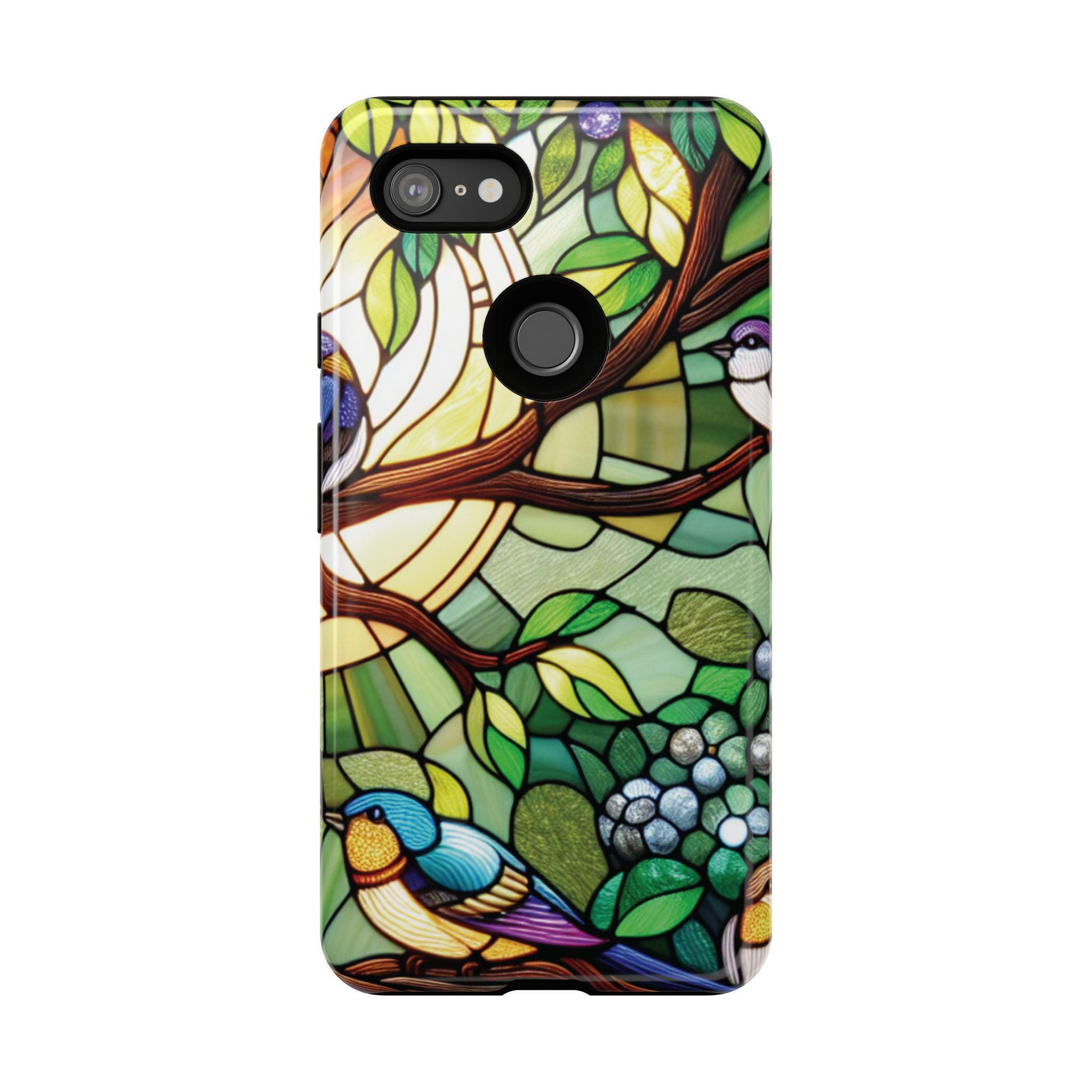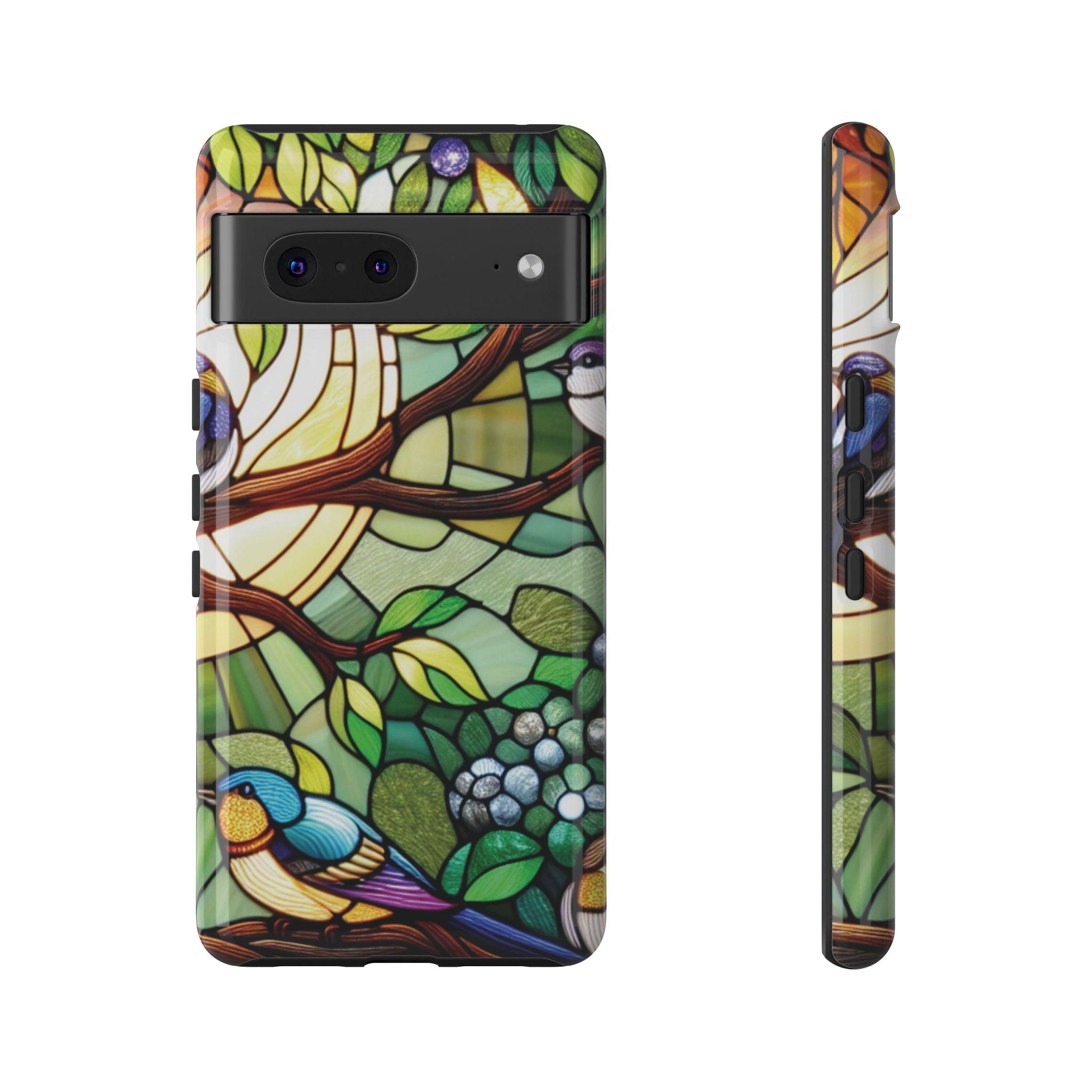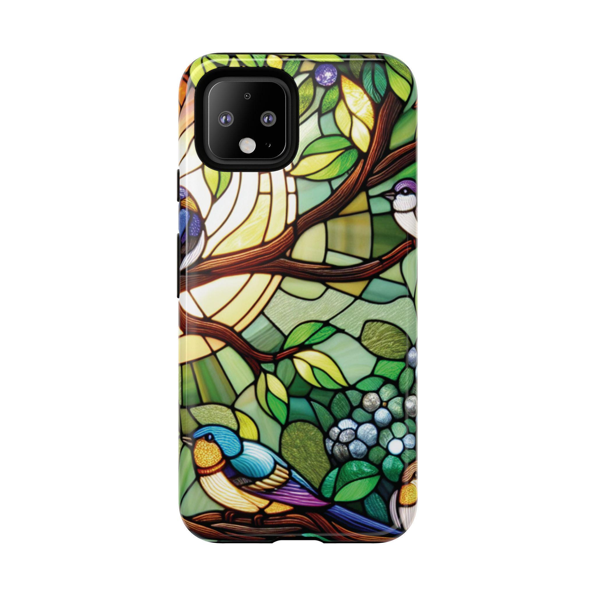 Birds in tree stained glass Google Pixel tough case. Introducing our vibrant phone case, designed to brighten your everyday life with stunning artwork. This product adds a cheerful and artistic touch to your phone, making it not just a protective accessory but also a statement piece. Perfect for nature lovers, this sturdy case is ideal for adults seeking both style and durability. Great for gifting during holidays like birthdays, Mother's Day, or any occasion where you want to bring a smile. Use it to enhance your daily routines, whether at work, school, or leisure activities, and enjoy the subconscious uplift that beautiful designs can bring to your life.