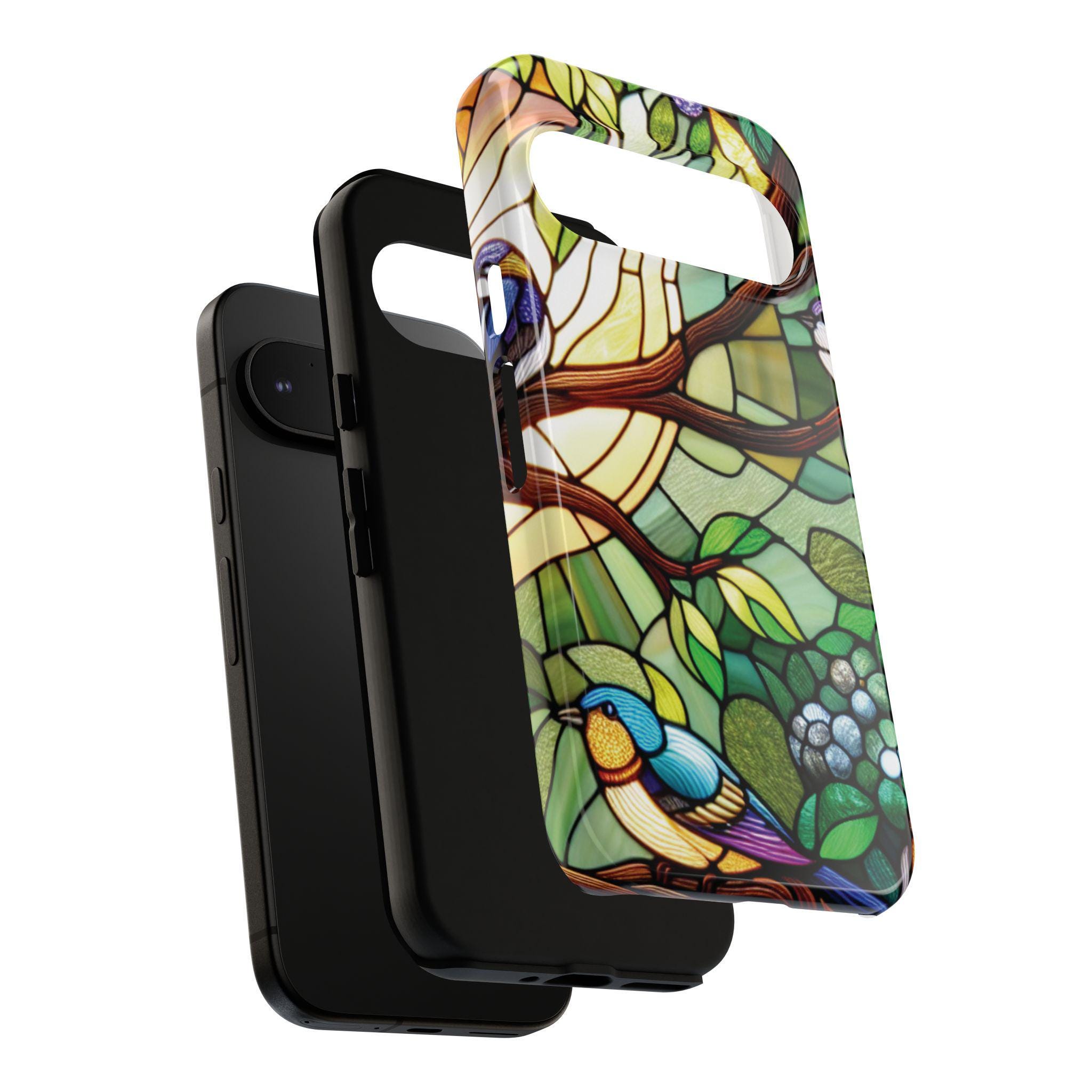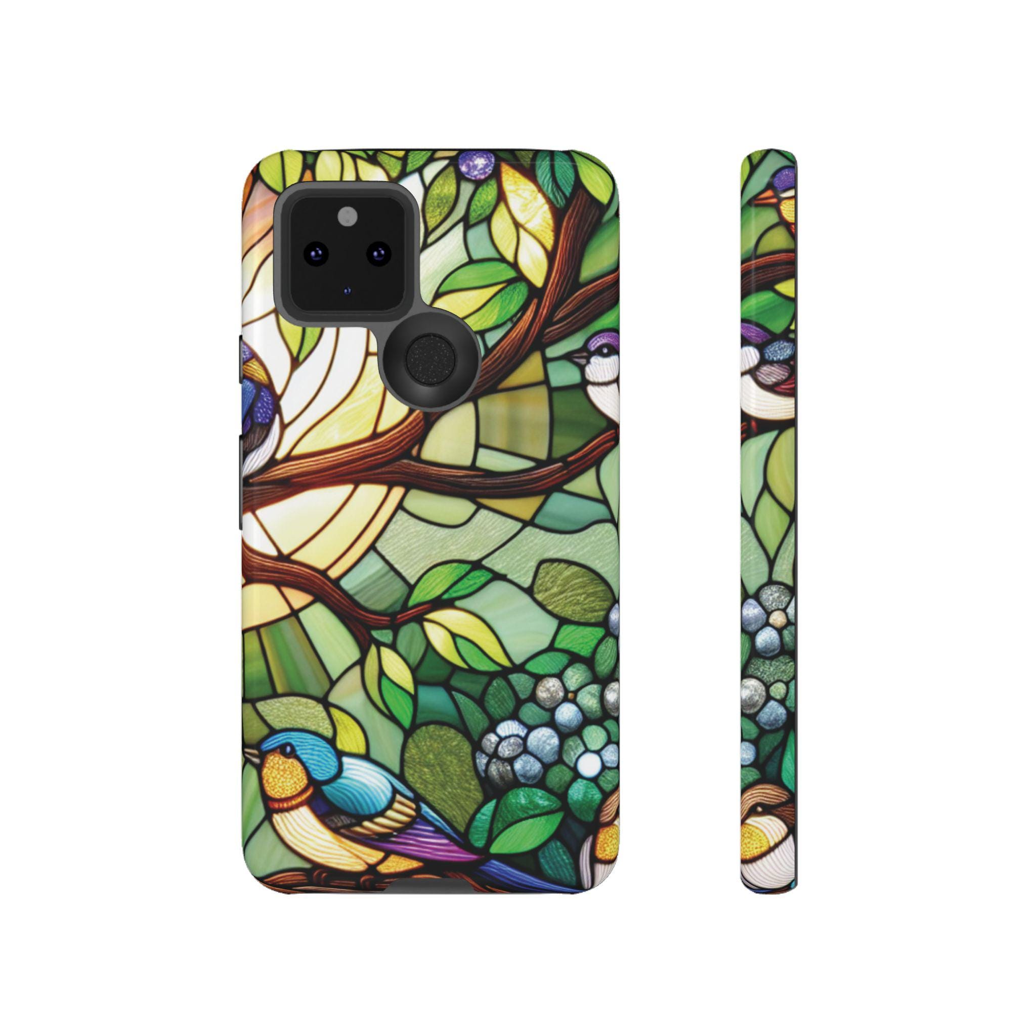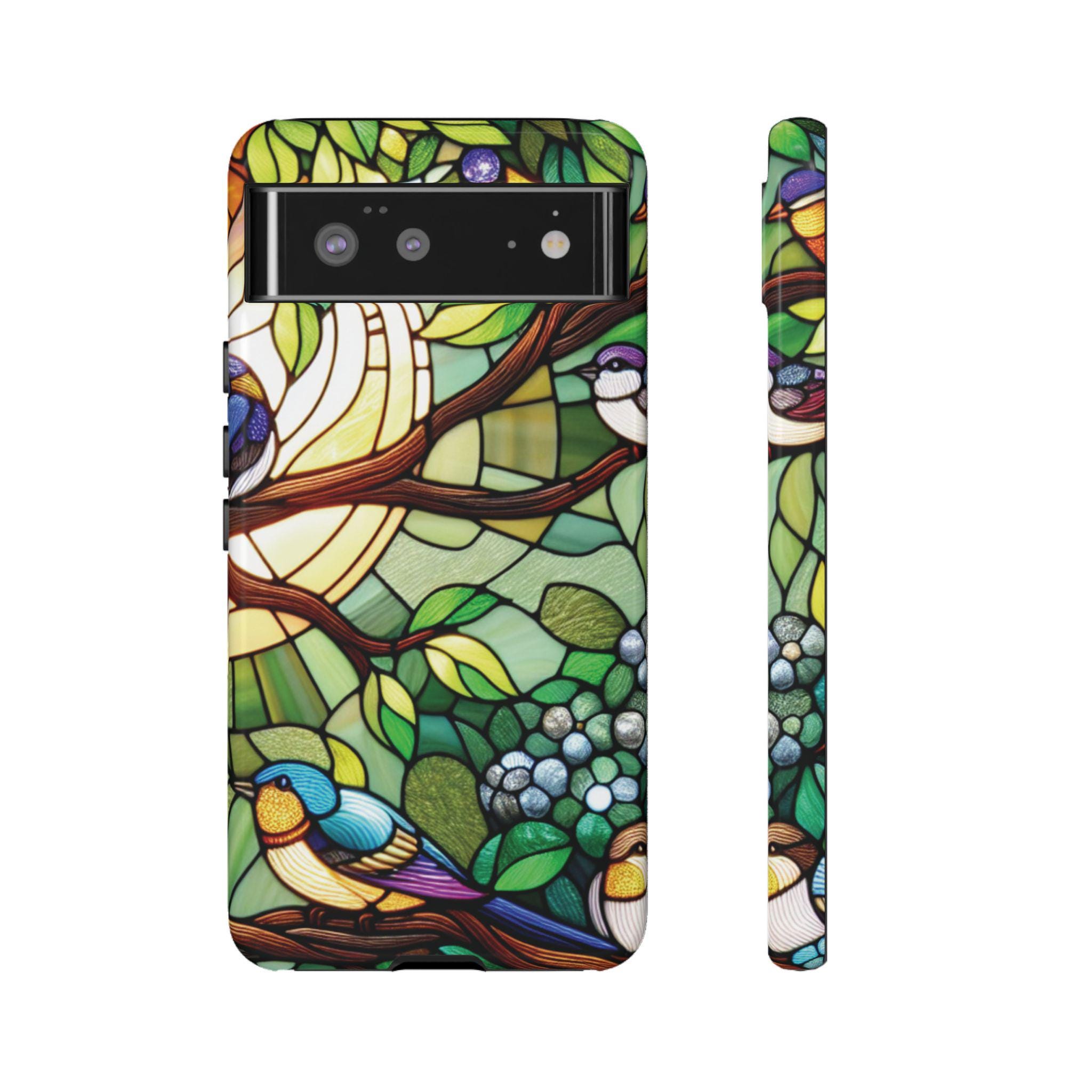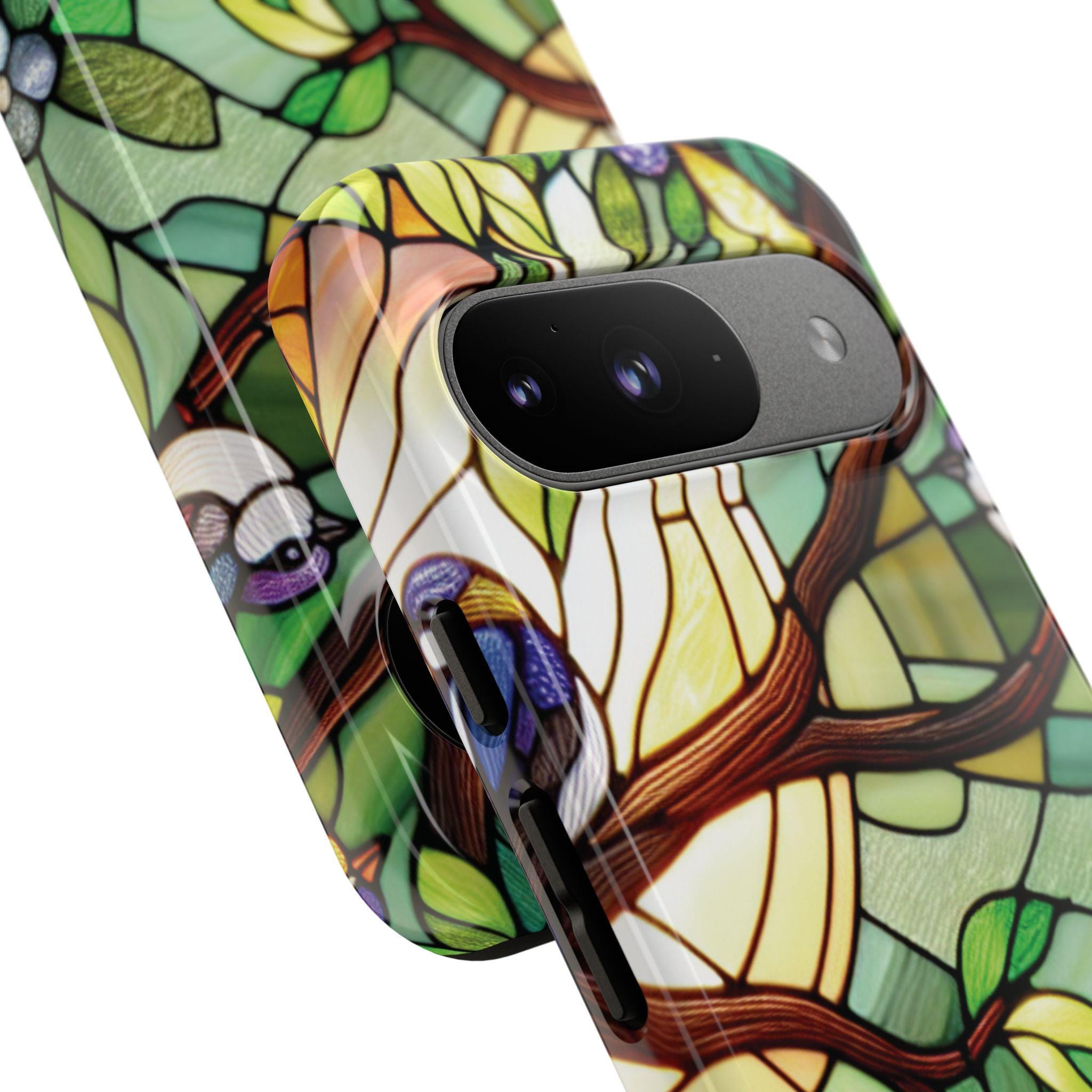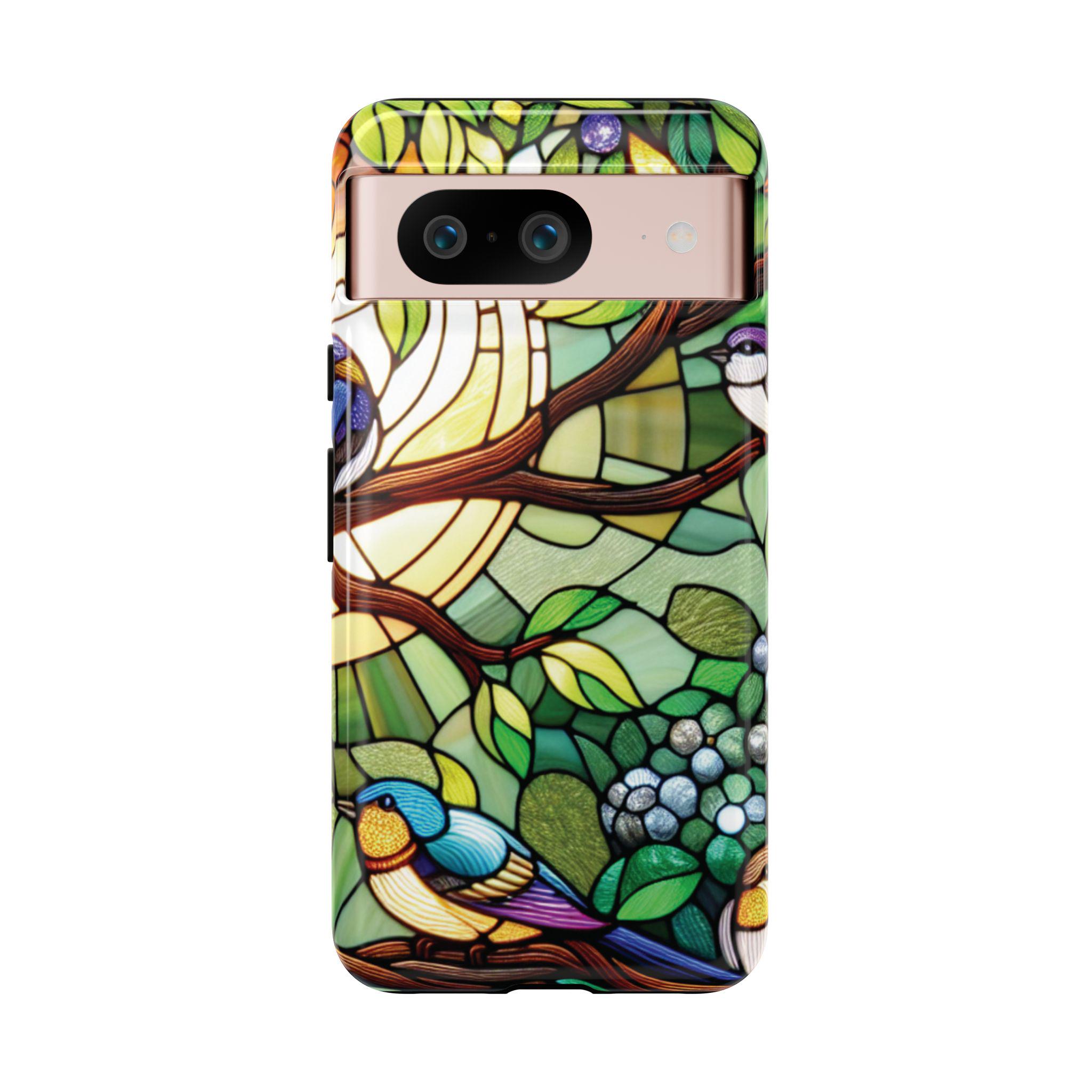 Birds in tree stained glass Google Pixel tough case. Introducing our vibrant phone case, designed to brighten your everyday life with stunning artwork. This product adds a cheerful and artistic touch to your phone, making it not just a protective accessory but also a statement piece. Perfect for nature lovers, this sturdy case is ideal for adults seeking both style and durability. Great for gifting during holidays like birthdays, Mother's Day, or any occasion where you want to bring a smile. Use it to enhance your daily routines, whether at work, school, or leisure activities, and enjoy the subconscious uplift that beautiful designs can bring to your life.