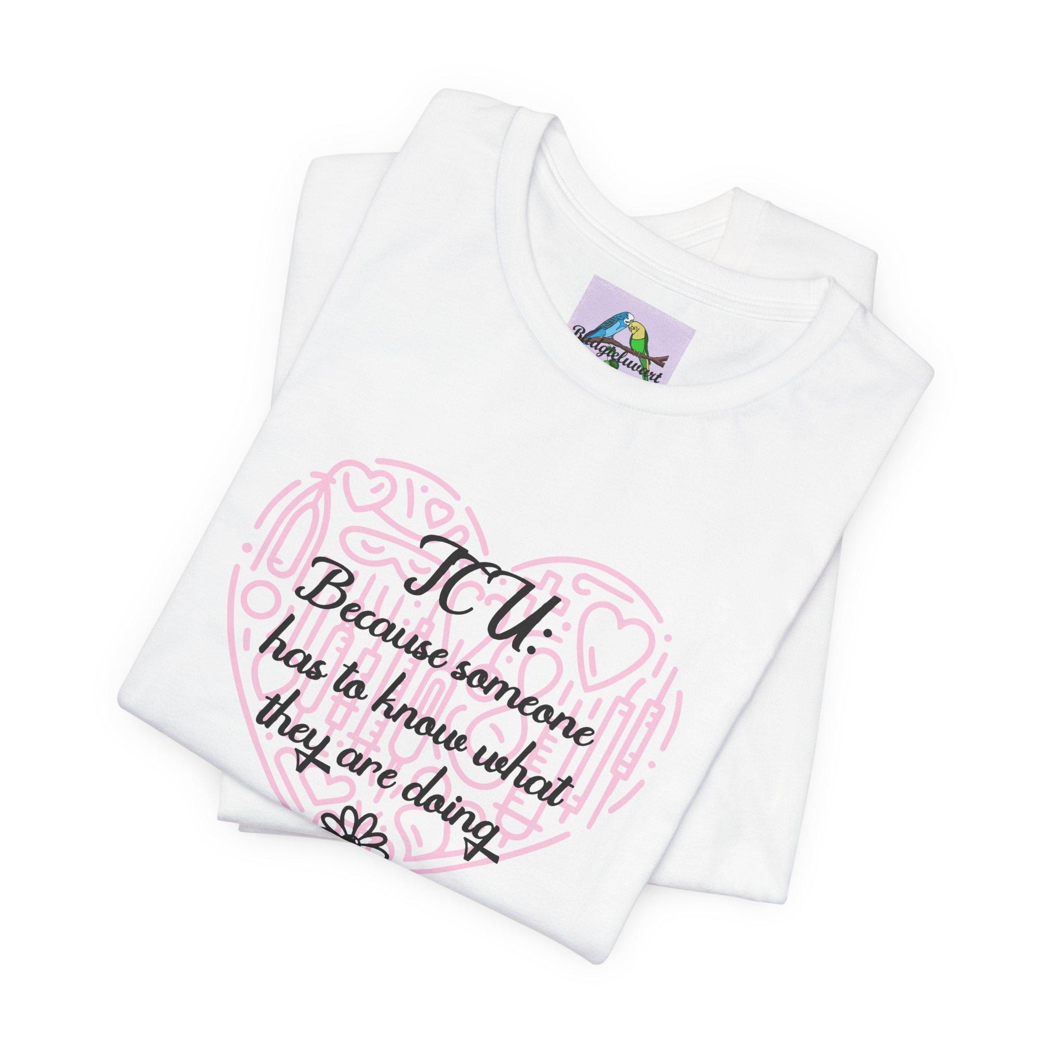 Funny ICU tee. Introducing our stylish and comfortable Unisex Jersey Short Sleeve Tee, perfect for anyone who values versatility in their wardrobe! This tee features a vibrant design that brings a refreshing vibe and adds a touch of personality to any outfit. Made from 100% Airlume combed and ring-spun cotton, it’s lightweight, breathable, and perfect for active lifestyles or relaxed weekends. Ideal for nurses, caregivers, and healthcare professionals, this shirt is a thoughtful gift for occasions like Nurses Week, birthdays, and holidays. Whether you're enjoying a casual day out or dressing up for a semi-formal event, this tee easily complements your personal style.