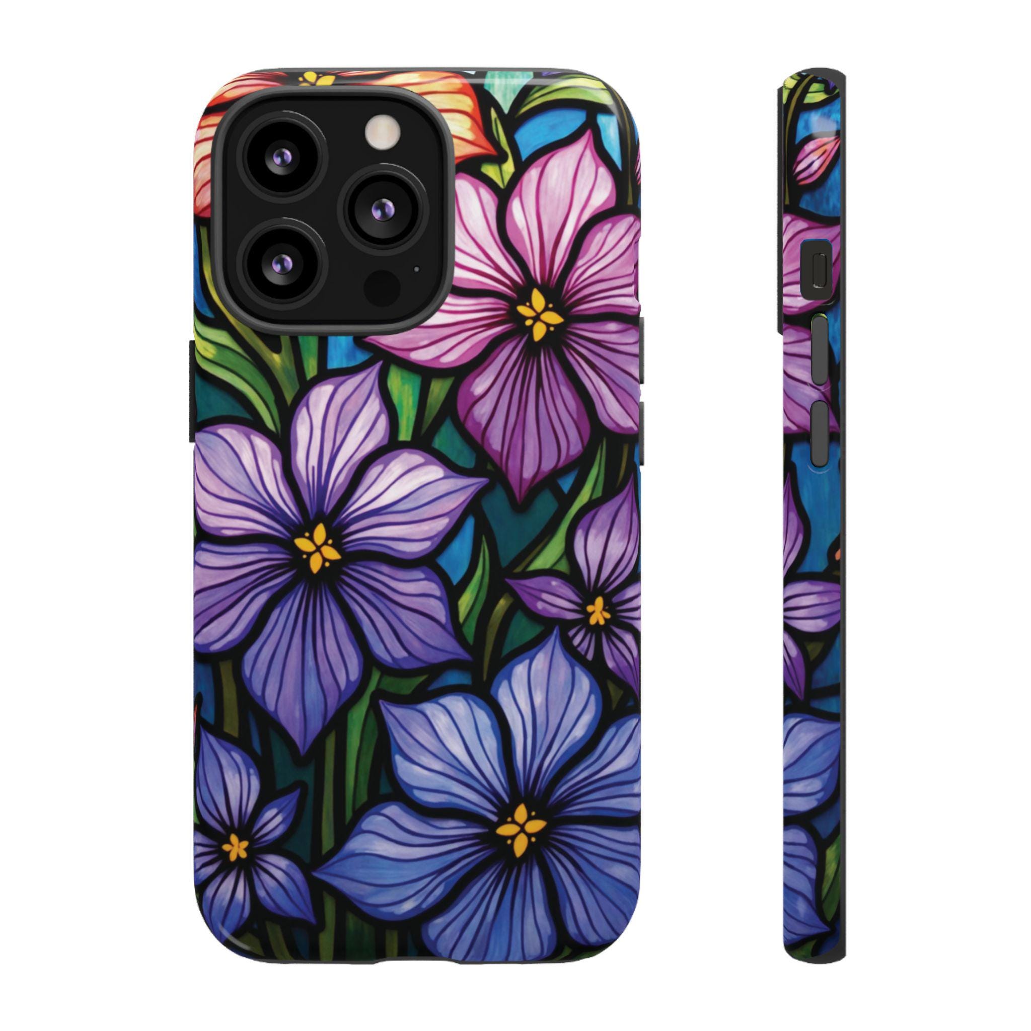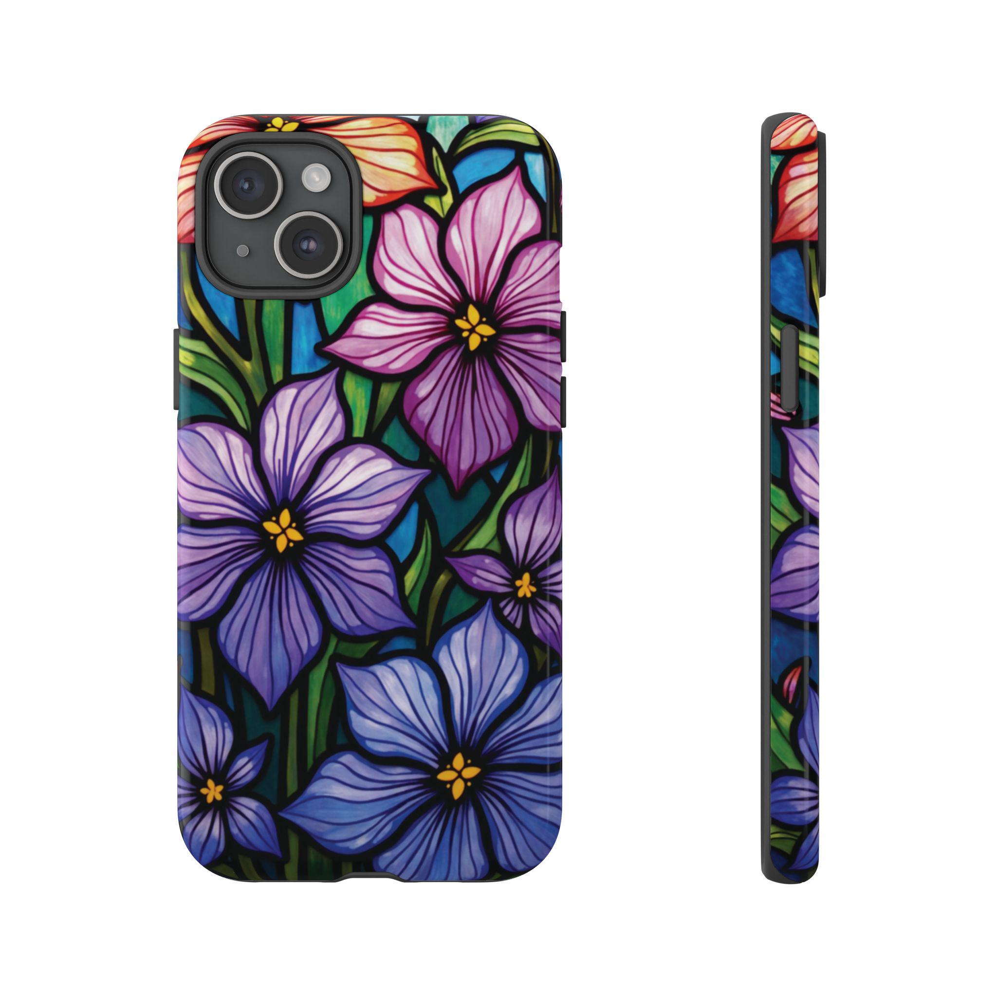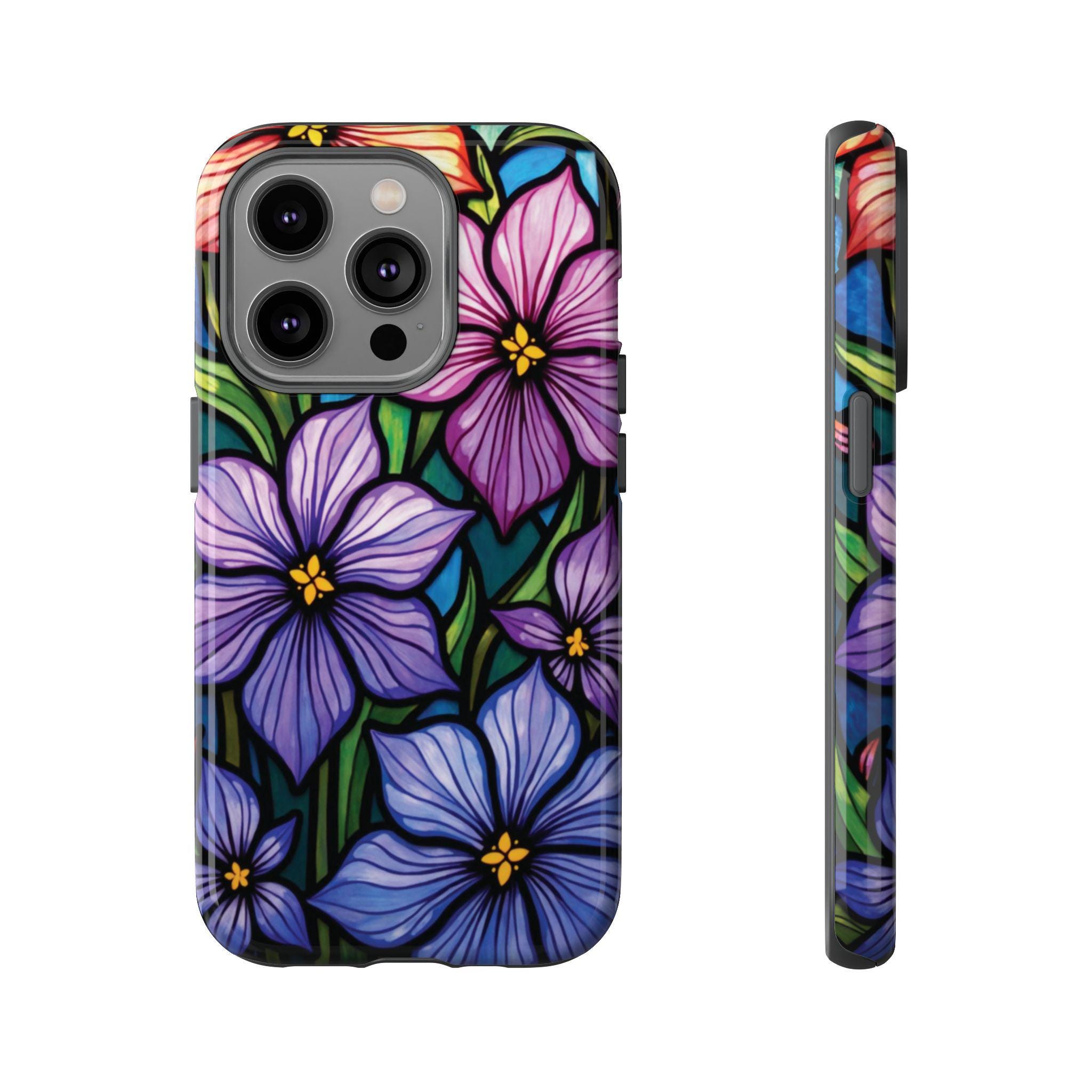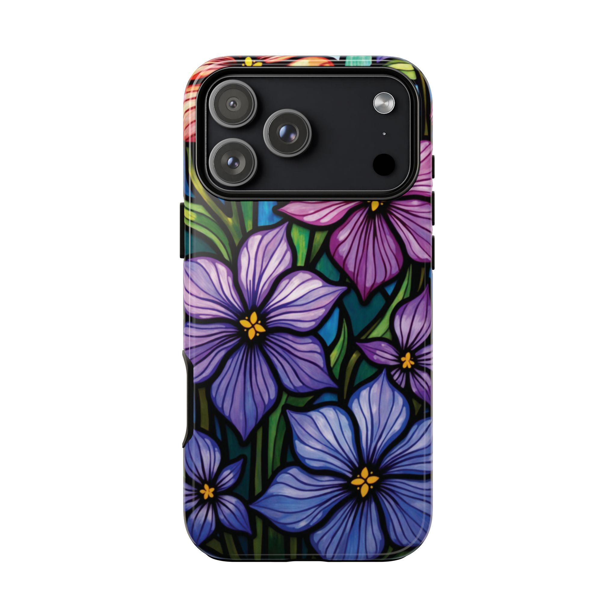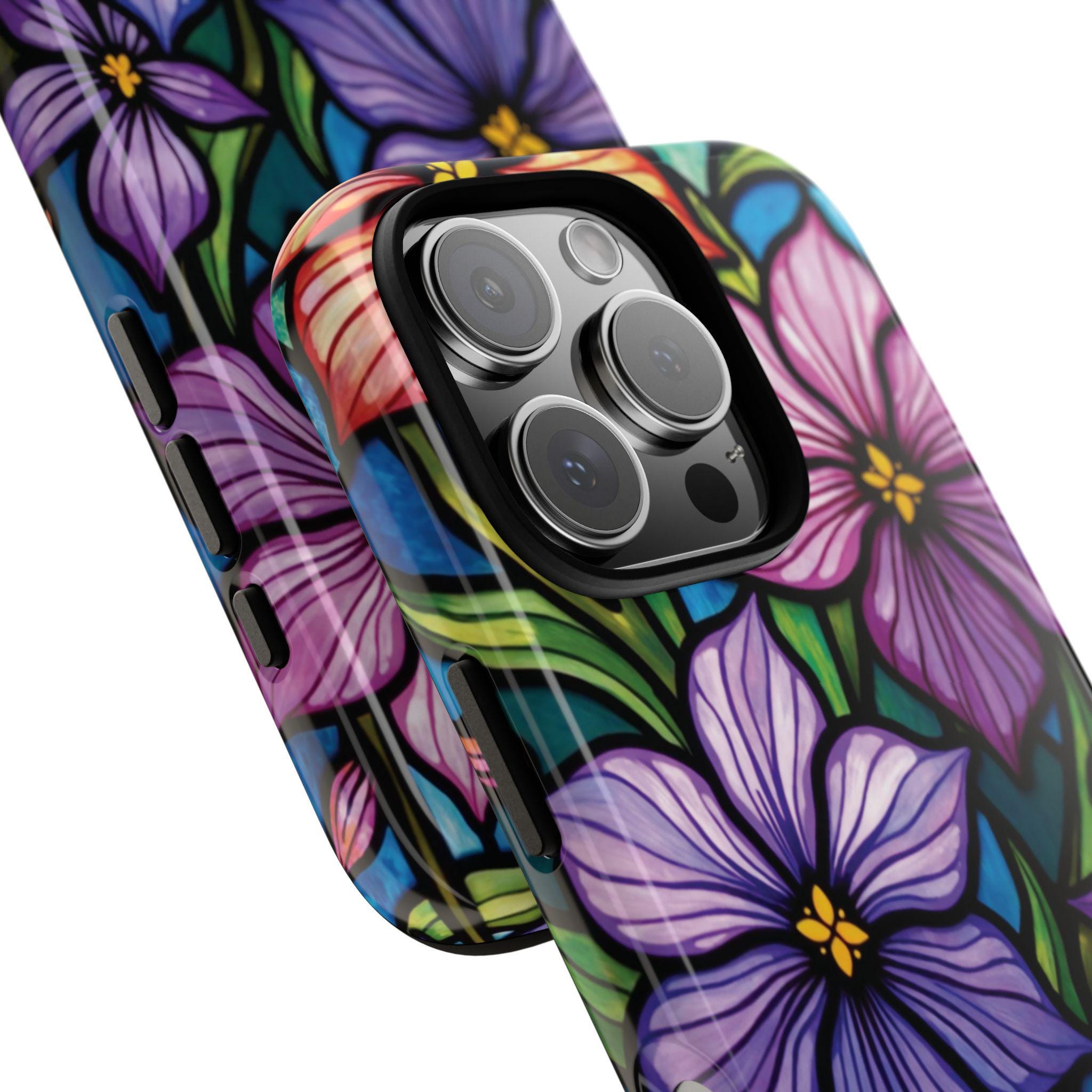 Violet stained glass IPhone tough case. Introducing our vibrant phone case, designed to brighten your everyday life with stunning artwork. This product adds a cheerful and artistic touch to your phone, making it not just a protective accessory but also a statement piece. Perfect for nature lovers, this sturdy case is ideal for adults seeking both style and durability. Great for gifting during holidays like birthdays, Mother's Day, or any occasion where you want to bring a smile. Use it to enhance your daily routines, whether at work, school, or leisure activities, and enjoy the subconscious uplift that beautiful designs can bring to your life.
