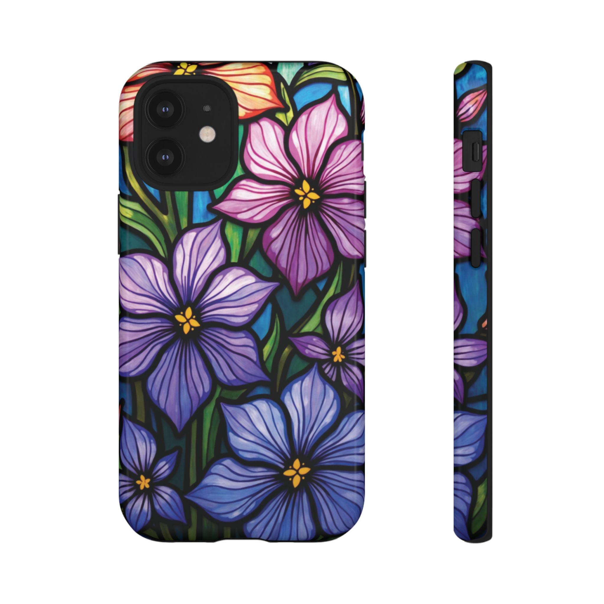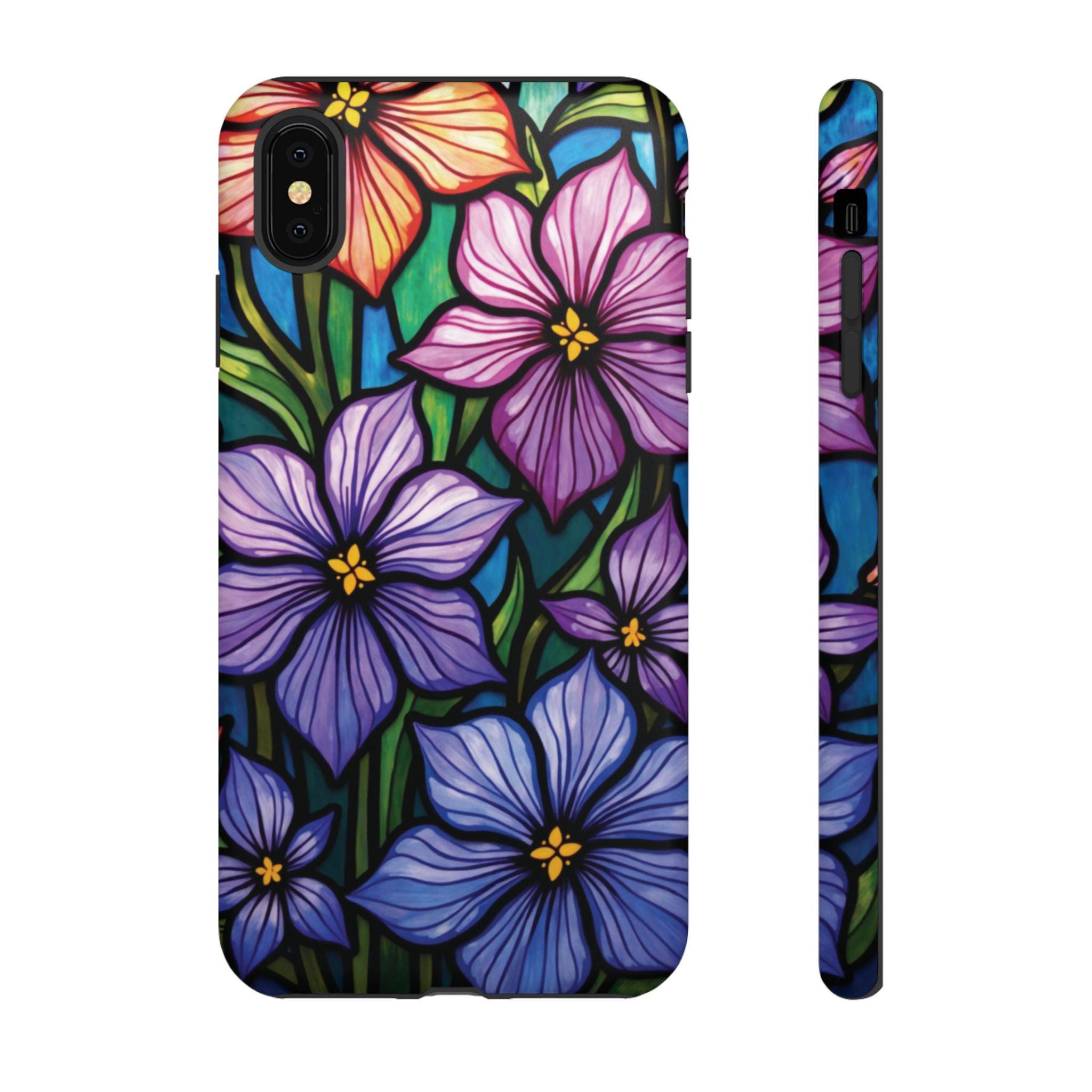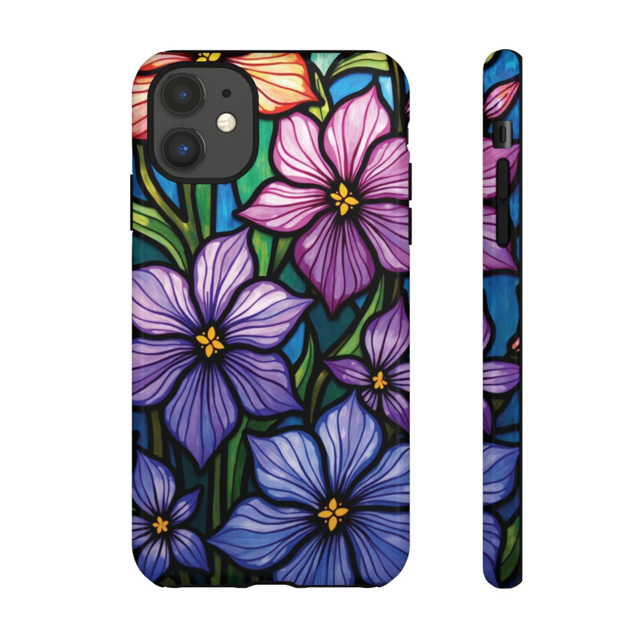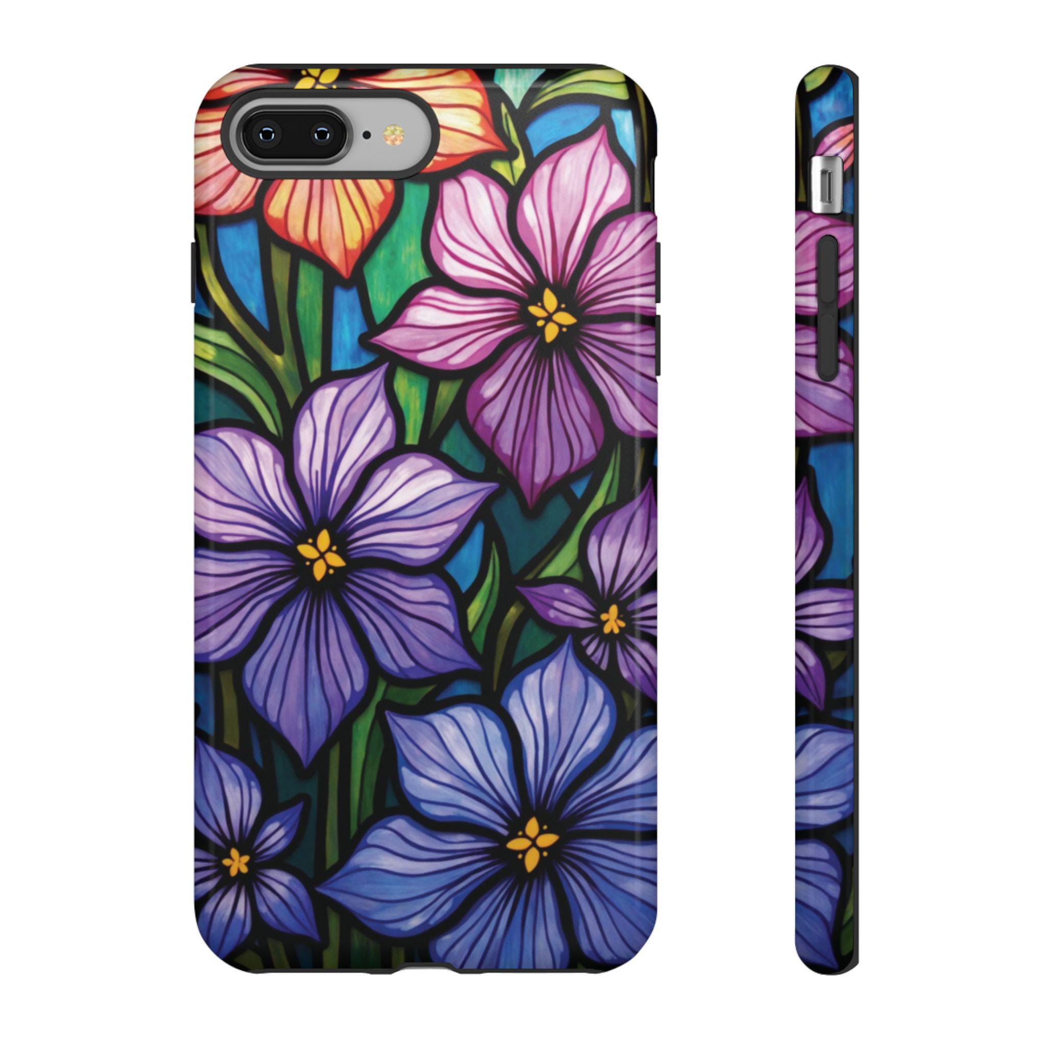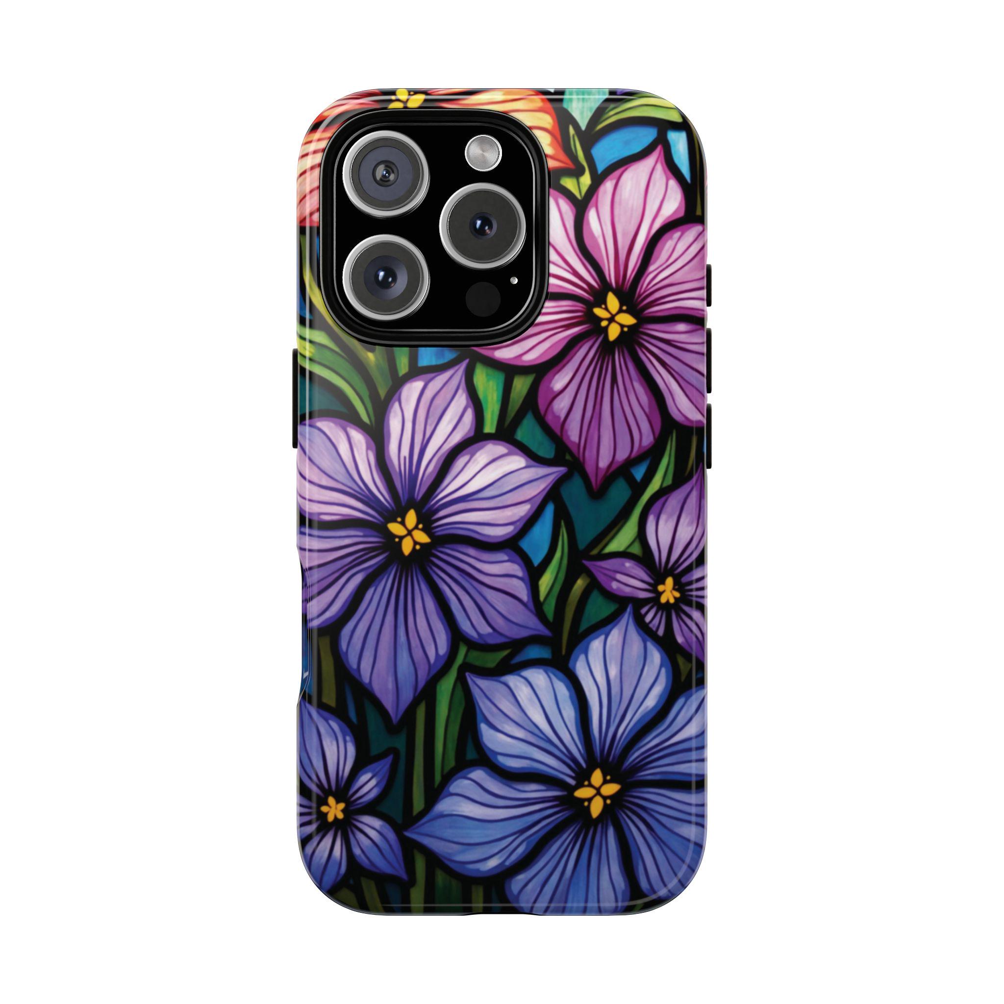 Violet stained glass IPhone tough case. Introducing our vibrant phone case, designed to brighten your everyday life with stunning artwork. This product adds a cheerful and artistic touch to your phone, making it not just a protective accessory but also a statement piece. Perfect for nature lovers, this sturdy case is ideal for adults seeking both style and durability. Great for gifting during holidays like birthdays, Mother's Day, or any occasion where you want to bring a smile. Use it to enhance your daily routines, whether at work, school, or leisure activities, and enjoy the subconscious uplift that beautiful designs can bring to your life.