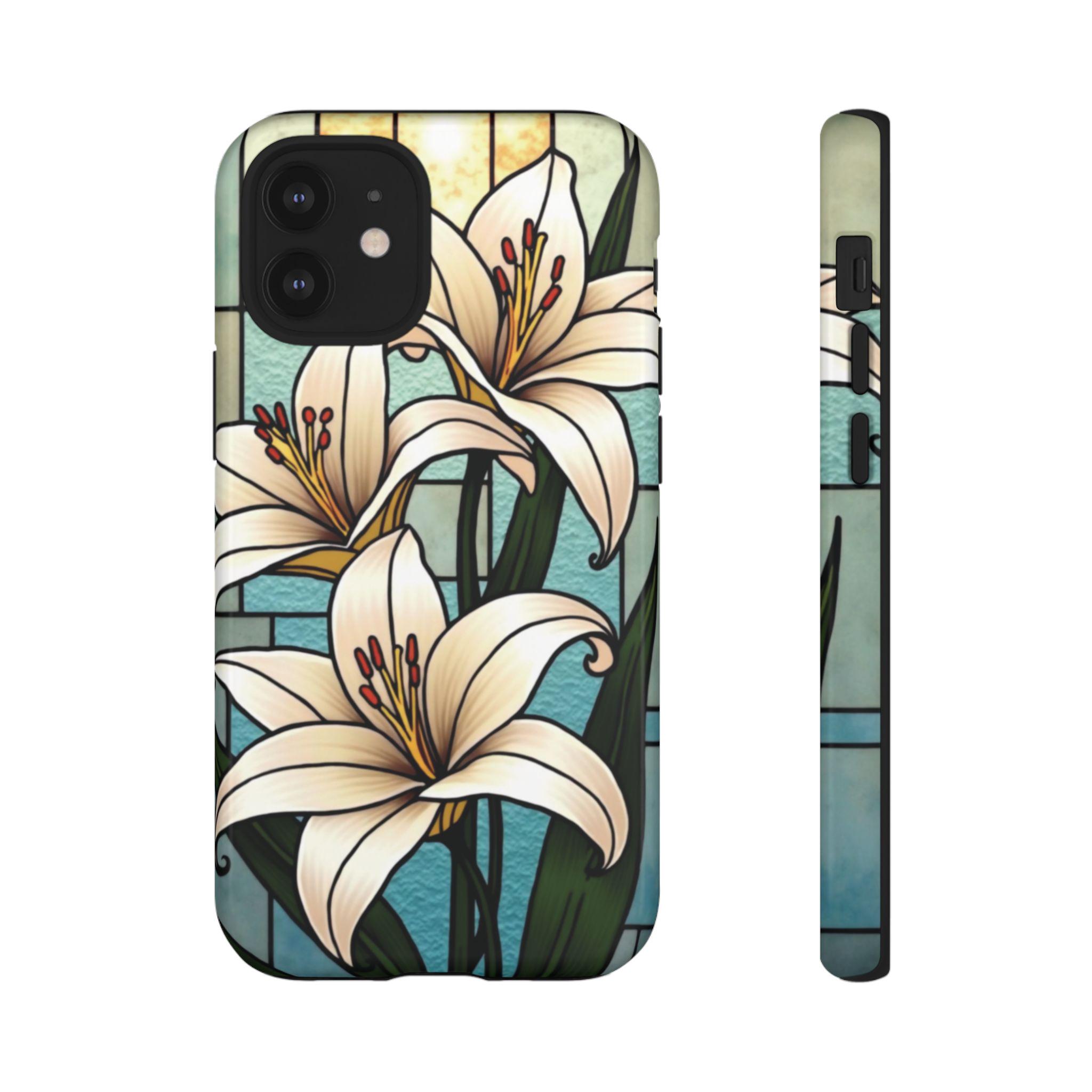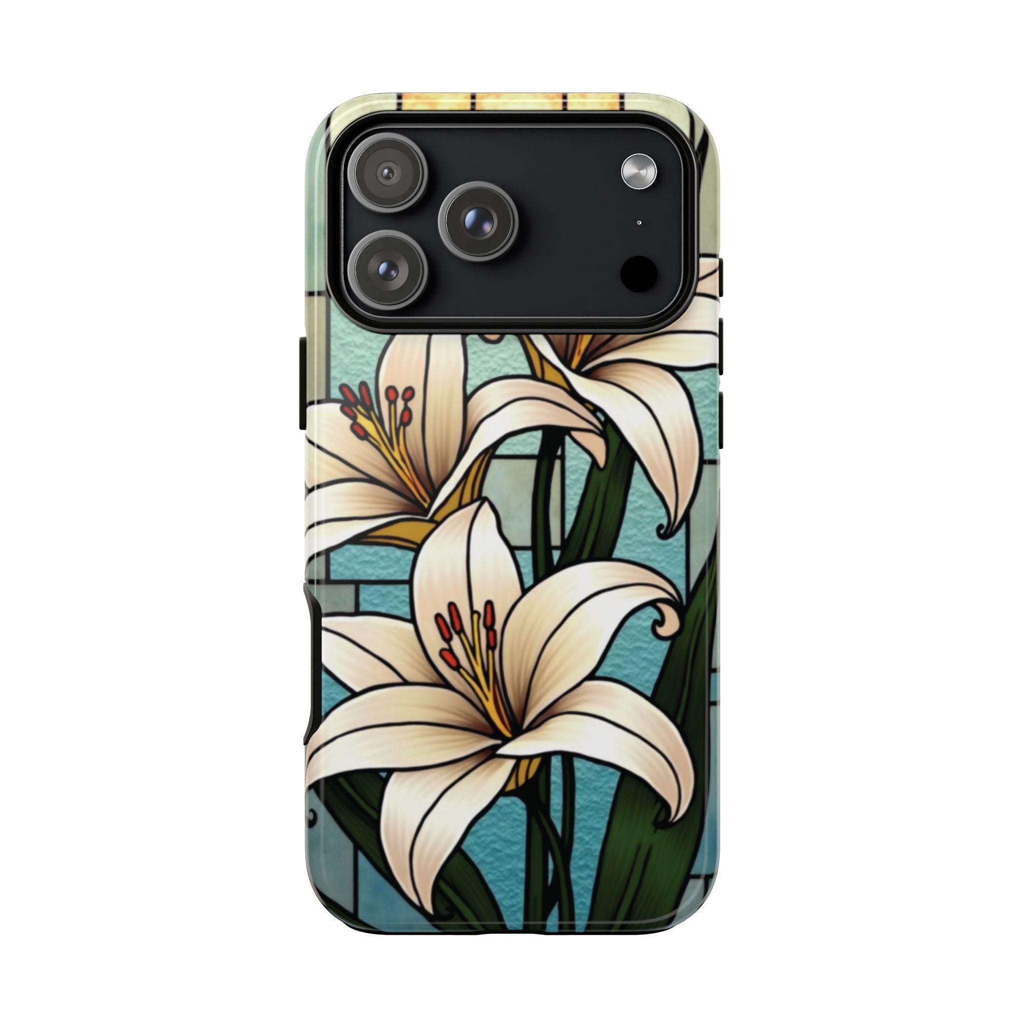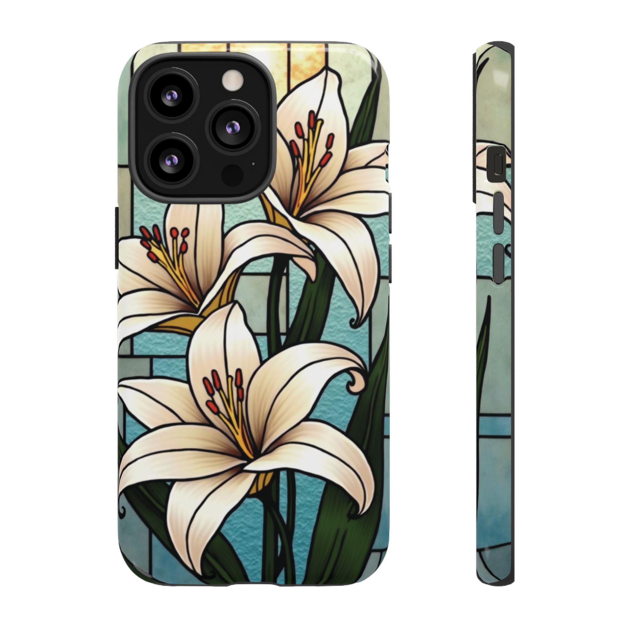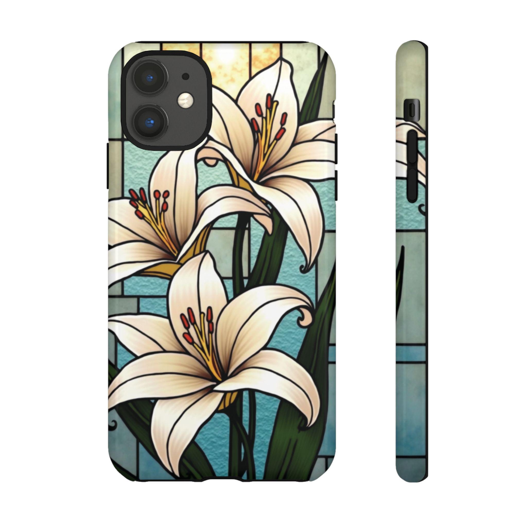 Lilies stained glass IPhone tough case. Introducing our vibrant phone case, designed to brighten your everyday life with stunning artwork. This product adds a cheerful and artistic touch to your phone, making it not just a protective accessory but also a statement piece. Perfect for nature lovers, this sturdy case is ideal for adults seeking both style and durability. Great for gifting during holidays like birthdays, Mother's Day, or any occasion where you want to bring a smile. Use it to enhance your daily routines, whether at work, school, or leisure activities, and enjoy the subconscious uplift that beautiful designs can bring to your life.
