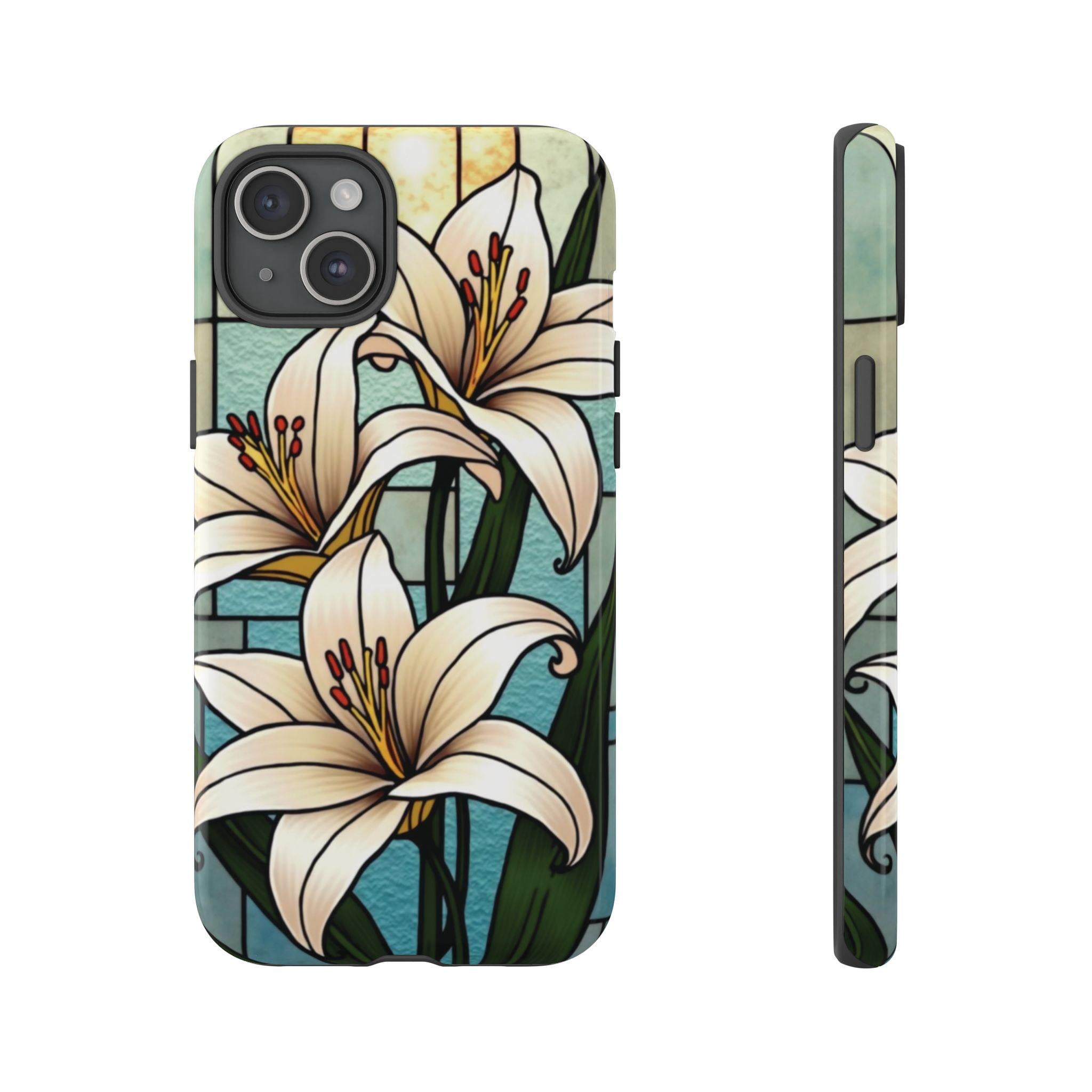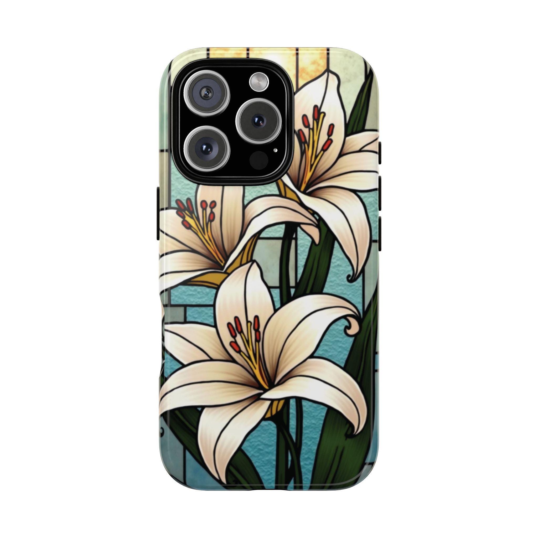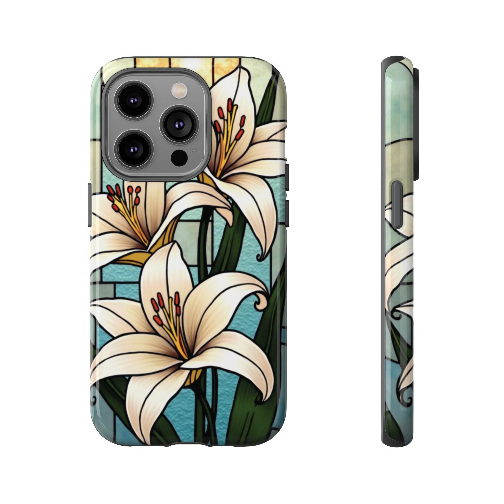 Lilies stained glass IPhone tough case. Introducing our vibrant phone case, designed to brighten your everyday life with stunning artwork. This product adds a cheerful and artistic touch to your phone, making it not just a protective accessory but also a statement piece. Perfect for nature lovers, this sturdy case is ideal for adults seeking both style and durability. Great for gifting during holidays like birthdays, Mother's Day, or any occasion where you want to bring a smile. Use it to enhance your daily routines, whether at work, school, or leisure activities, and enjoy the subconscious uplift that beautiful designs can bring to your life.