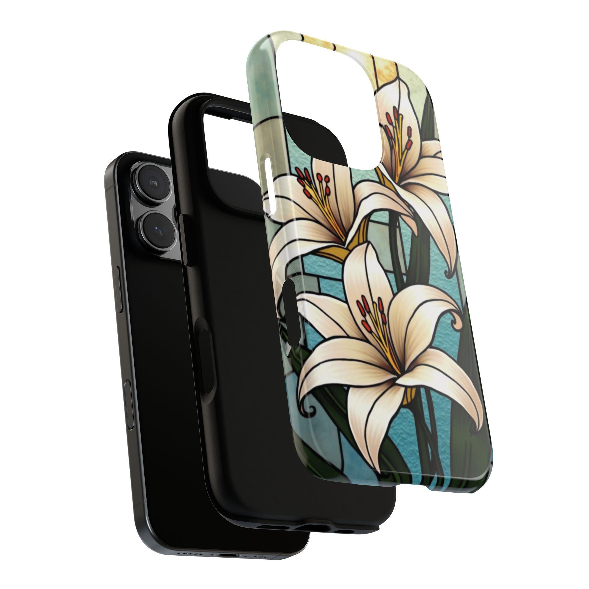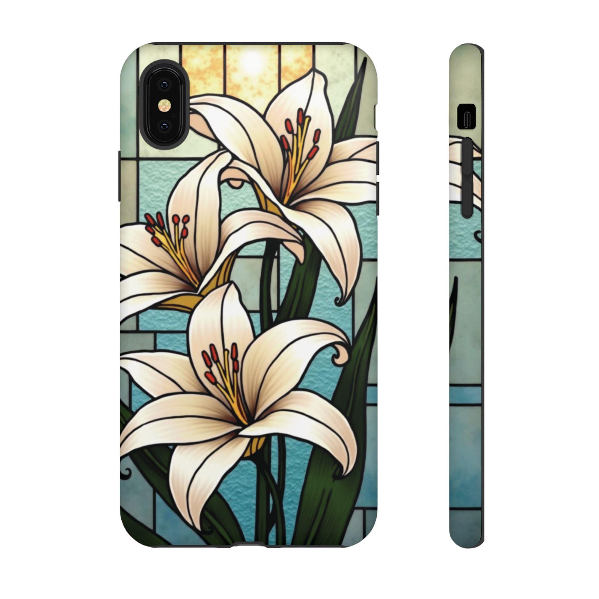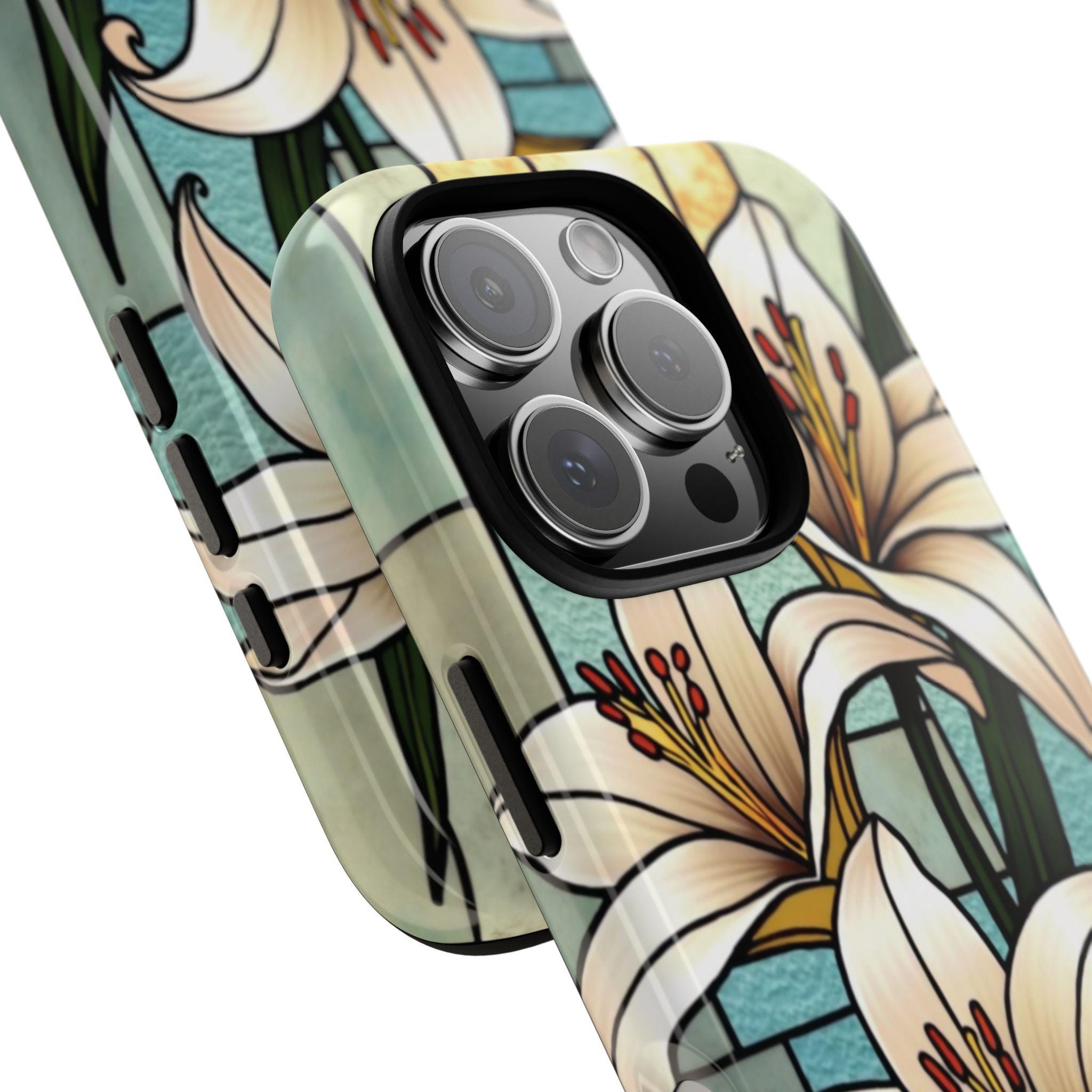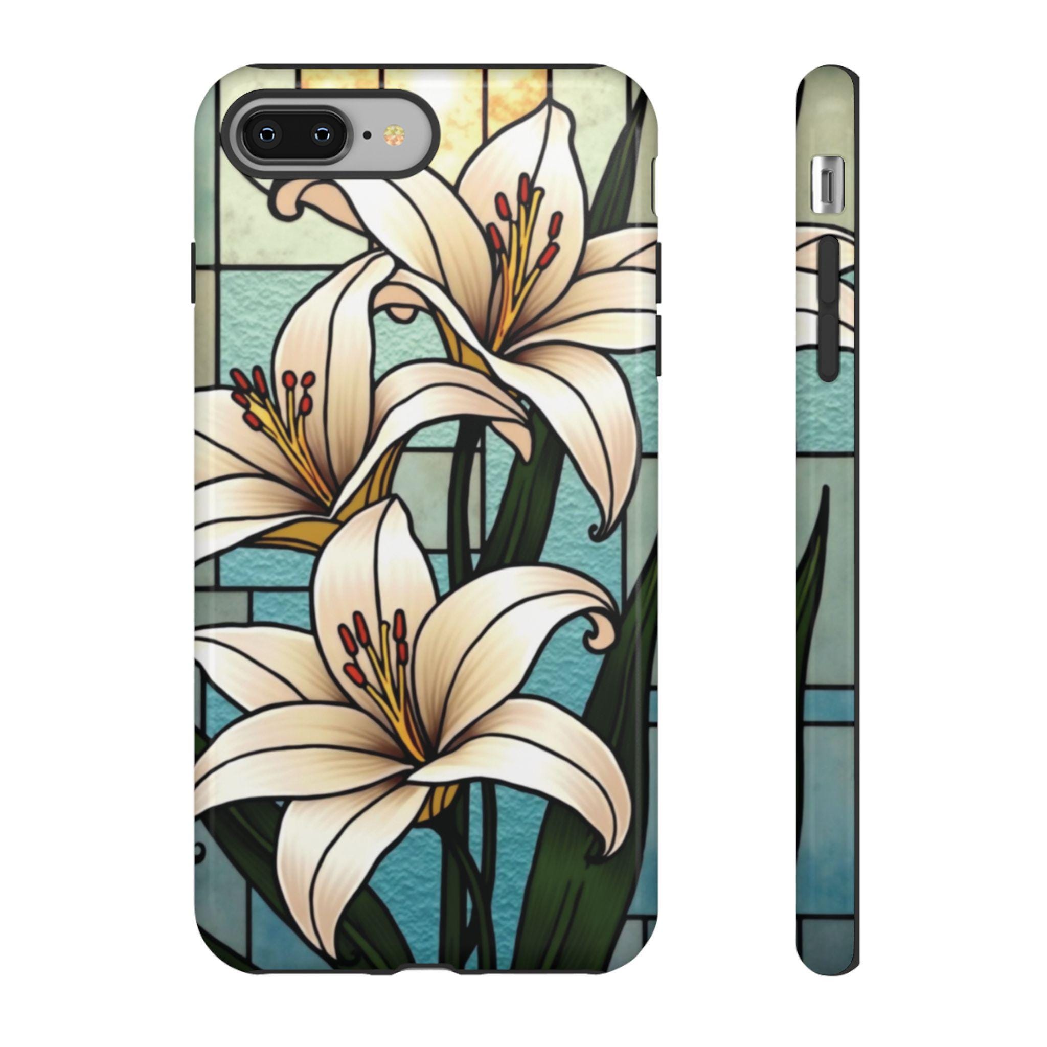 Lilies stained glass IPhone tough case. Introducing our vibrant phone case, designed to brighten your everyday life with stunning artwork. This product adds a cheerful and artistic touch to your phone, making it not just a protective accessory but also a statement piece. Perfect for nature lovers, this sturdy case is ideal for adults seeking both style and durability. Great for gifting during holidays like birthdays, Mother's Day, or any occasion where you want to bring a smile. Use it to enhance your daily routines, whether at work, school, or leisure activities, and enjoy the subconscious uplift that beautiful designs can bring to your life.