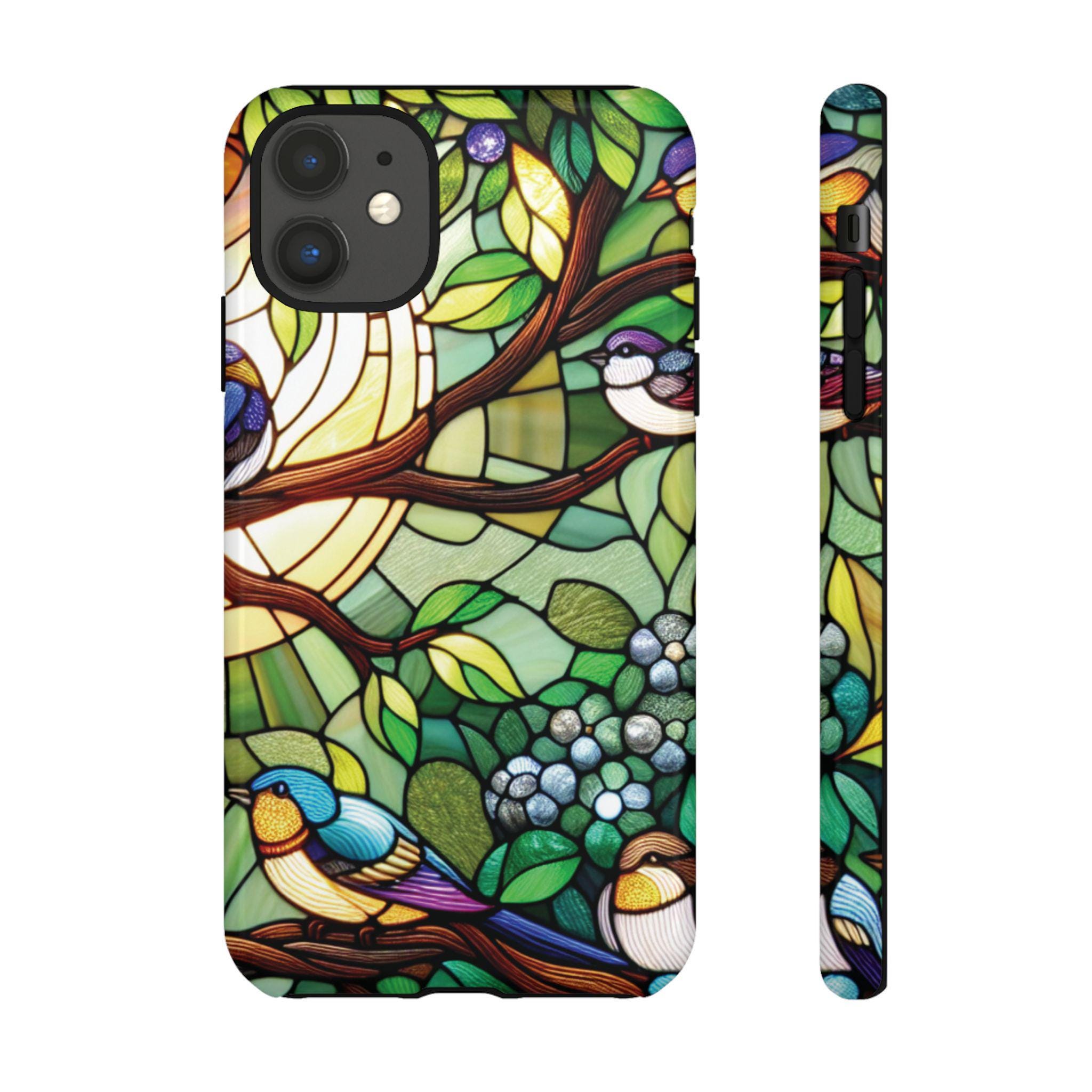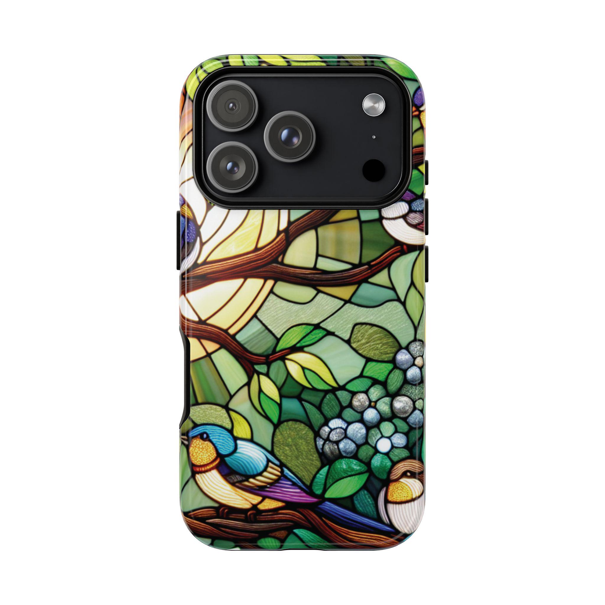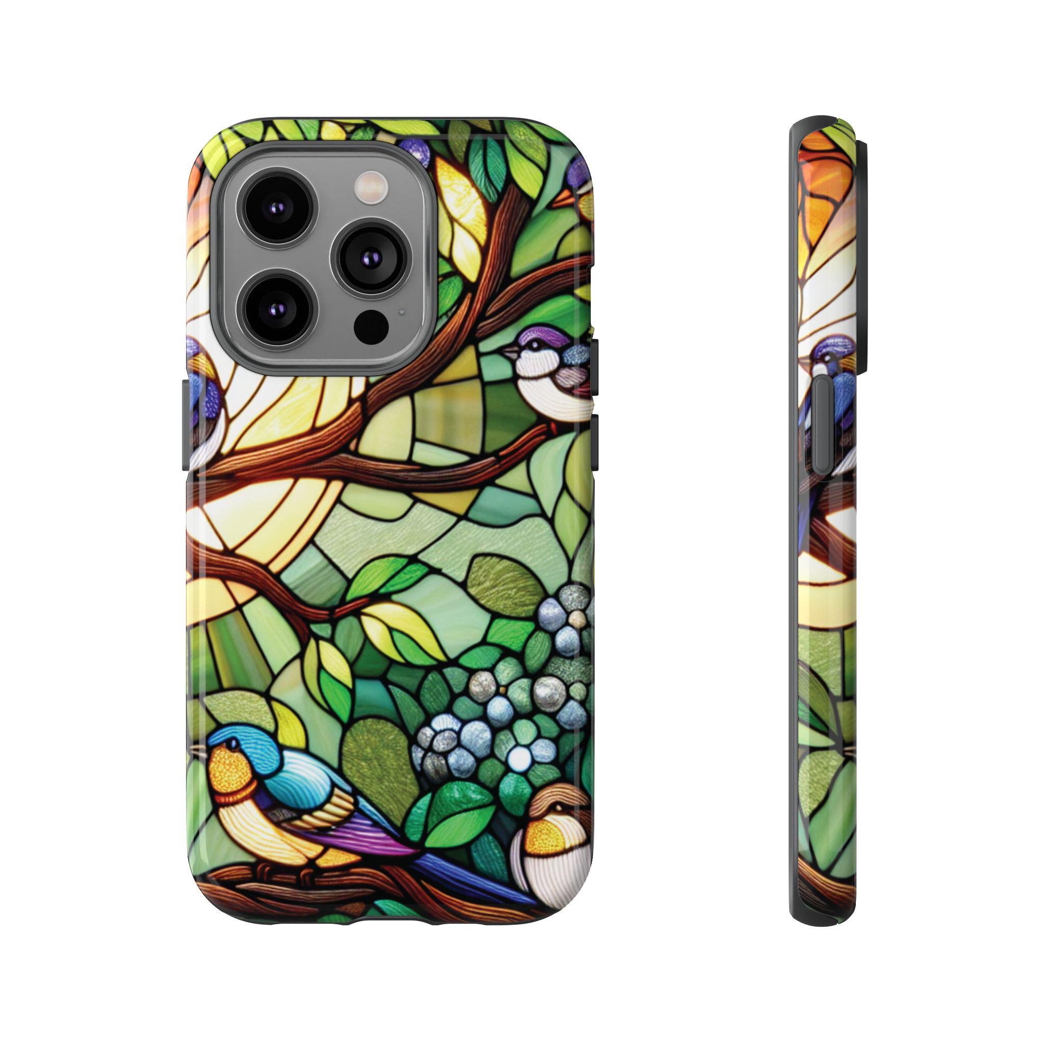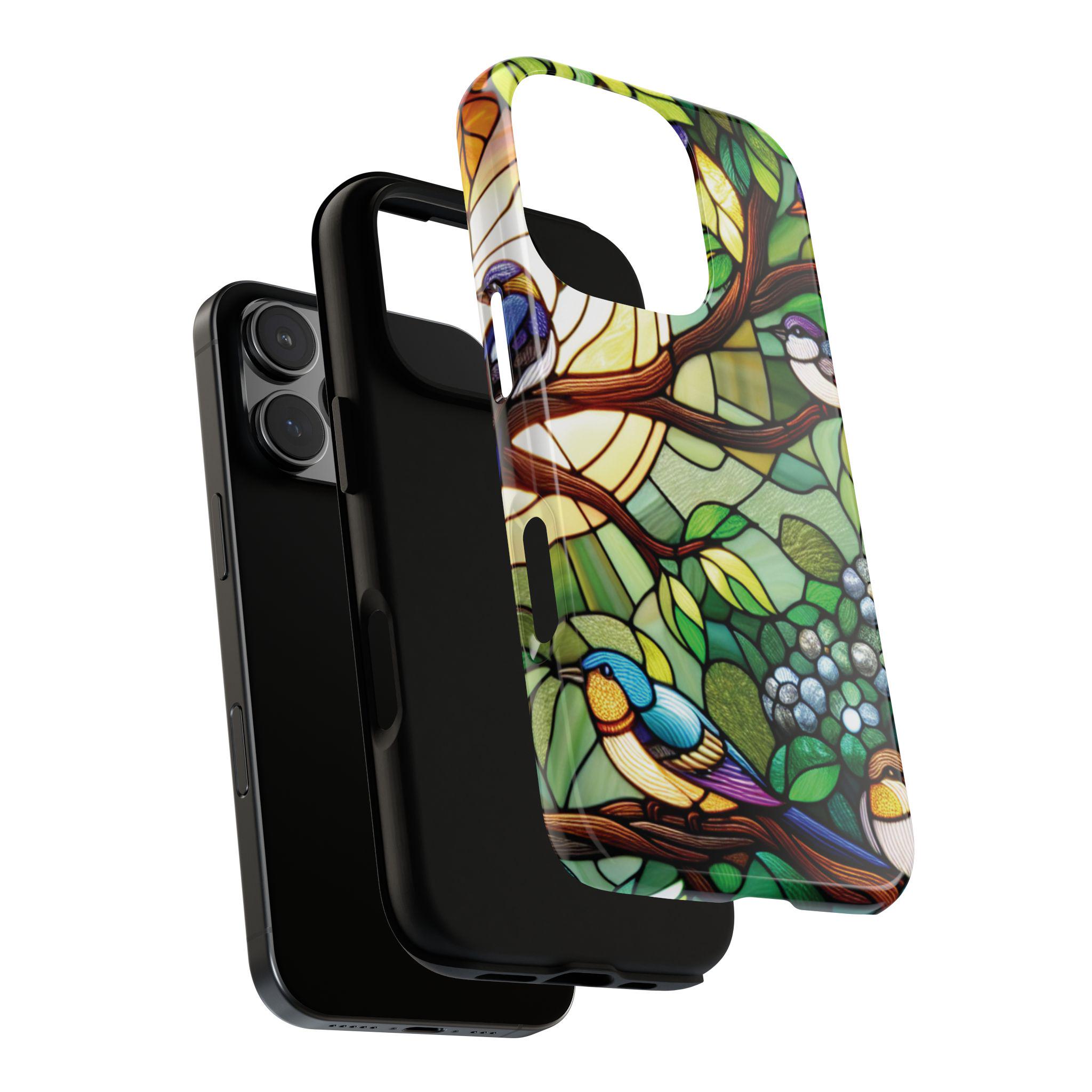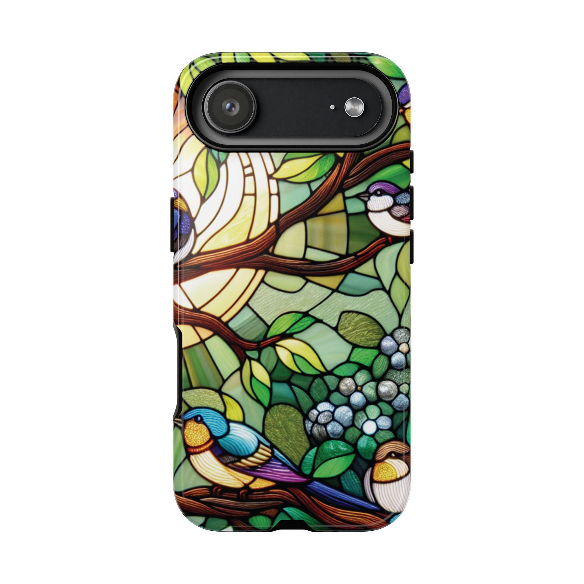 Birds in tree stained glass IPhone tough case. Introducing our vibrant phone case, designed to brighten your everyday life with stunning artwork. This product adds a cheerful and artistic touch to your phone, making it not just a protective accessory but also a statement piece. Perfect for nature lovers, this sturdy case is ideal for adults seeking both style and durability. Great for gifting during holidays like birthdays, Mother's Day, or any occasion where you want to bring a smile. Use it to enhance your daily routines, whether at work, school, or leisure activities, and enjoy the subconscious uplift that beautiful designs can bring to your life.