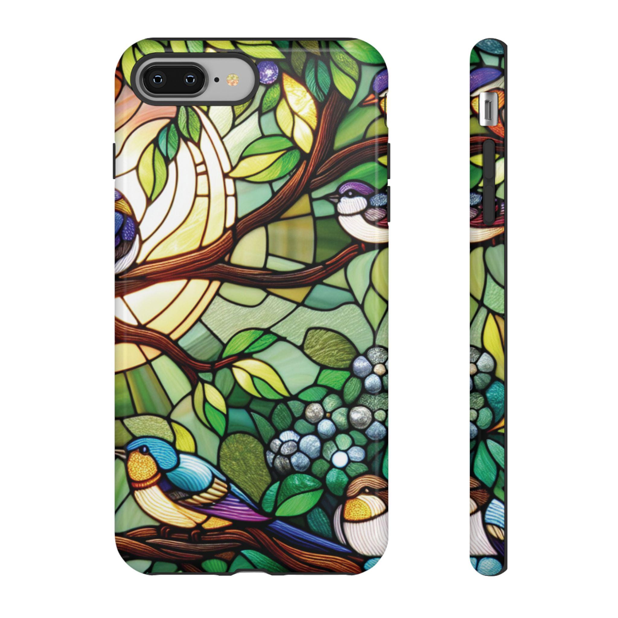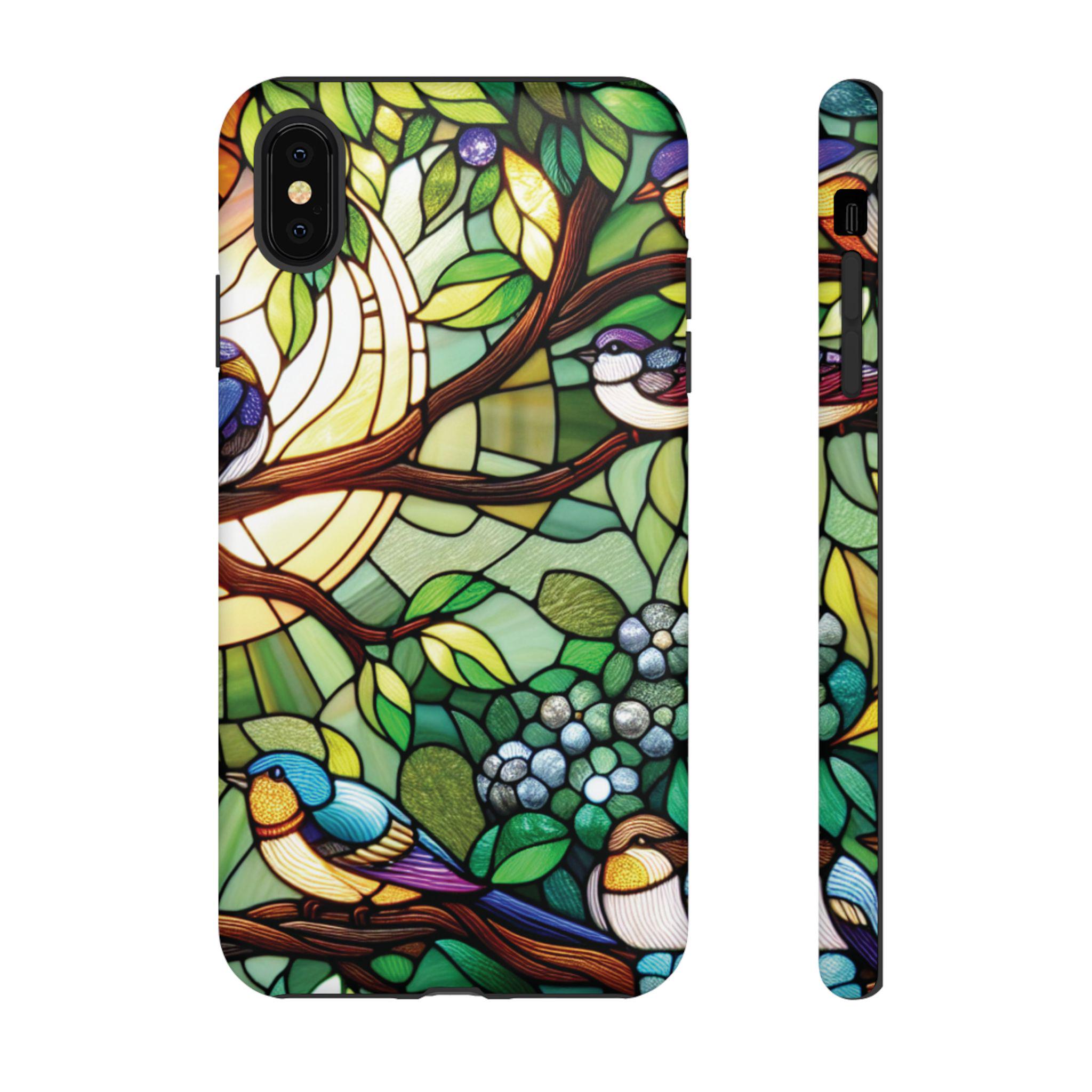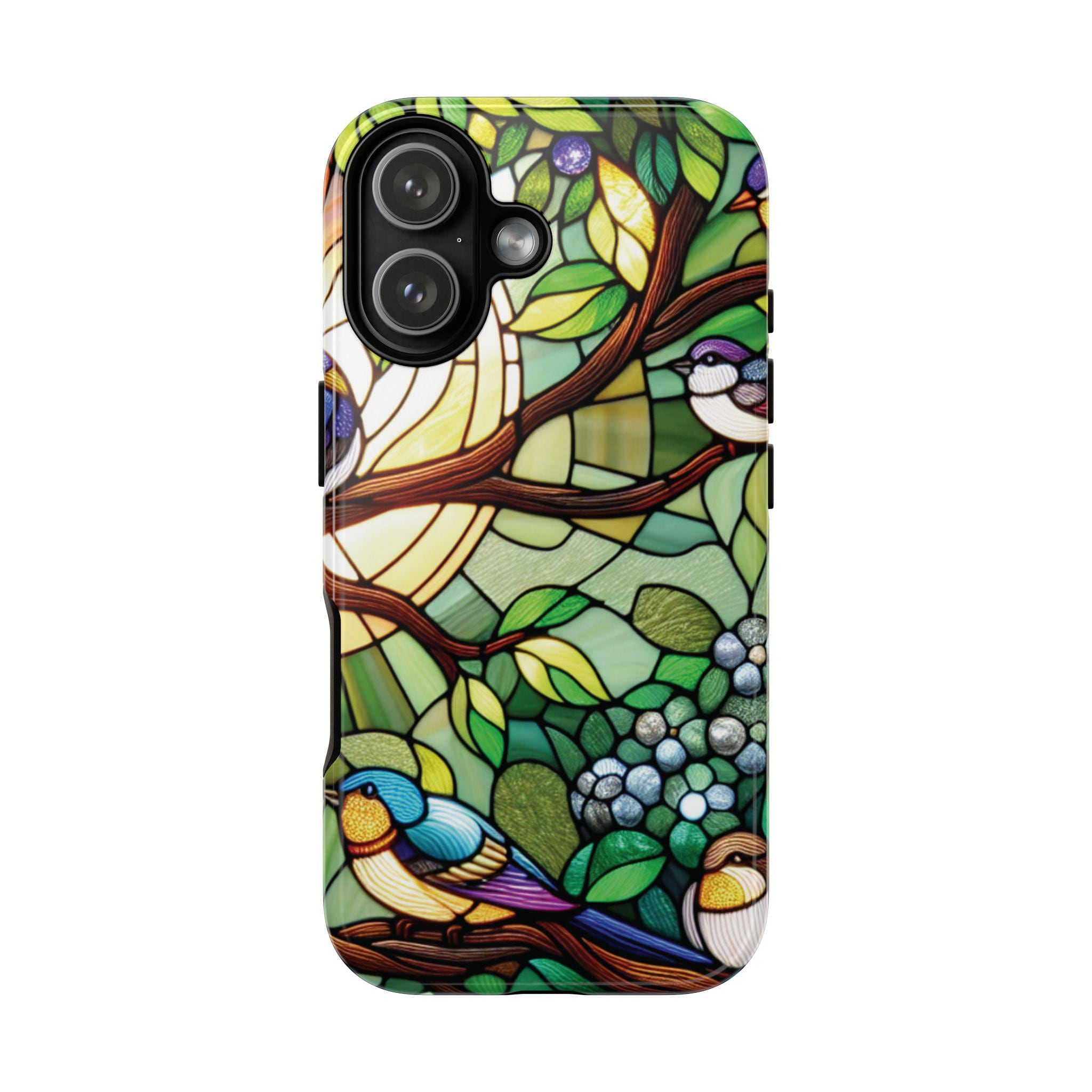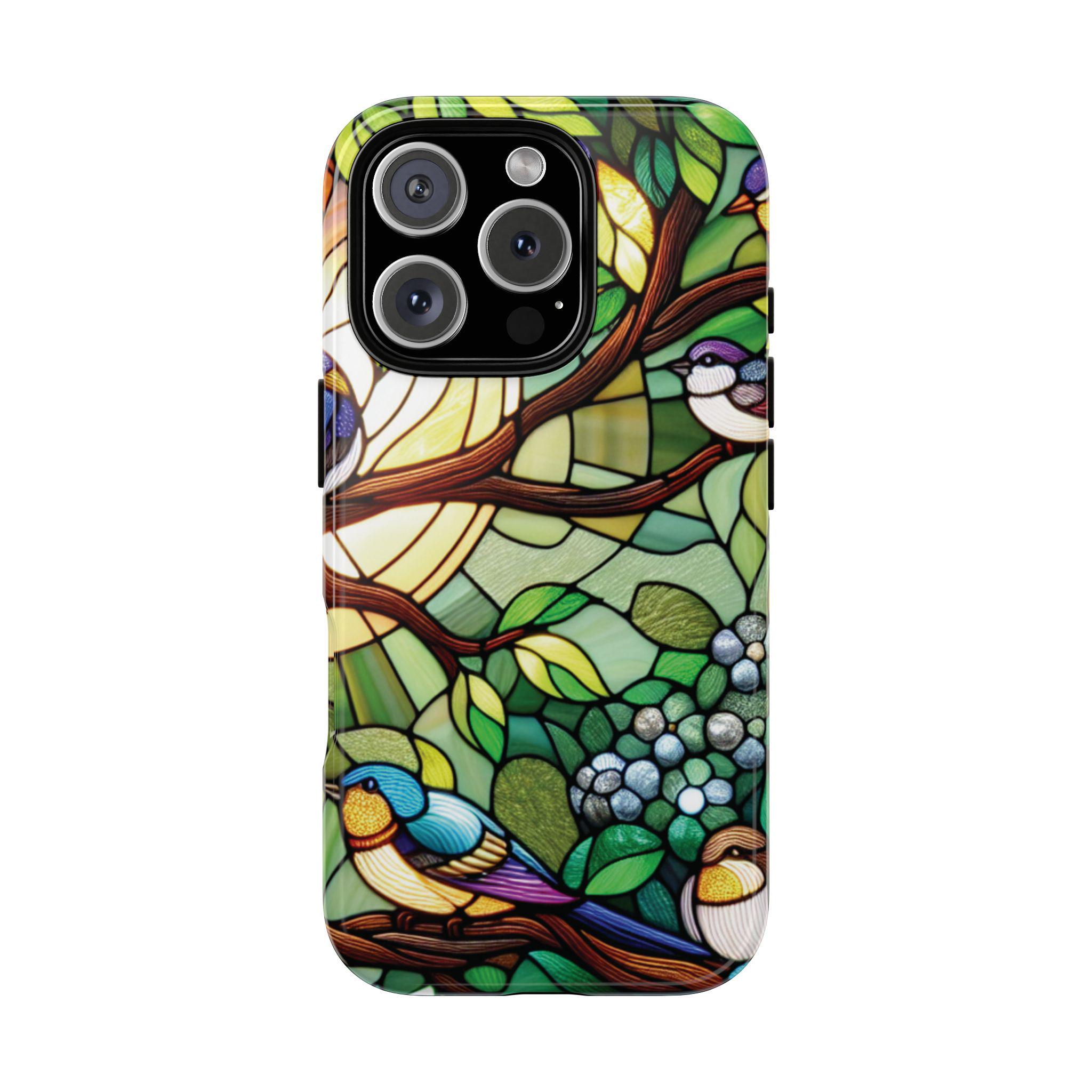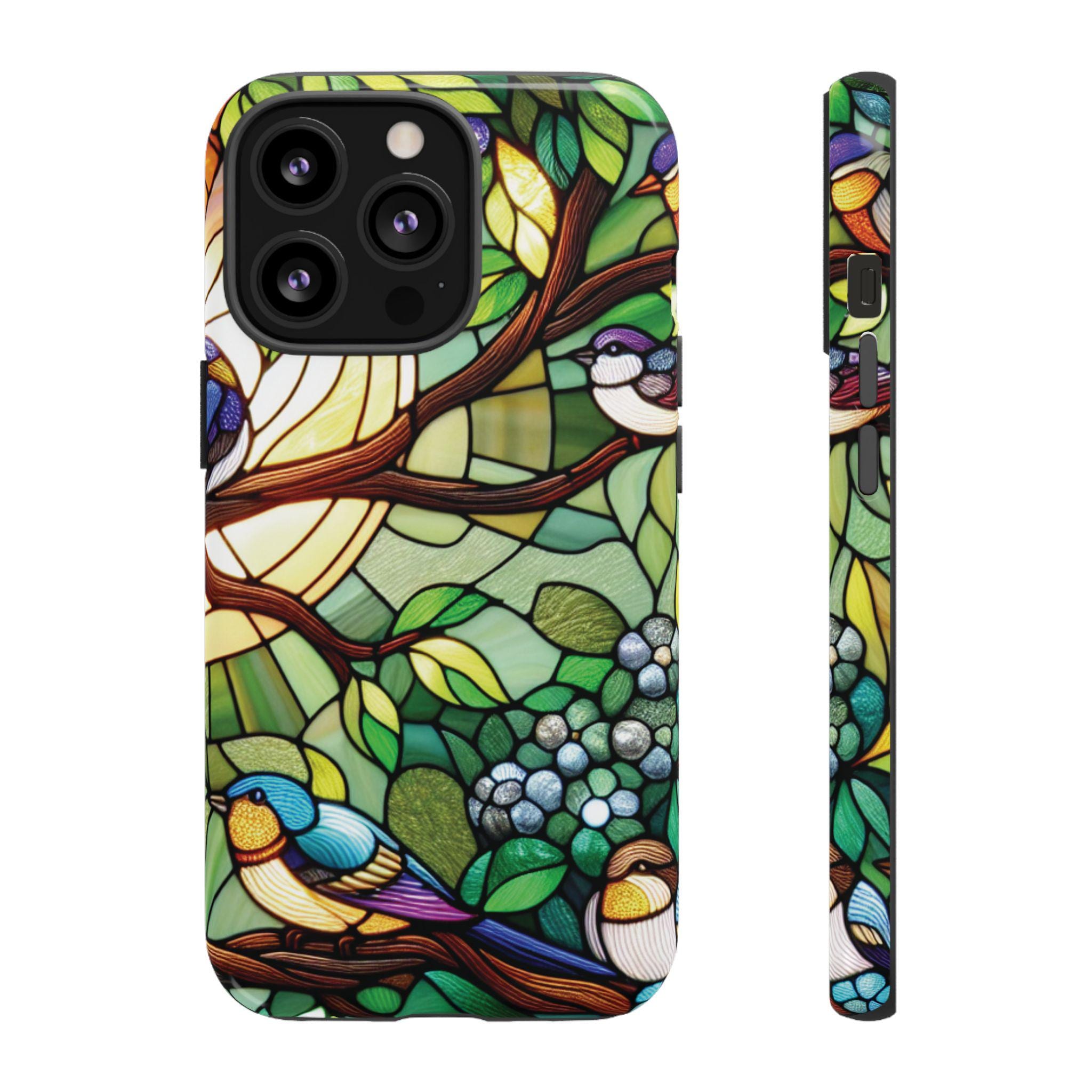 Birds in tree stained glass IPhone tough case. Introducing our vibrant phone case, designed to brighten your everyday life with stunning artwork. This product adds a cheerful and artistic touch to your phone, making it not just a protective accessory but also a statement piece. Perfect for nature lovers, this sturdy case is ideal for adults seeking both style and durability. Great for gifting during holidays like birthdays, Mother's Day, or any occasion where you want to bring a smile. Use it to enhance your daily routines, whether at work, school, or leisure activities, and enjoy the subconscious uplift that beautiful designs can bring to your life.