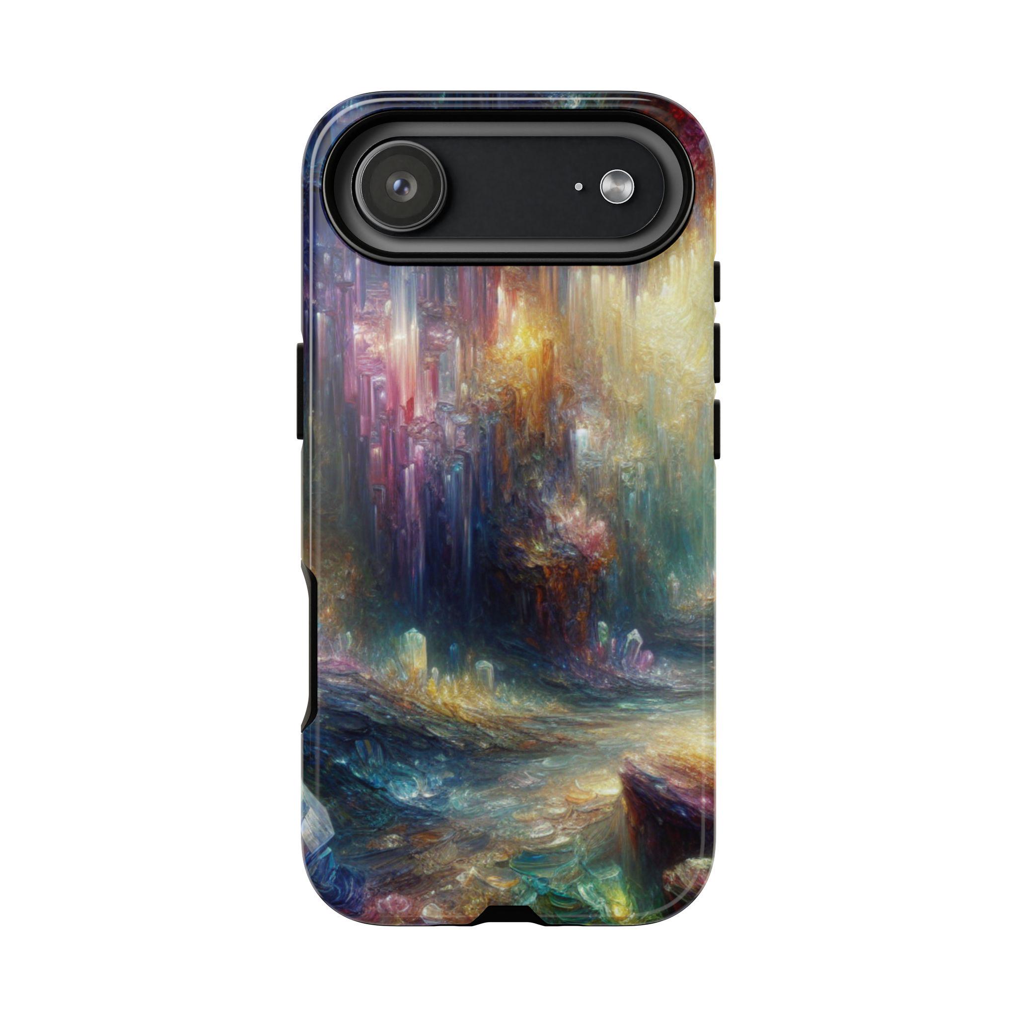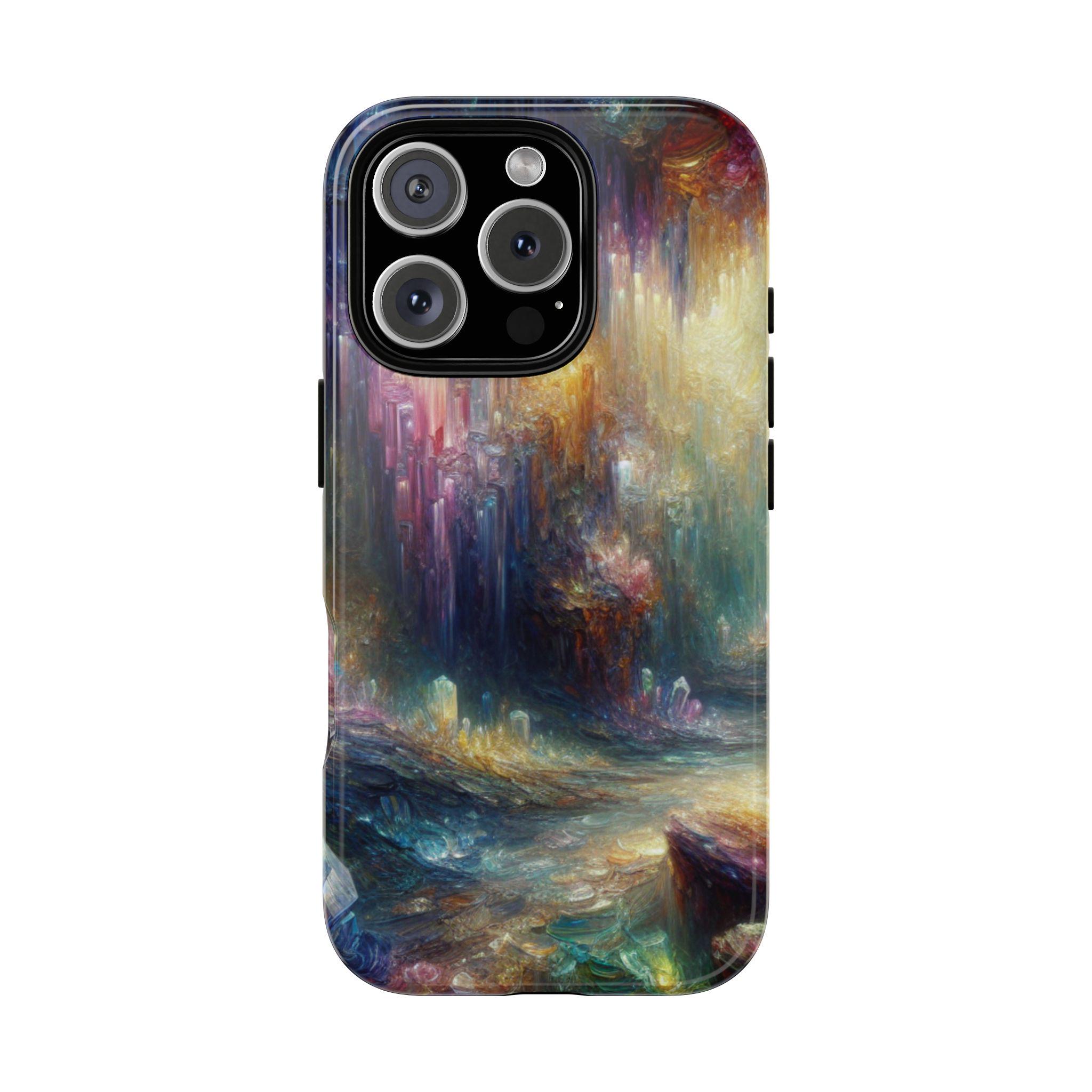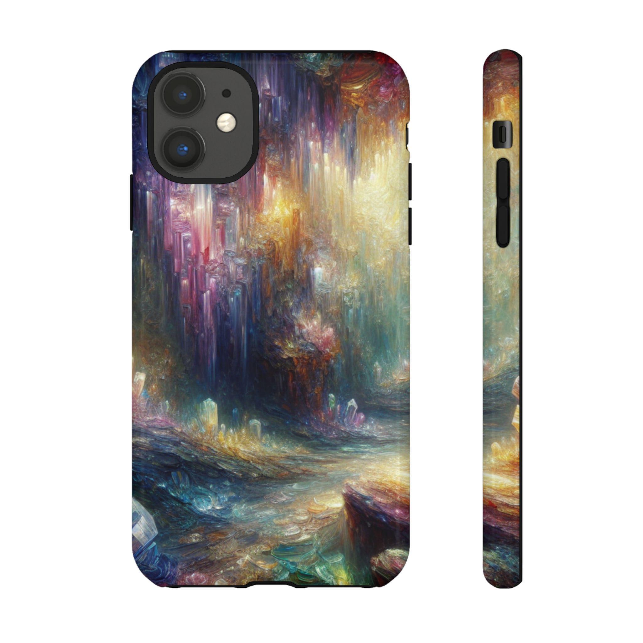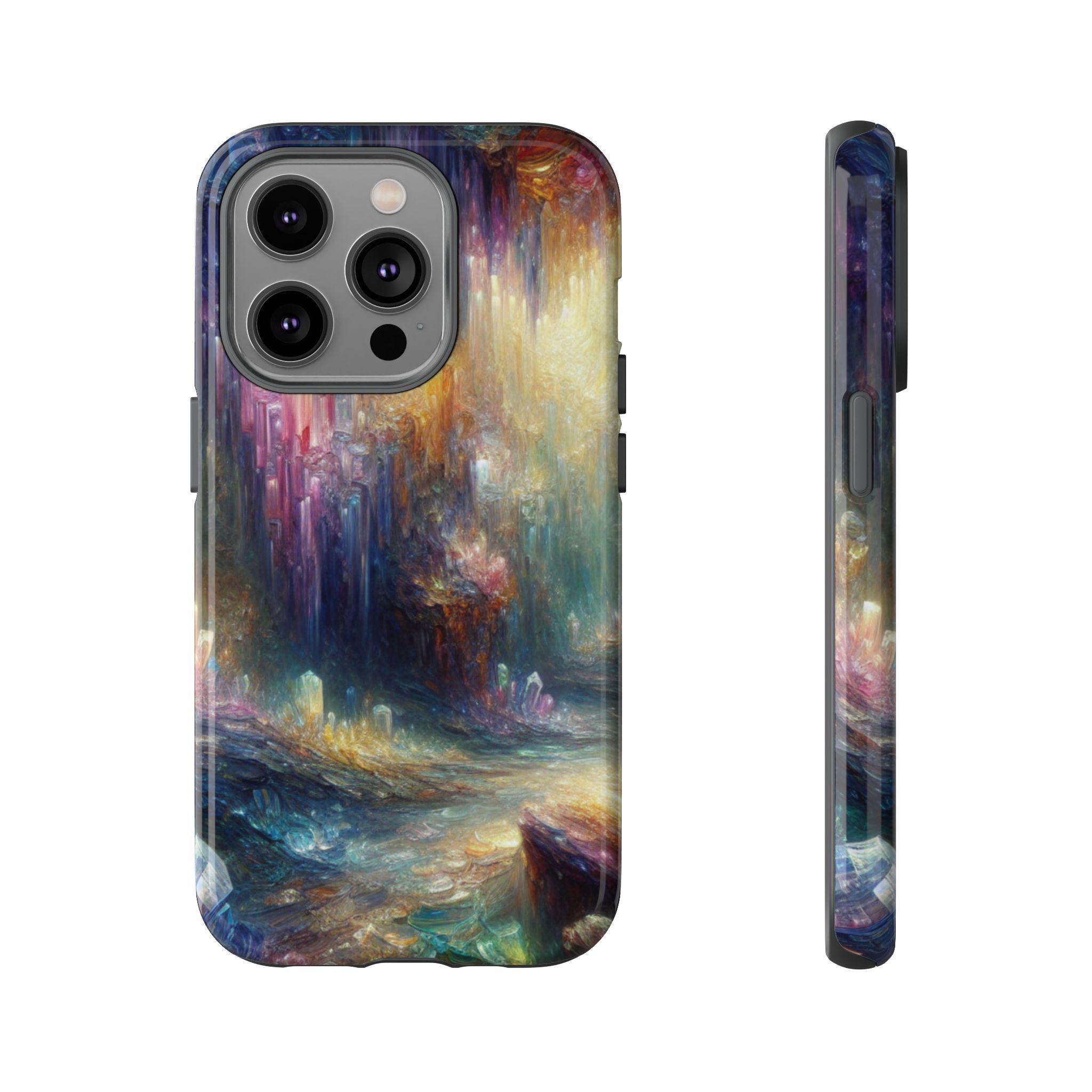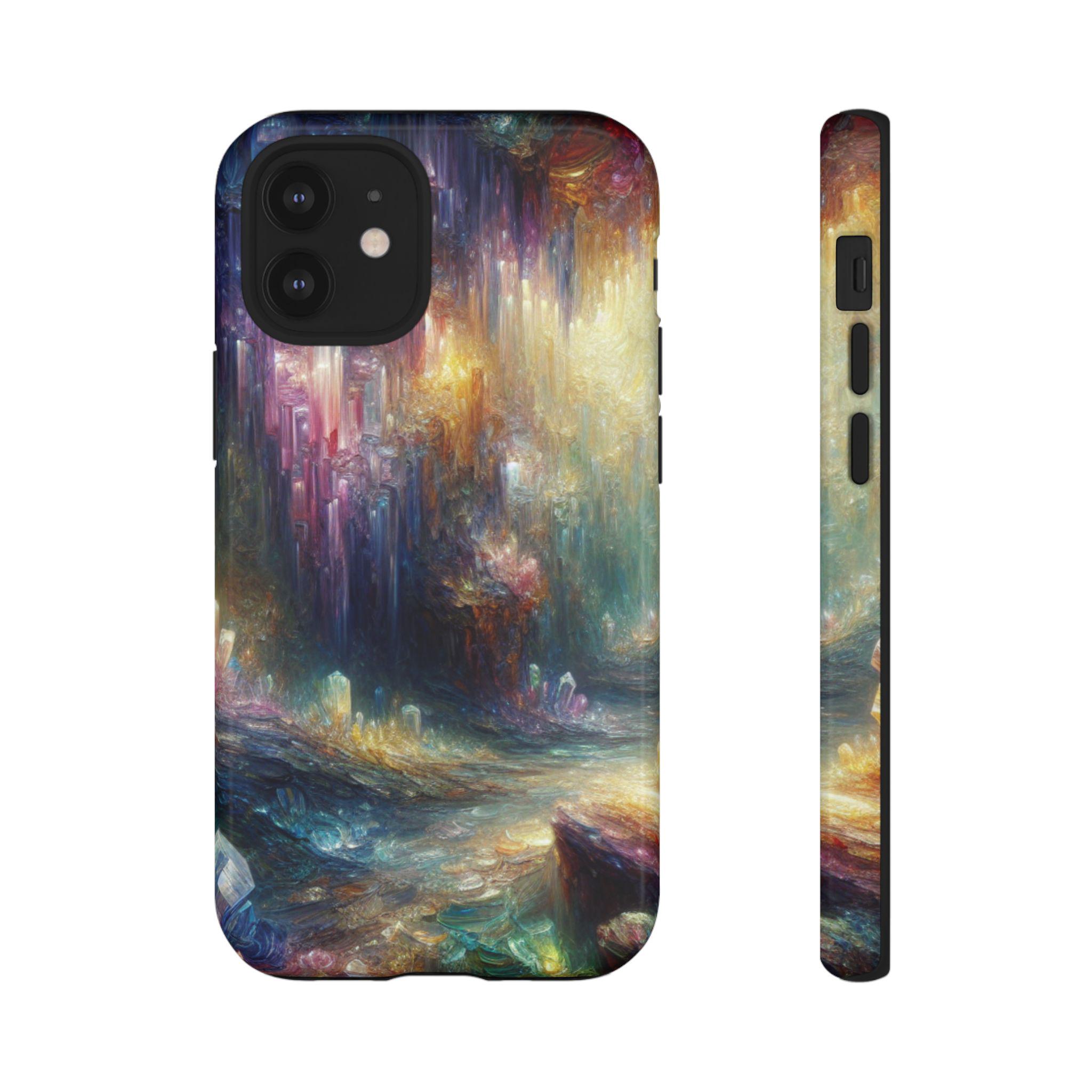 Mystical crystal cave stained glass IPhone tough case. Introducing our vibrant phone case, designed to brighten your everyday life with stunning artwork. This product adds a cheerful and artistic touch to your phone, making it not just a protective accessory but also a statement piece. This sturdy case is ideal for adults seeking both style and durability. Great for gifting during holidays like birthdays, Mother's Day, or any occasion where you want to bring a smile. Use it to enhance your daily routines, whether at work, school, or leisure activities, and enjoy the subconscious uplift that beautiful designs can bring to your life.