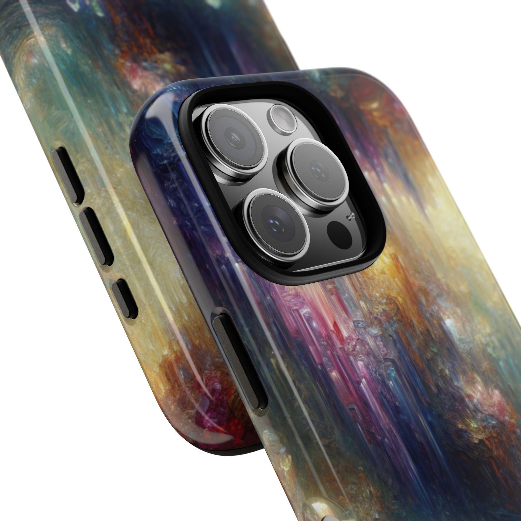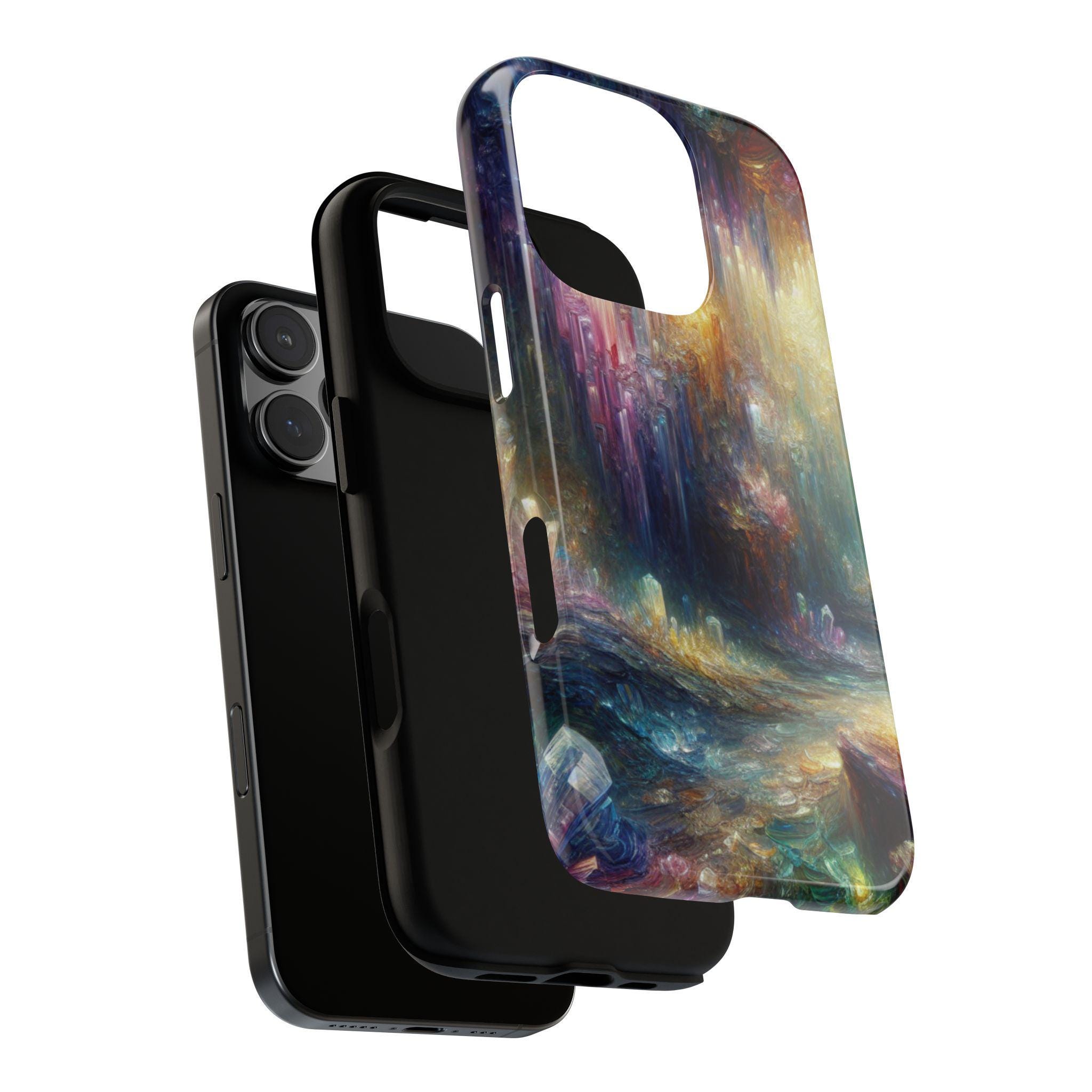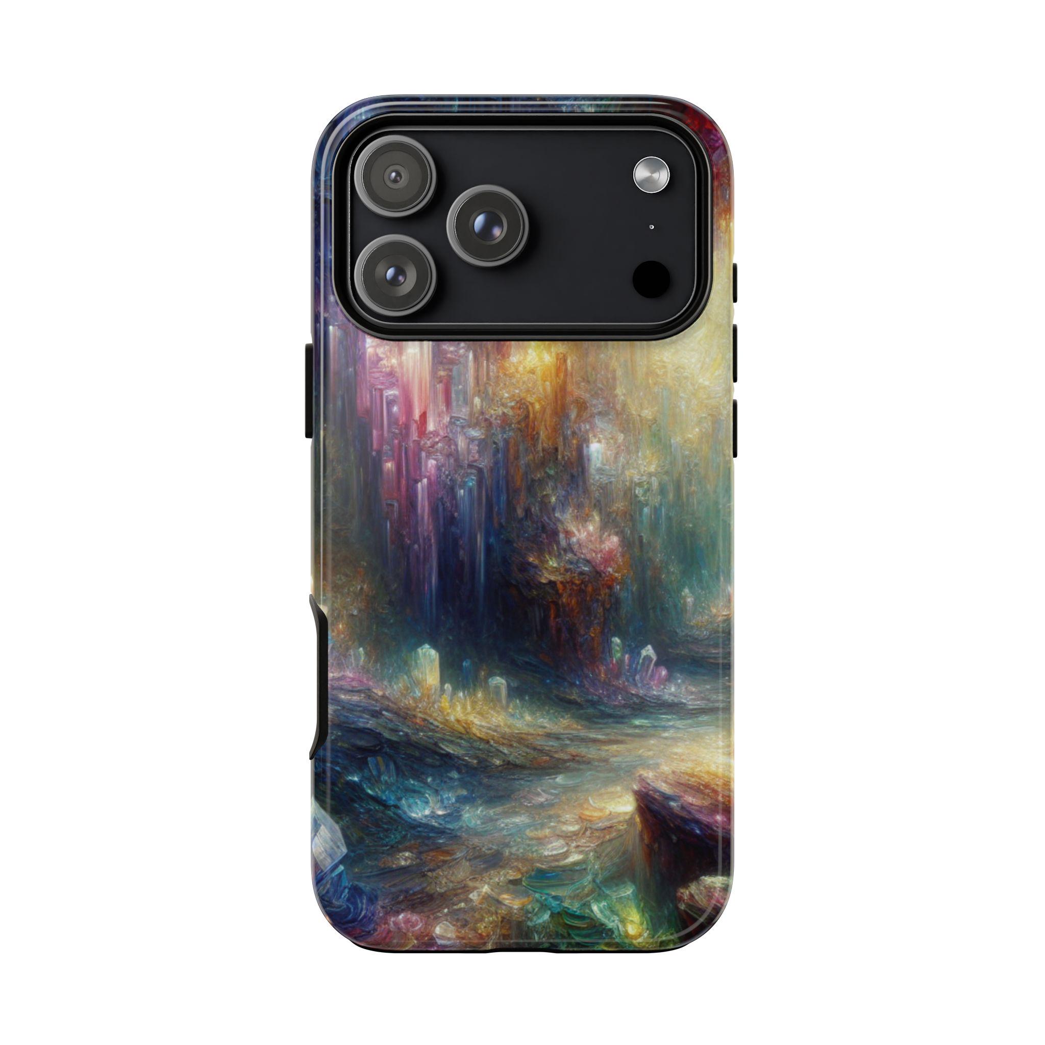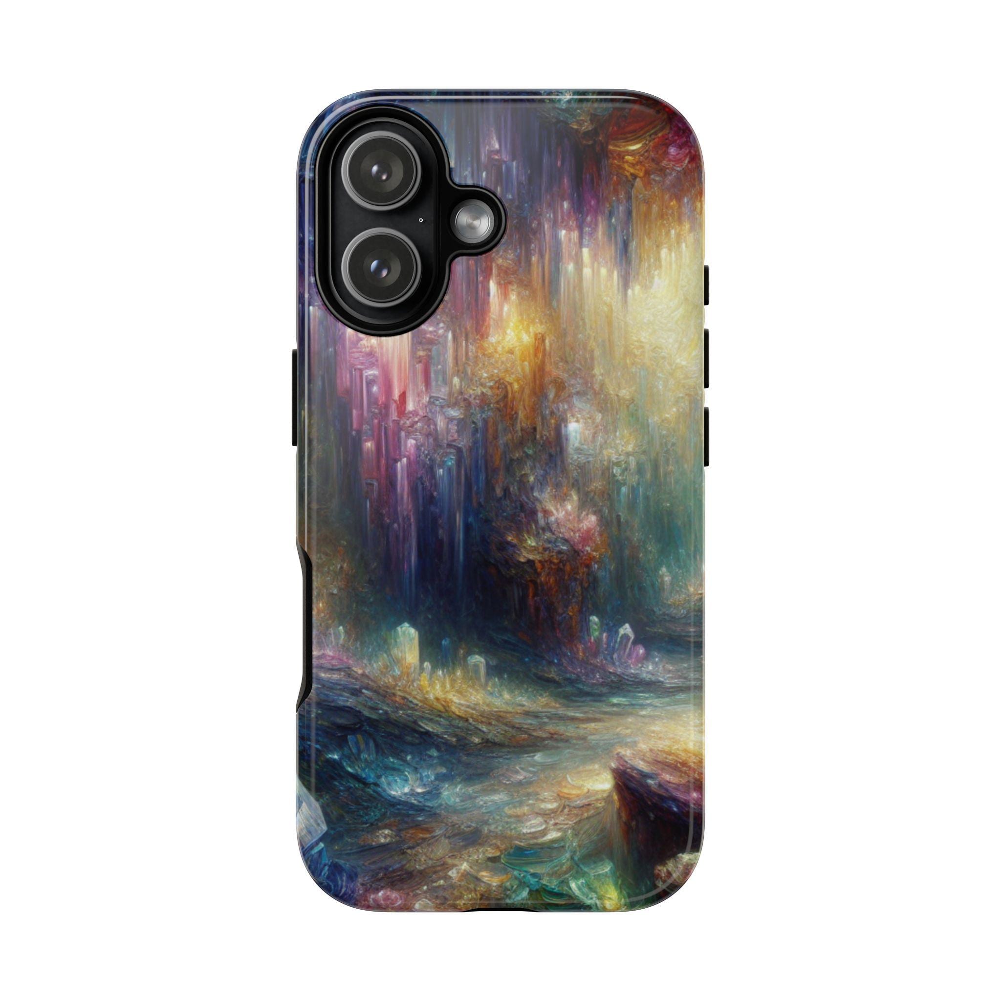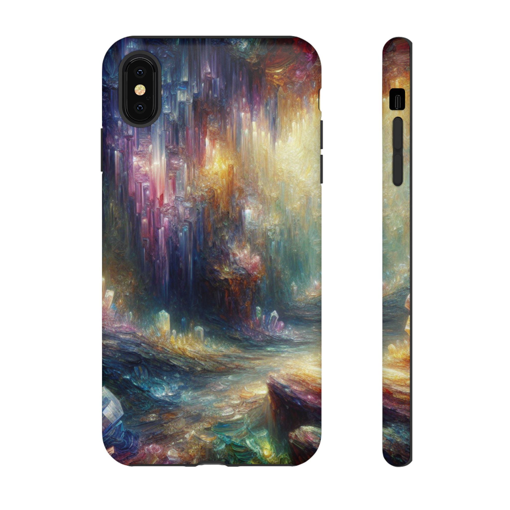 Mystical crystal cave stained glass IPhone tough case. Introducing our vibrant phone case, designed to brighten your everyday life with stunning artwork. This product adds a cheerful and artistic touch to your phone, making it not just a protective accessory but also a statement piece. This sturdy case is ideal for adults seeking both style and durability. Great for gifting during holidays like birthdays, Mother's Day, or any occasion where you want to bring a smile. Use it to enhance your daily routines, whether at work, school, or leisure activities, and enjoy the subconscious uplift that beautiful designs can bring to your life.