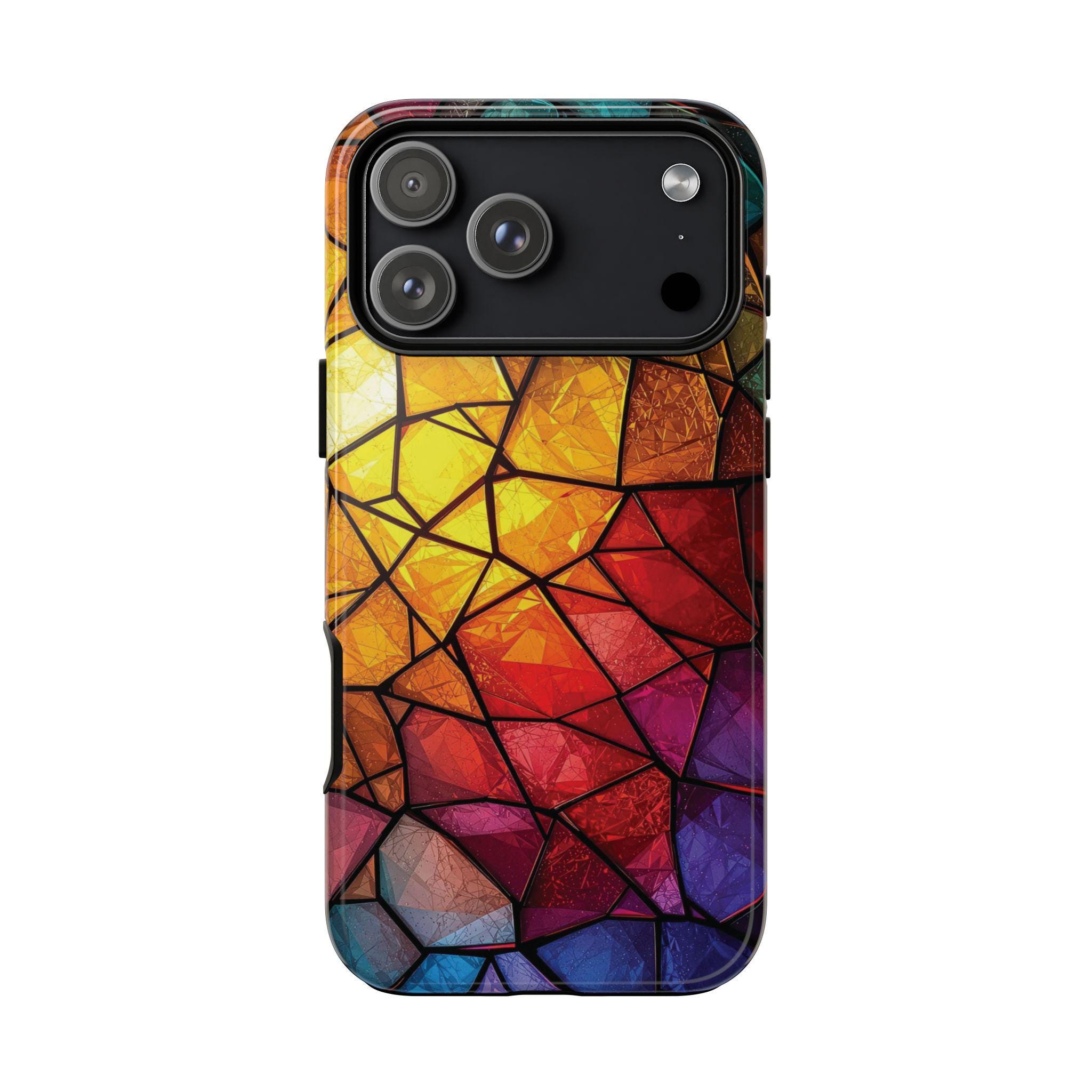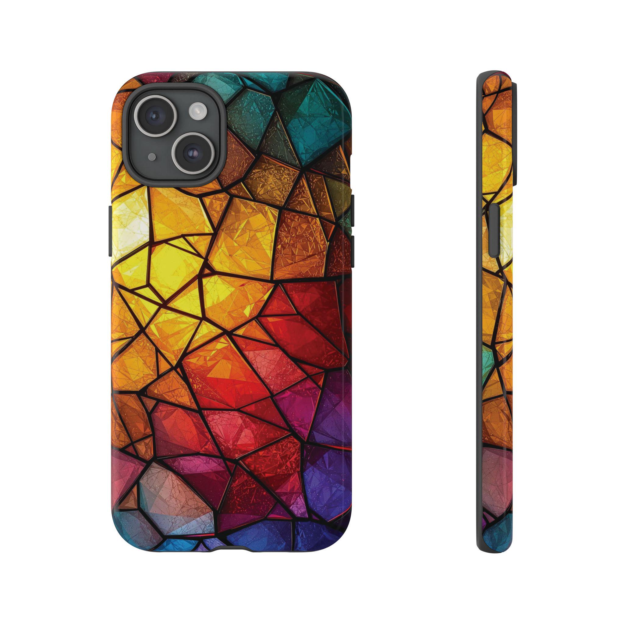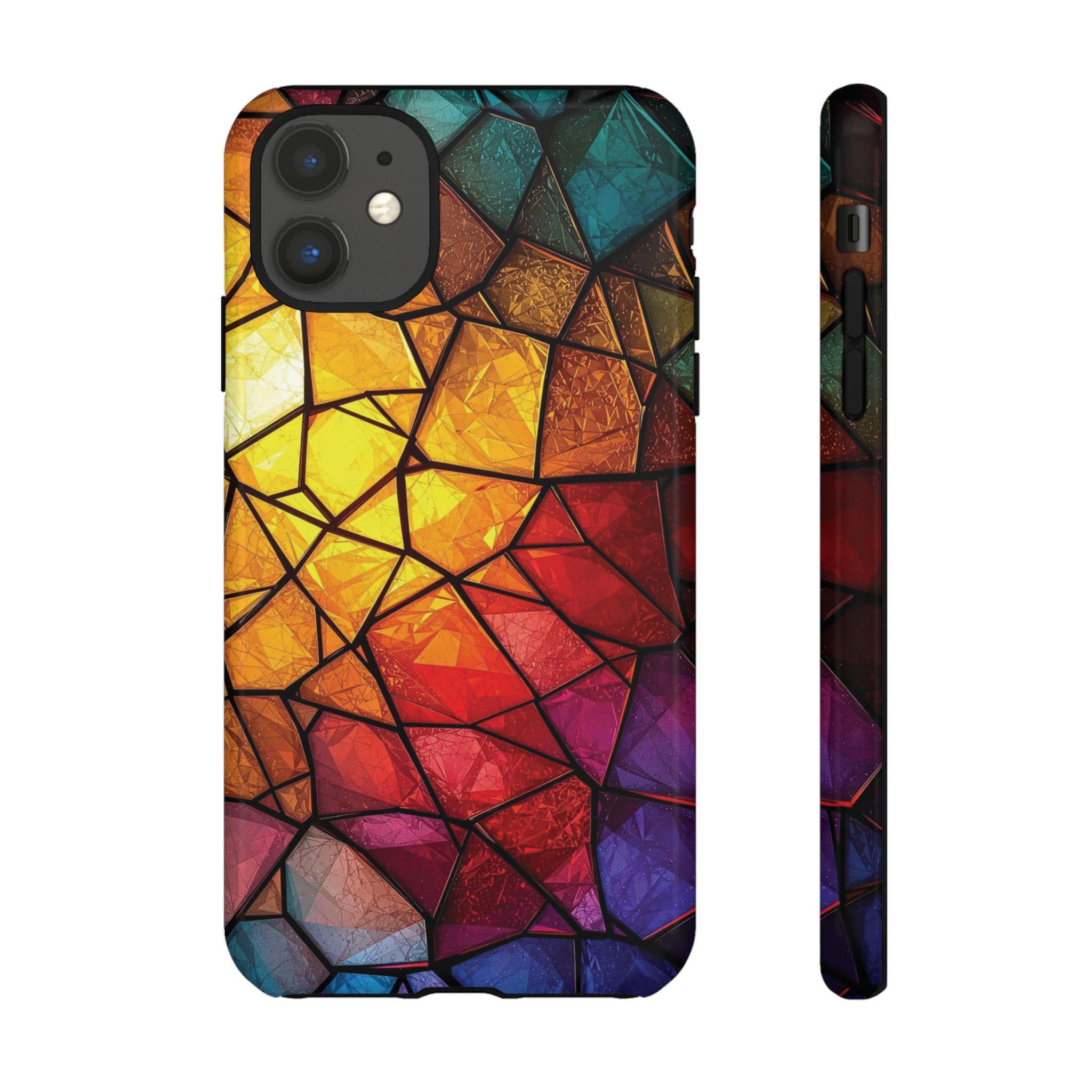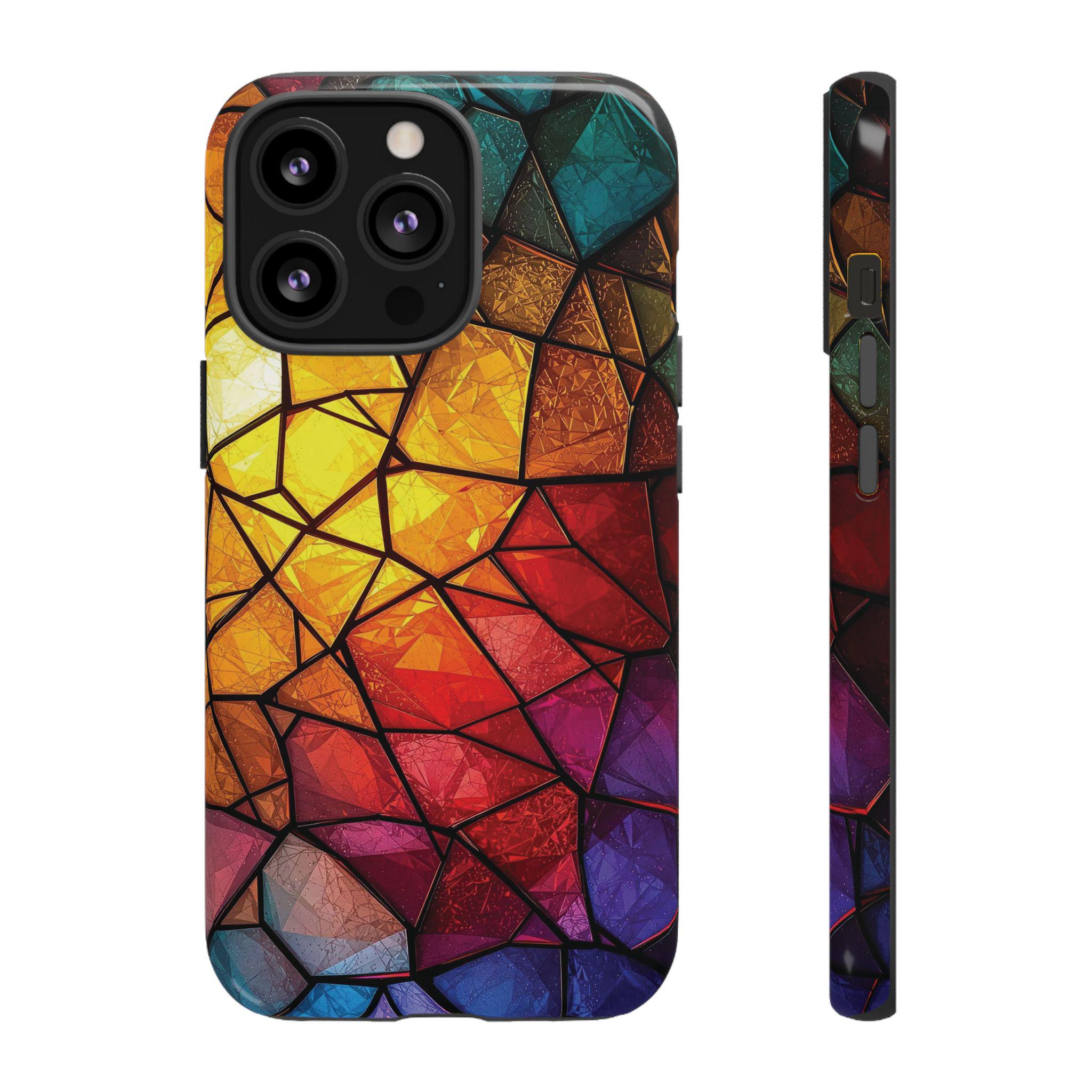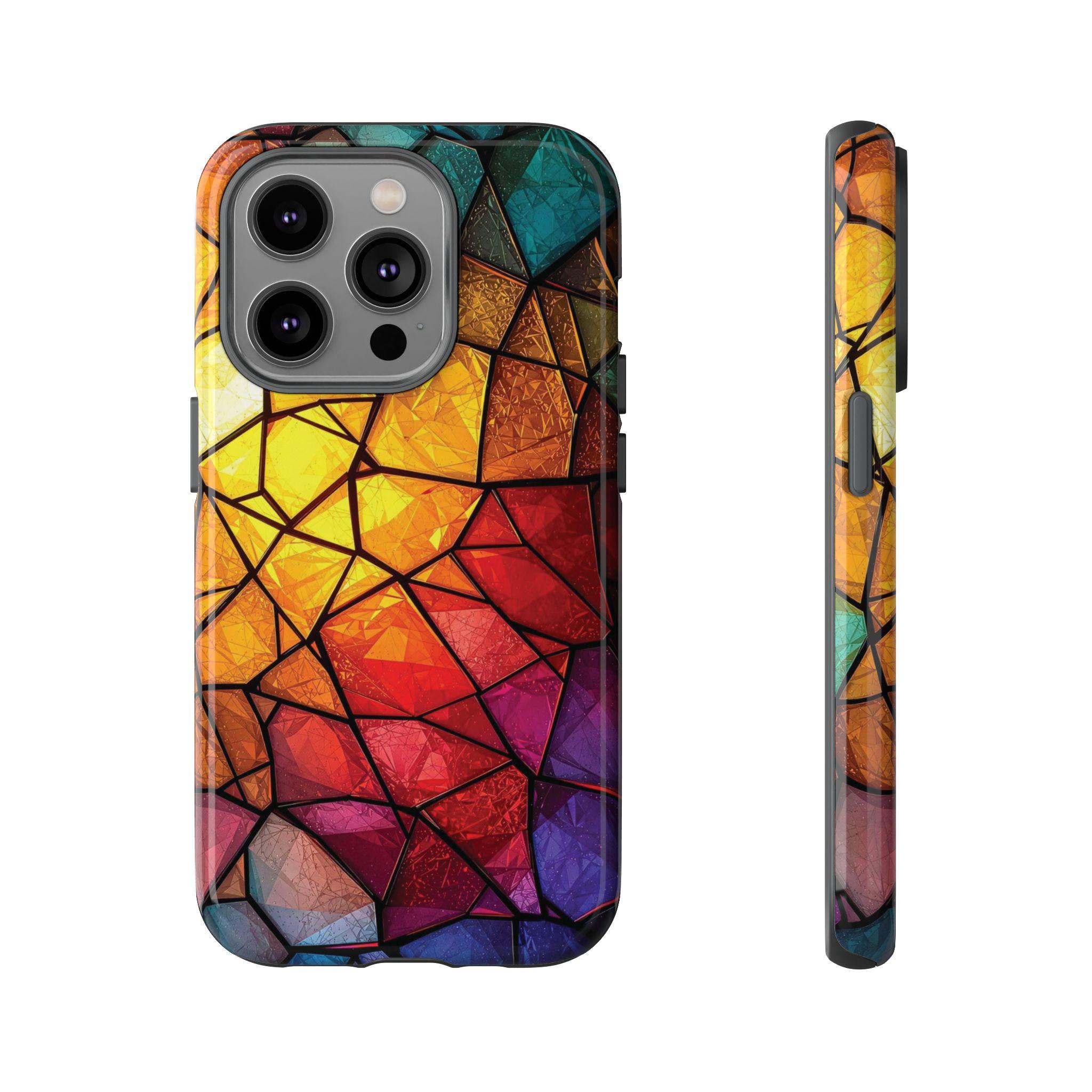 Vibrant stained glass Mosaic IPhone tough case. Introducing our vibrant phone case, designed to brighten your everyday life with stunning artwork. This product adds a cheerful and artistic touch to your phone, making it not just a protective accessory but also a statement piece. This sturdy case is ideal for adults seeking both style and durability. Great for gifting during holidays like birthdays, Mother's Day, or any occasion where you want to bring a smile. Use it to enhance your daily routines, whether at work, school, or leisure activities, and enjoy the subconscious uplift that beautiful designs can bring to your life.