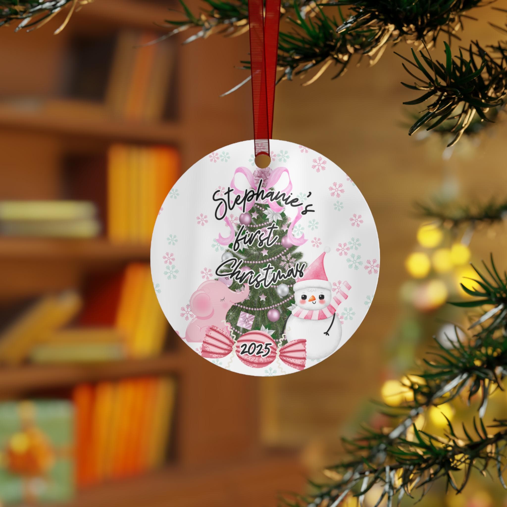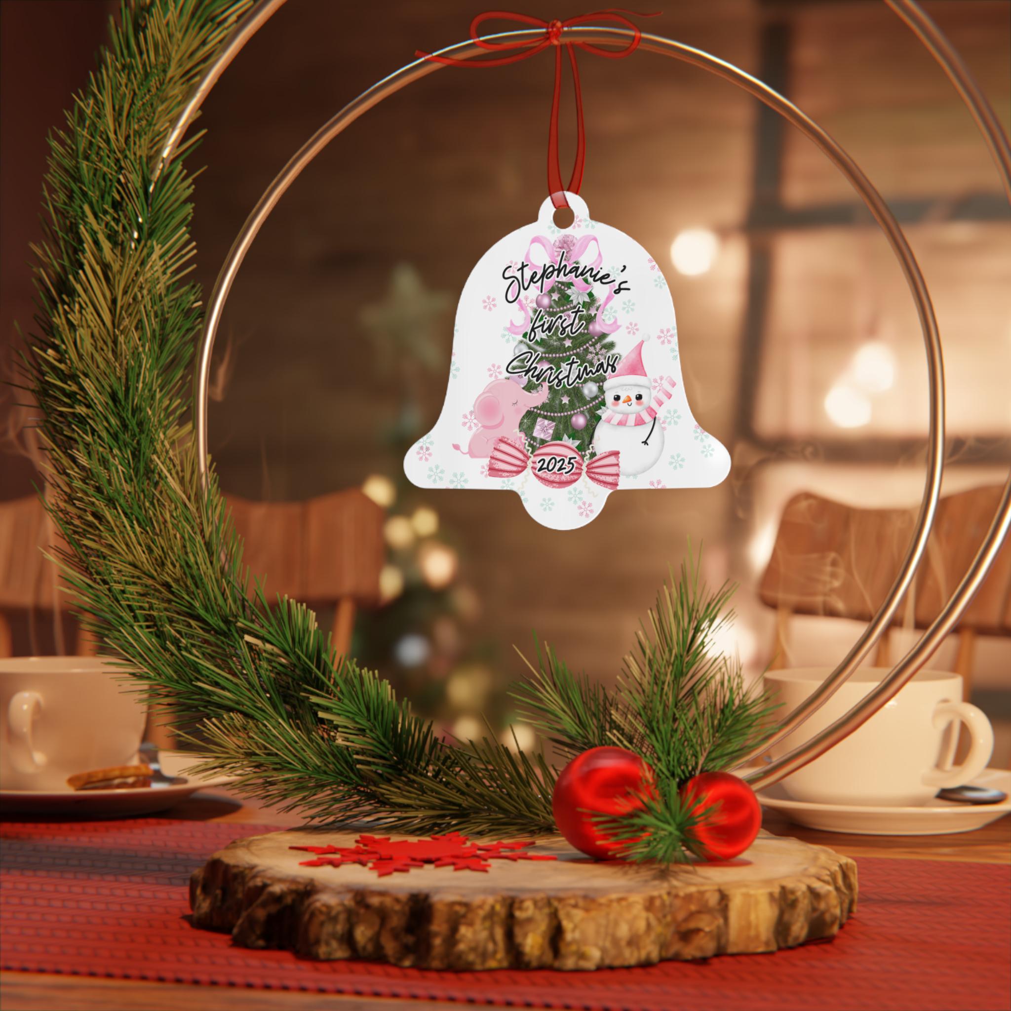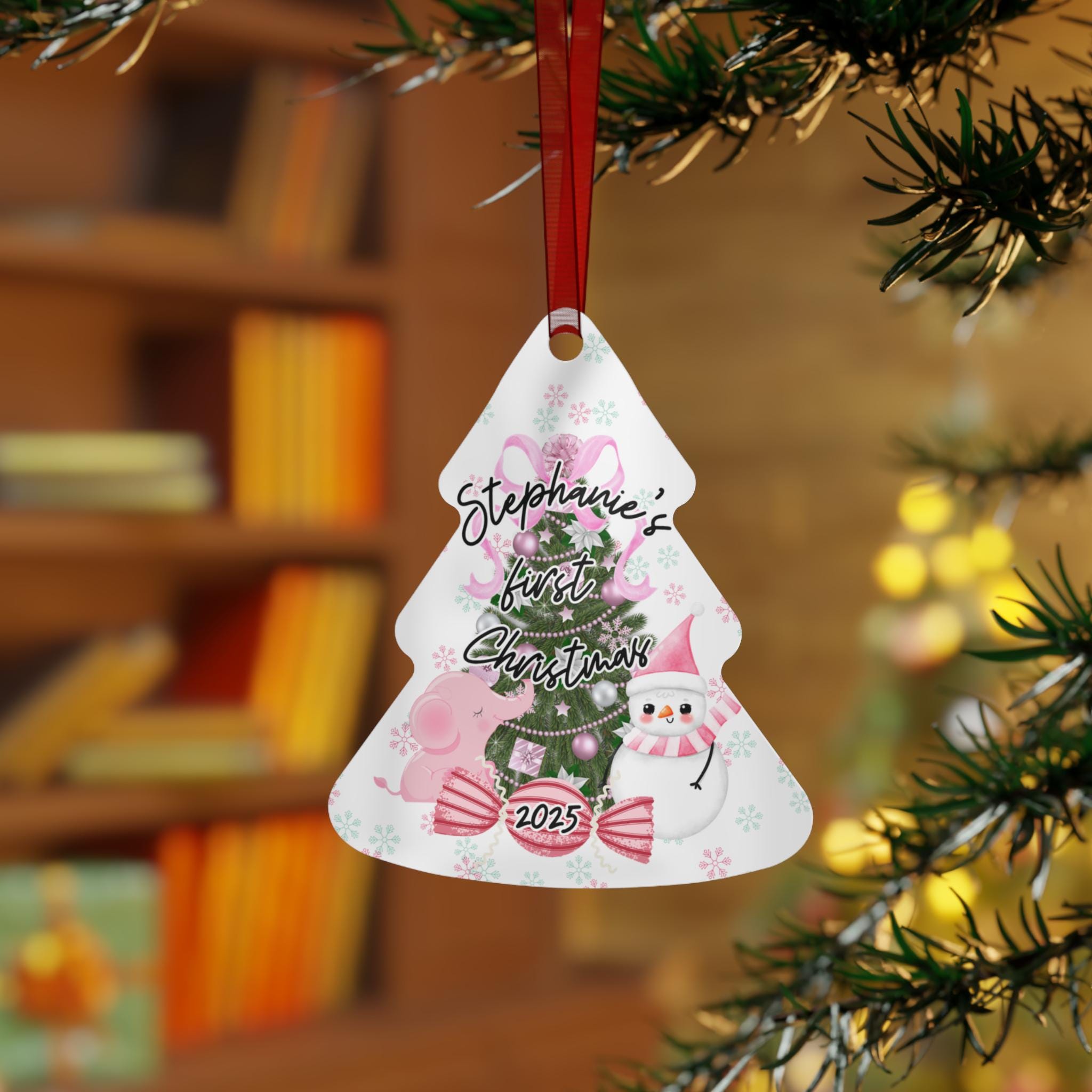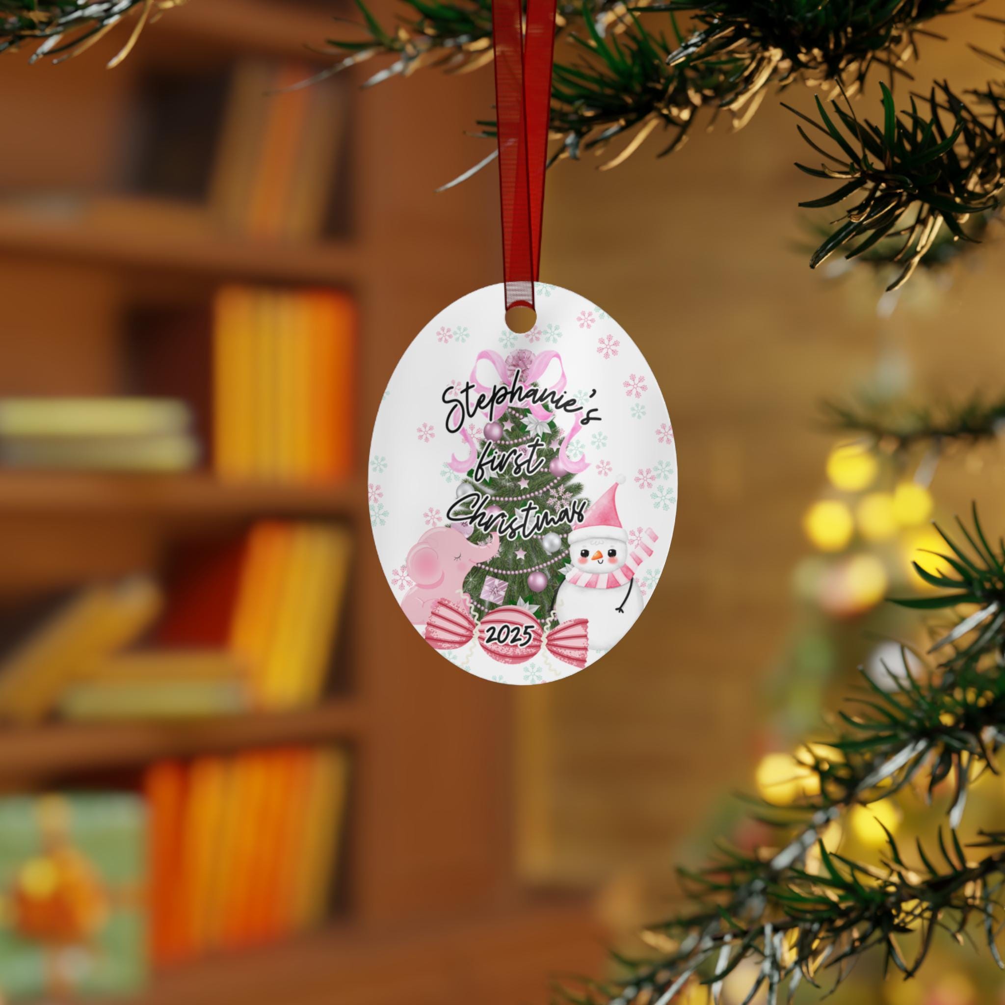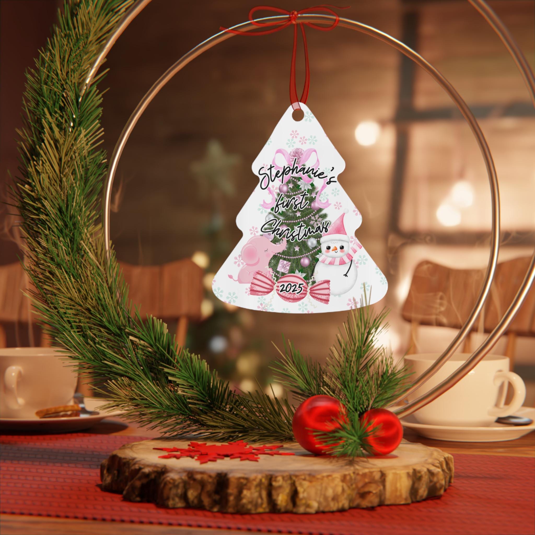 Celebrate your baby girl's first Christmas with these adorable metal ornaments, available in four shapes - Bell, Tree, Round, and Oval. Hang them on your Christmas tree for a festive and unique touch. Perfect for new parents or grandparents looking to commemorate this special occasion.