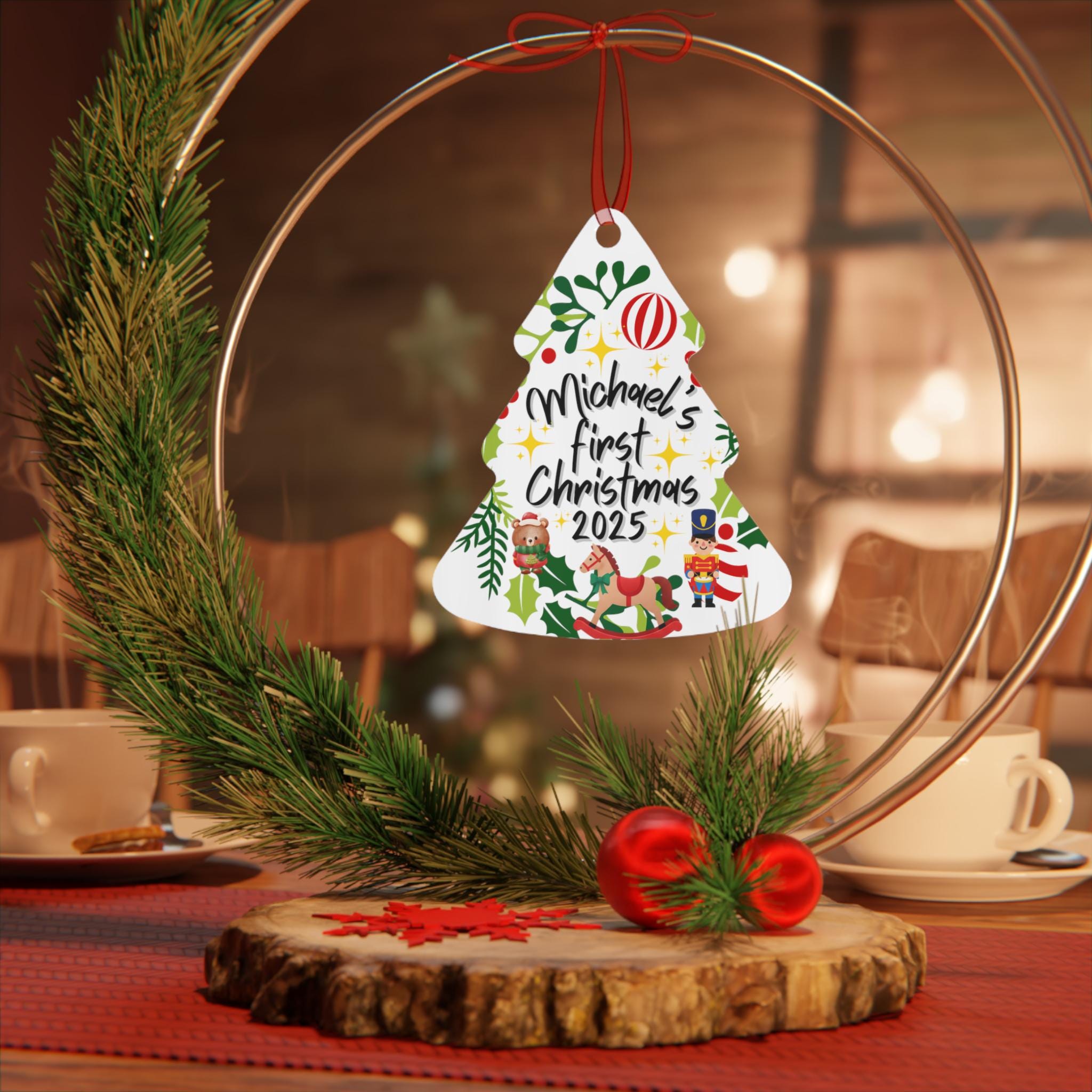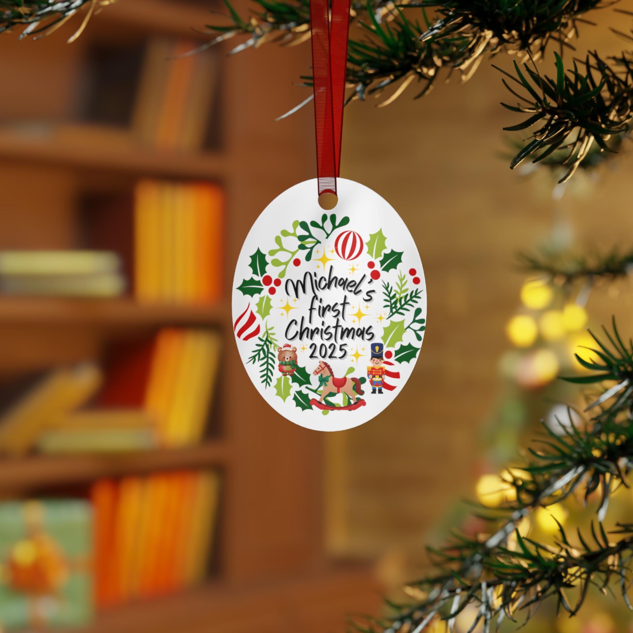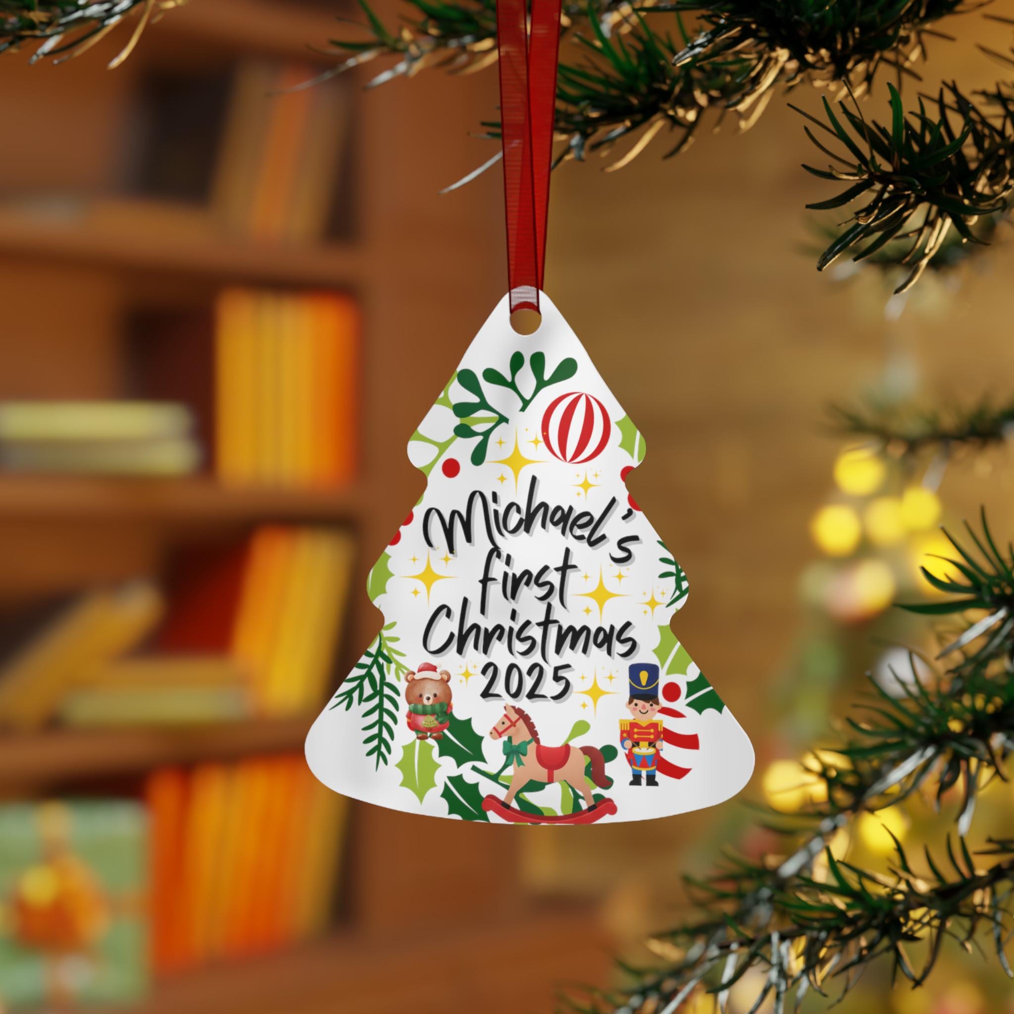 Celebrate your baby boy’s first Christmas with these adorable metal ornaments, available in four shapes - Bell, Tree, Round, and Oval. Hang them on your Christmas tree for a festive and unique touch. Perfect for new parents or grandparents looking to commemorate this special occasion.