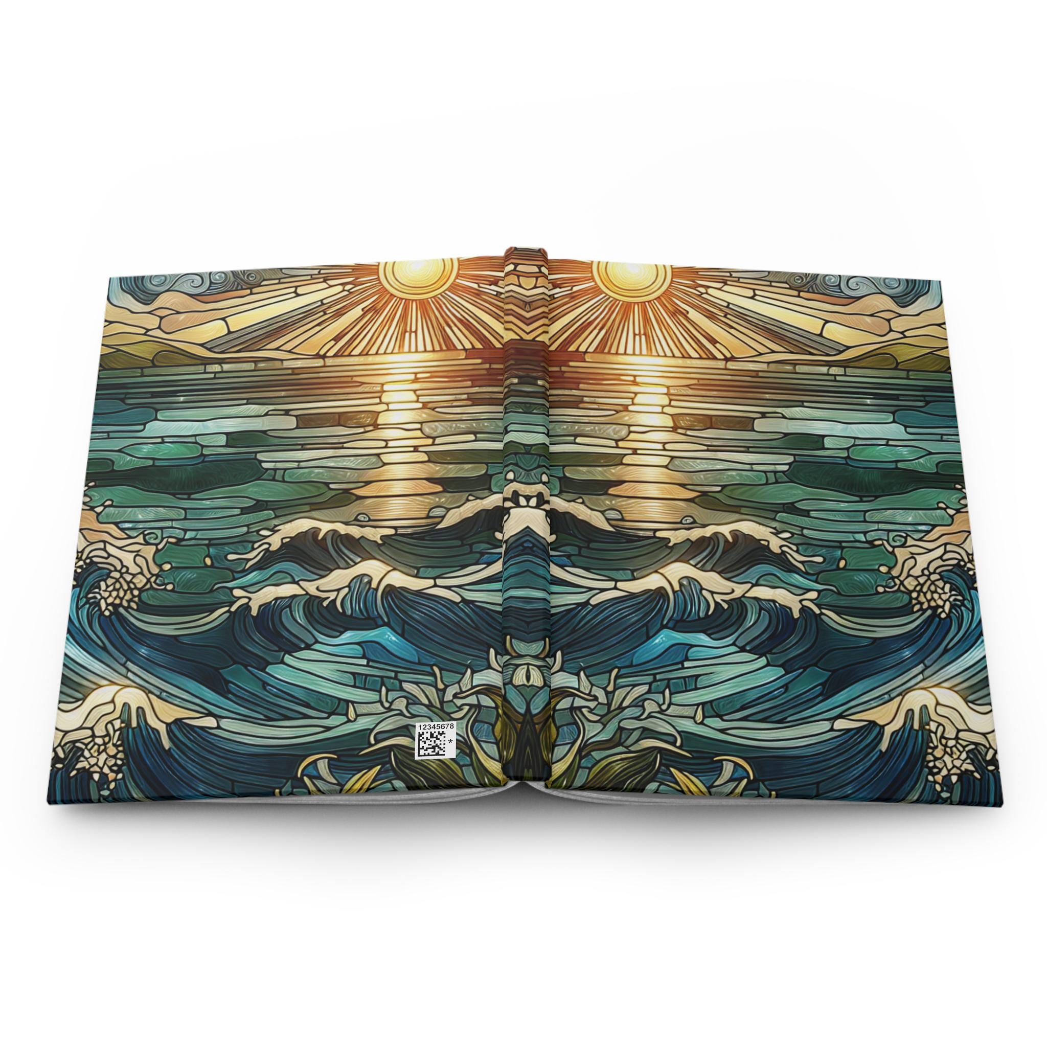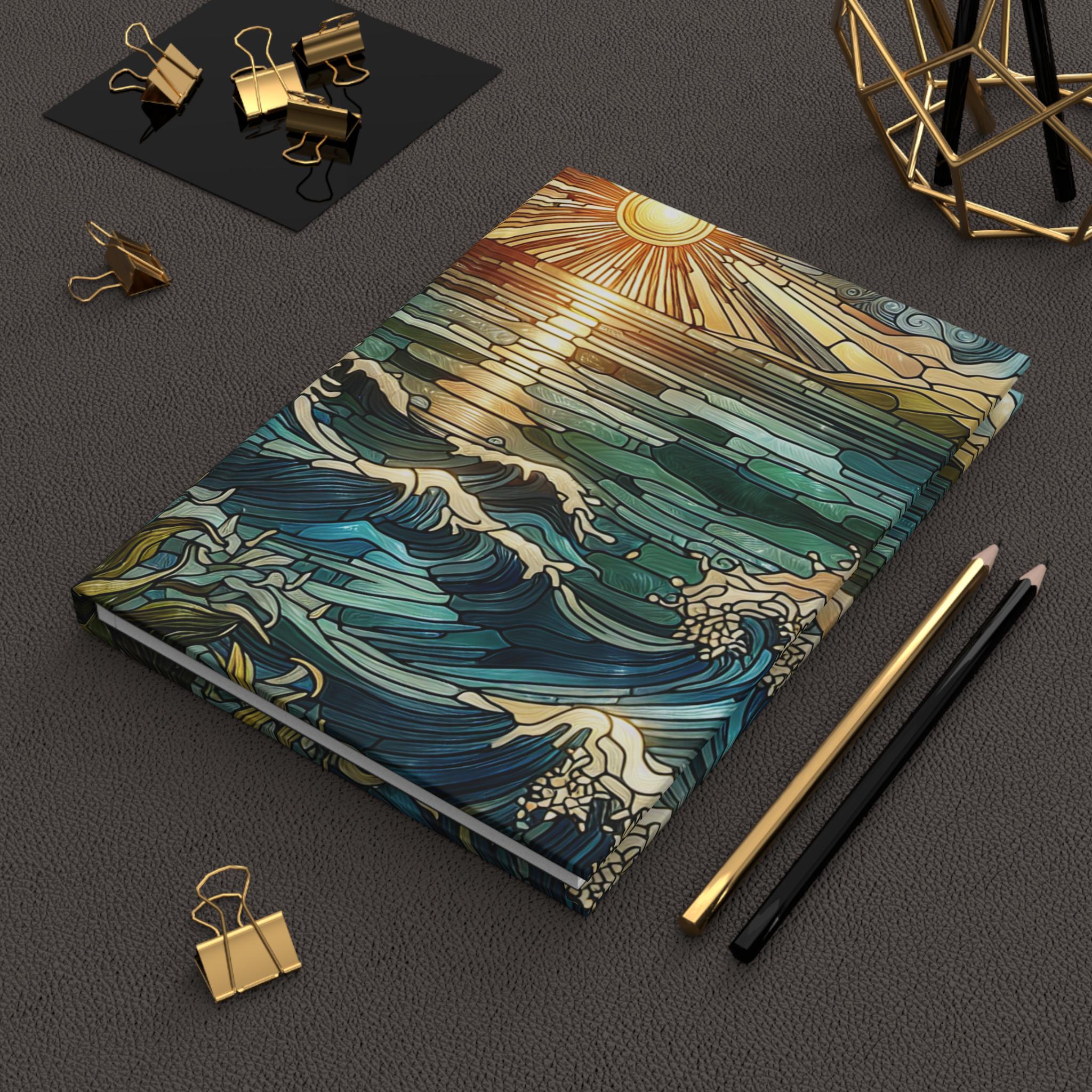 Swirling ocean with sun and sun rays stained glass artistic hard covered lined journal that gives a serene and artistic vibe. Perfect for creative souls looking for inspiration. Ideal for writers, artists, and anyone who loves to jot down their thoughts or sketches. Relevant for beach lovers, summer enthusiasts, and those who appreciate serene and beautiful designs. Great for gift giving on birthdays, holidays, and special occasions.