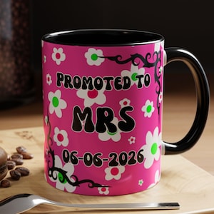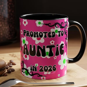 Personalized Pregnancy announcement mug perfect for revealing to your Mom or Mother-in-law that they are soon to be a Grandma. The bright bold colors and Ditsy Daisy flowers create a cheerful and attention-grabbing design. This mug is relevant for pregnancy announcements, baby showers, and family gatherings.