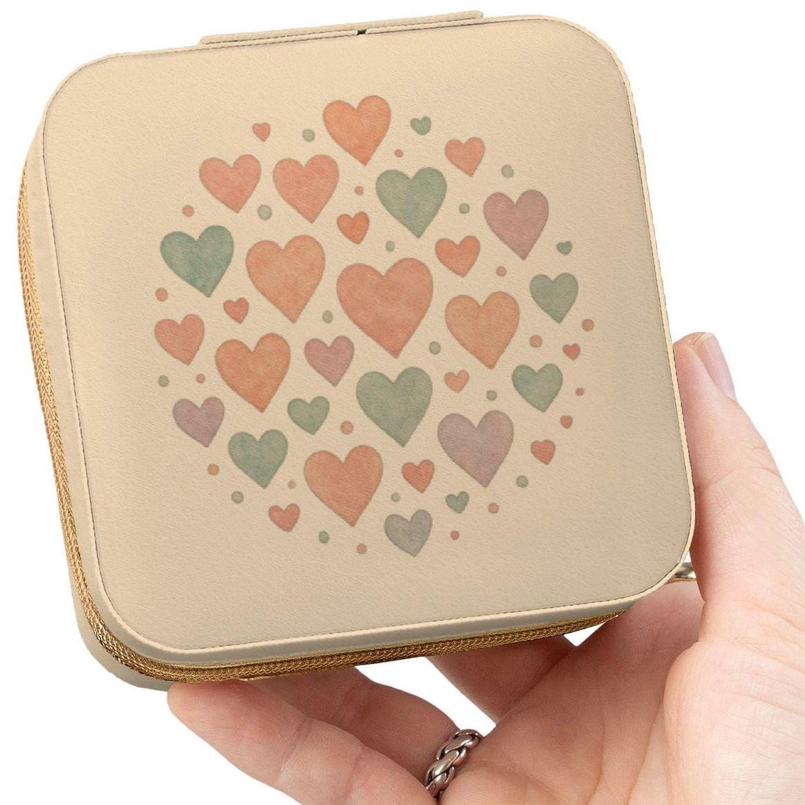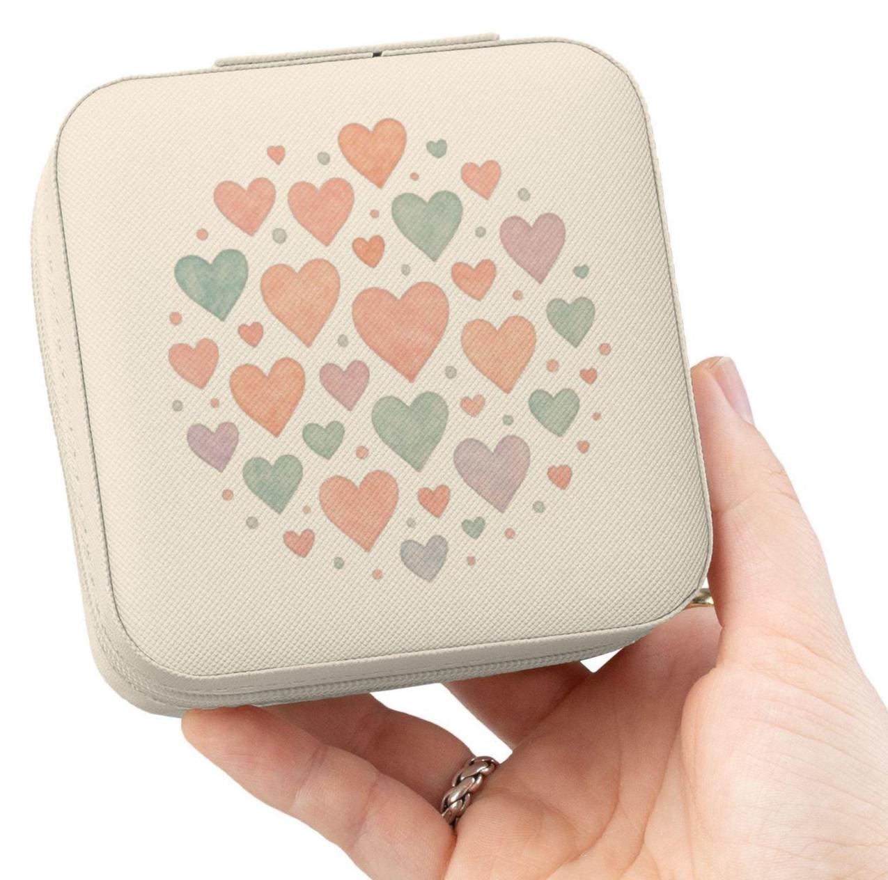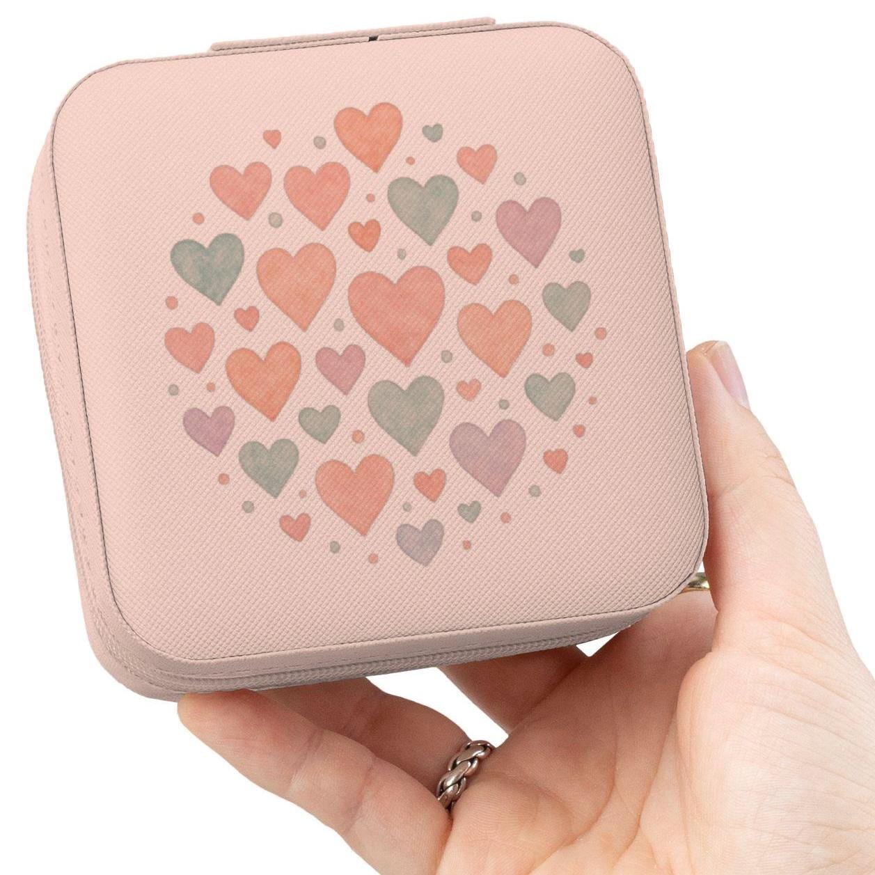 Heart Pattern Jewelry Case, compact and pink, designed for organizing rings, earrings, and necklaces while traveling. Gives a cute and organized vibe, perfect for jewelry lovers on the go. Relevant for holidays, birthdays, and special occasions.