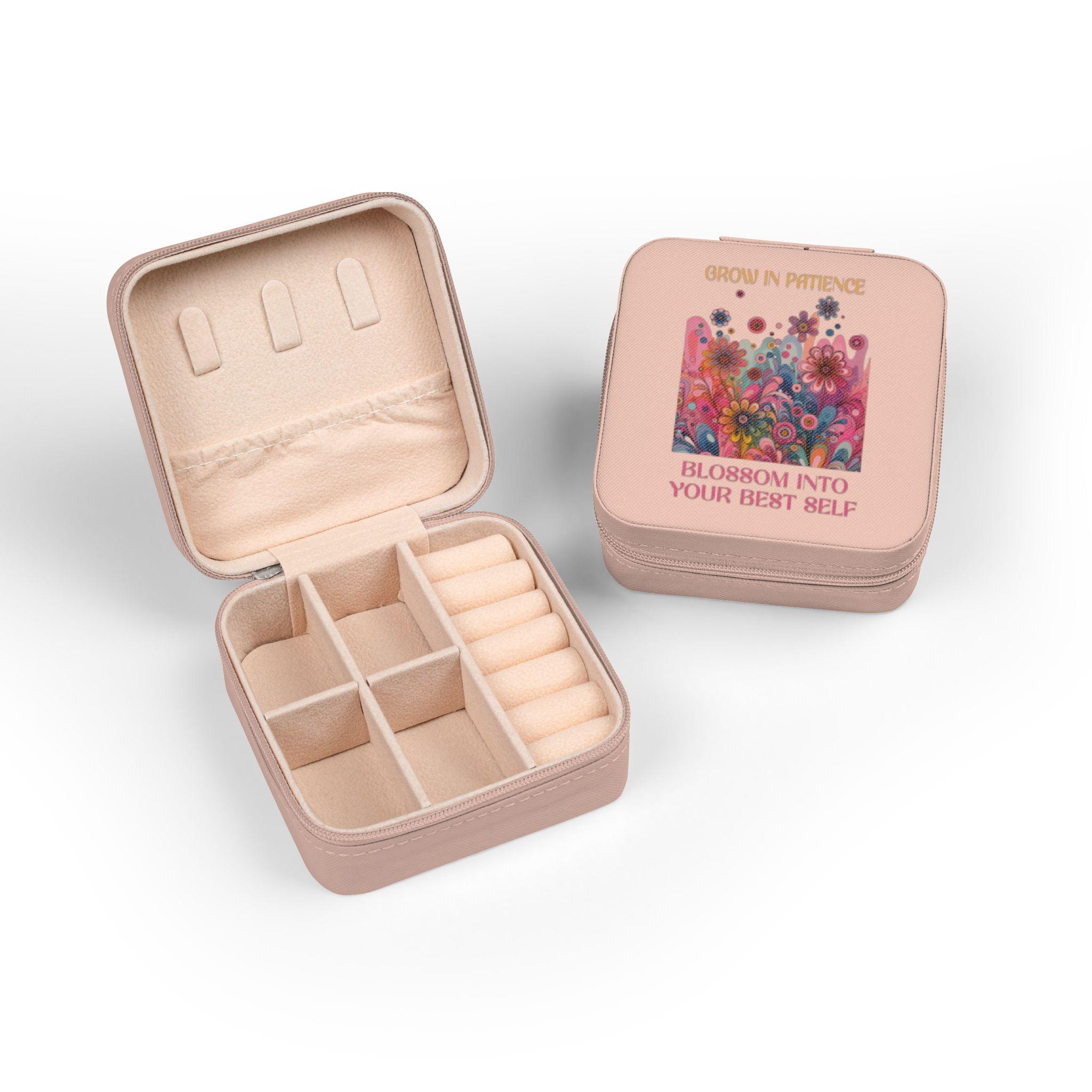 Flower Pattern Jewelry Case, compact and pink, designed for organizing rings, earrings, and necklaces while traveling. Gives a cute and organized vibe, perfect for jewelry lovers on the go. Relevant for holidays, birthdays, and special occasions.