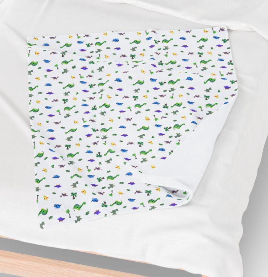 A velveteen plush blanket printed with a whimsical, tiny dinosaur pattern on a white background. The surface is smooth and velvety, with rich, high-detail color on one side and a cozy white backing. It wraps around quiet afternoons, story time, or chilly evening couch sessions — light enough to toss into a picnic basket, substantial enough to use in the stroller. The small-scale motif keeps the look playful without overwhelming a room, blending easily with nursery linens or eclectic living spaces. Durable double-stitched seams and a medium heavy weight give it a reassuring heft that feels indulgent against the skin while holding up to many washes.