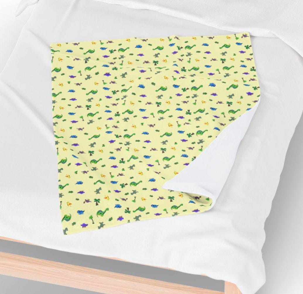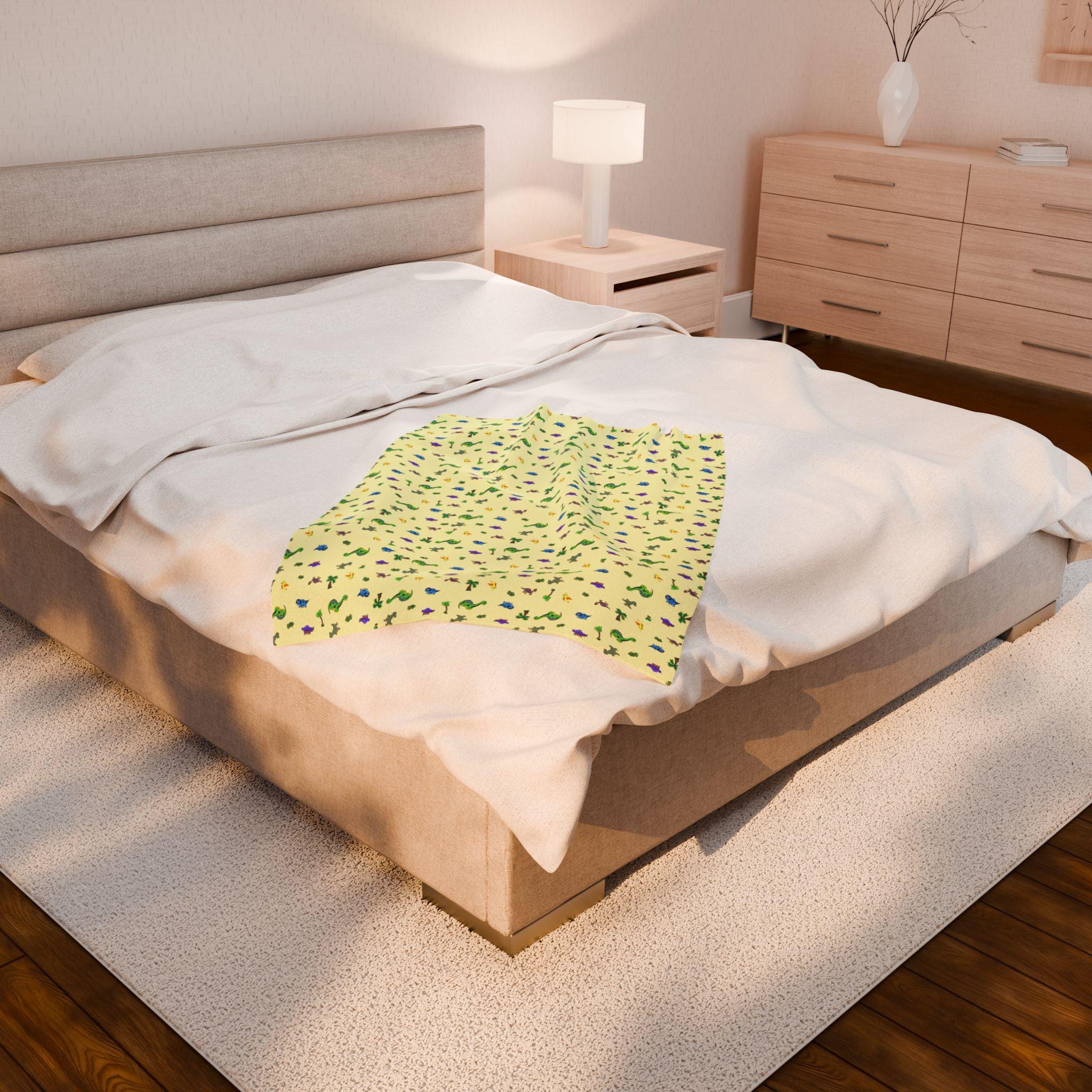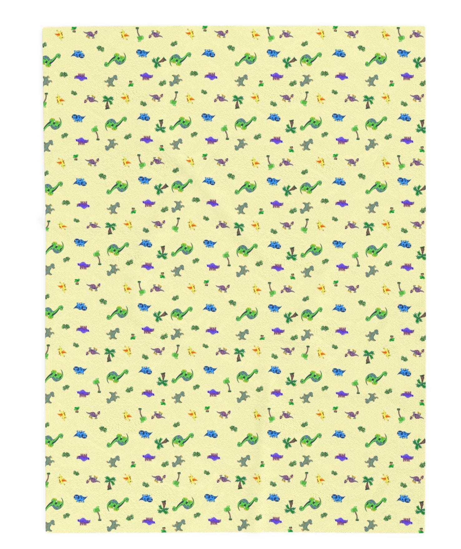 A velveteen plush blanket printed with a whimsical, tiny dinosaur pattern on a soft yellow background. The surface is smooth and velvety, with rich, high-detail color on one side and a cozy white backing. It wraps around quiet afternoons, story time, or chilly evening couch sessions — light enough to toss into a picnic basket, substantial enough to use in the stroller. The small-scale motif keeps the look playful without overwhelming a room, blending easily with nursery linens or eclectic living spaces. Durable double-stitched seams and a medium heavy weight give it a reassuring heft that feels indulgent against the skin while holding up to many washes.