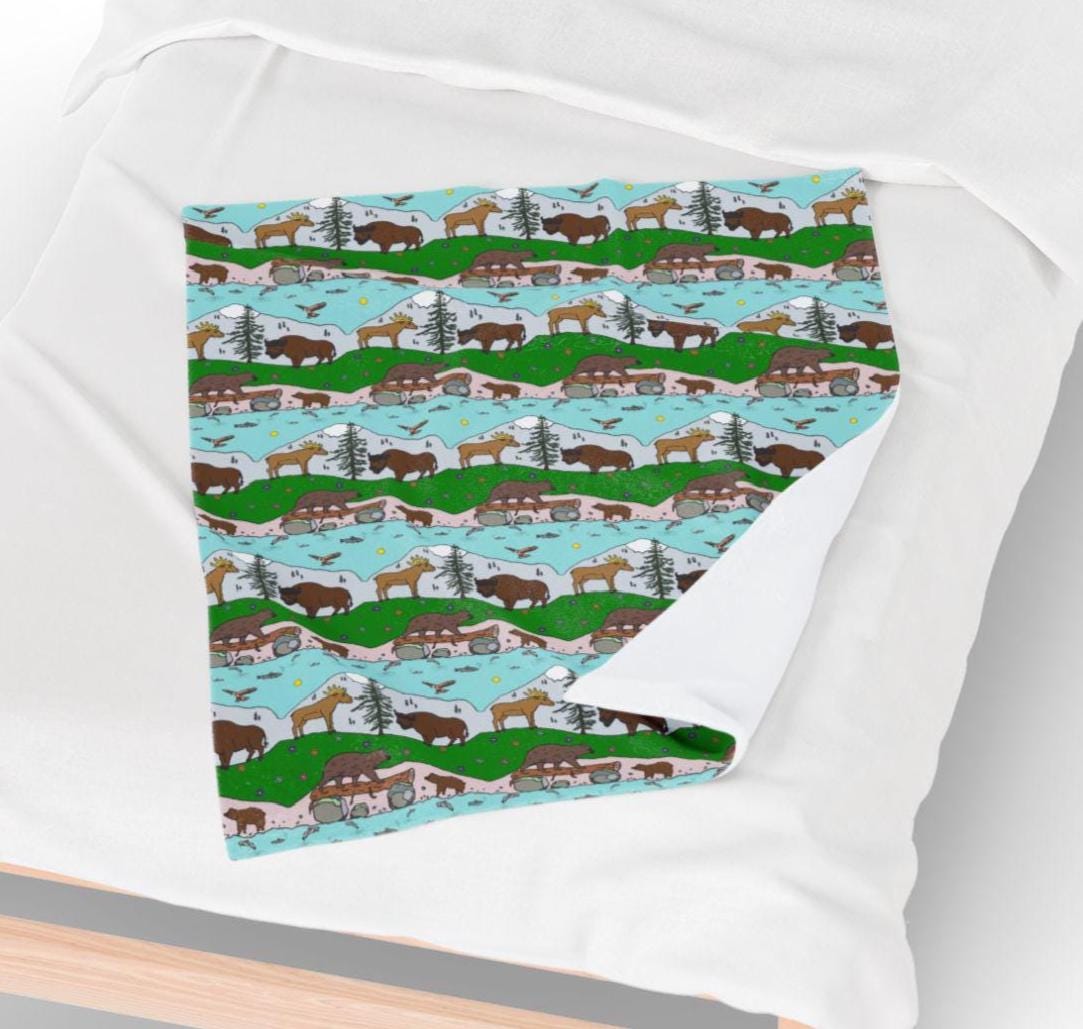 Wrap this velveteen plush blanket around your baby or toddler and watch them drift into a quiet northern evening. Soft bison, moose, bear, eagle and trout design form a wandering landscape — like a nature trail sketched across the fabric. It’s warm and substantial without being bulky. The rich, detailed print on one side brings the wildlife scene to life while the plush backing invites tiny hands to stay a little longer. Use it during low-light storytimes where woodland tales come alive.
