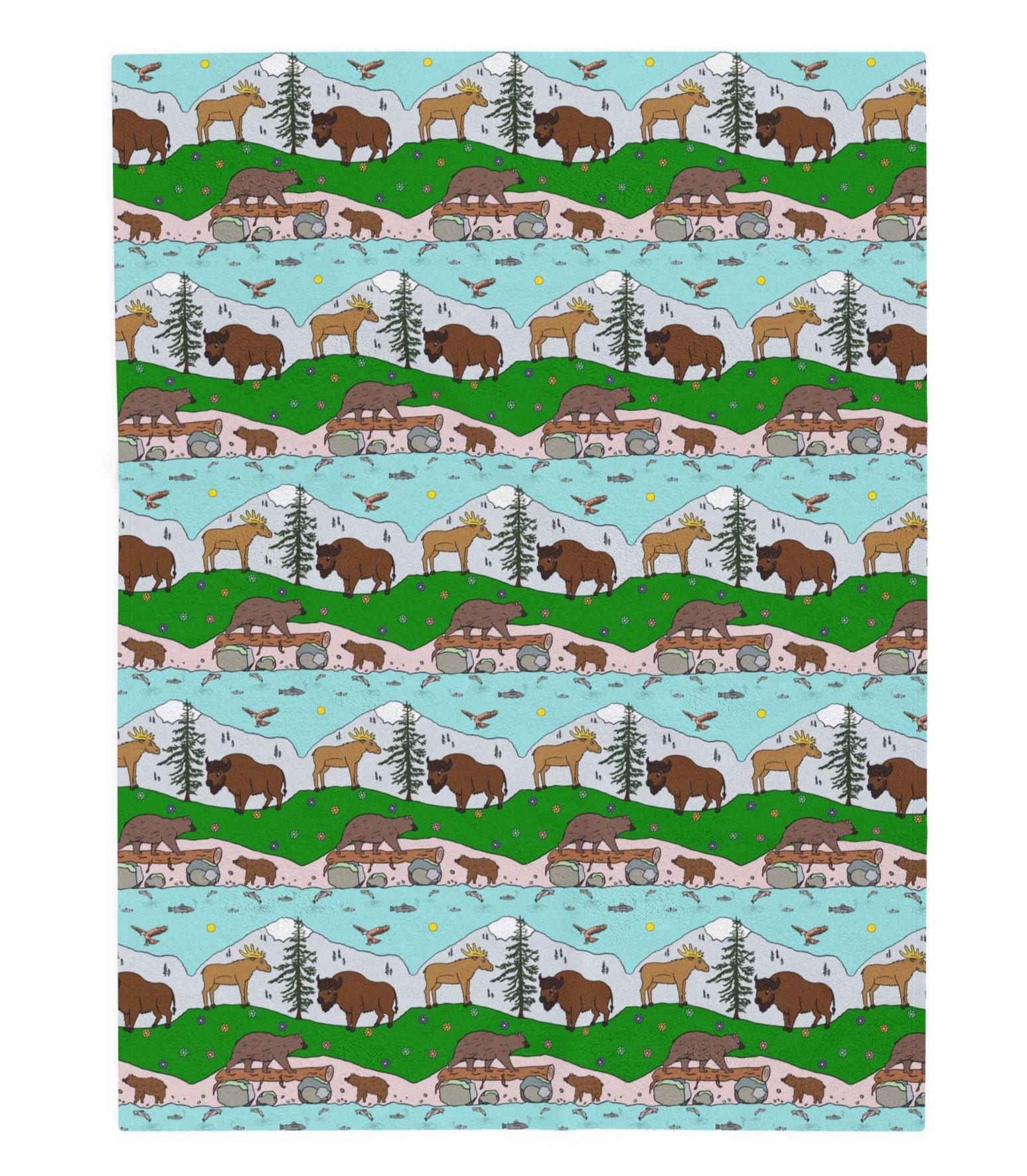 Wildlife Bison Moose Bear Eagle Trout Pattern Velveteen Plush Baby Toddler Blanket (30x40 inches)