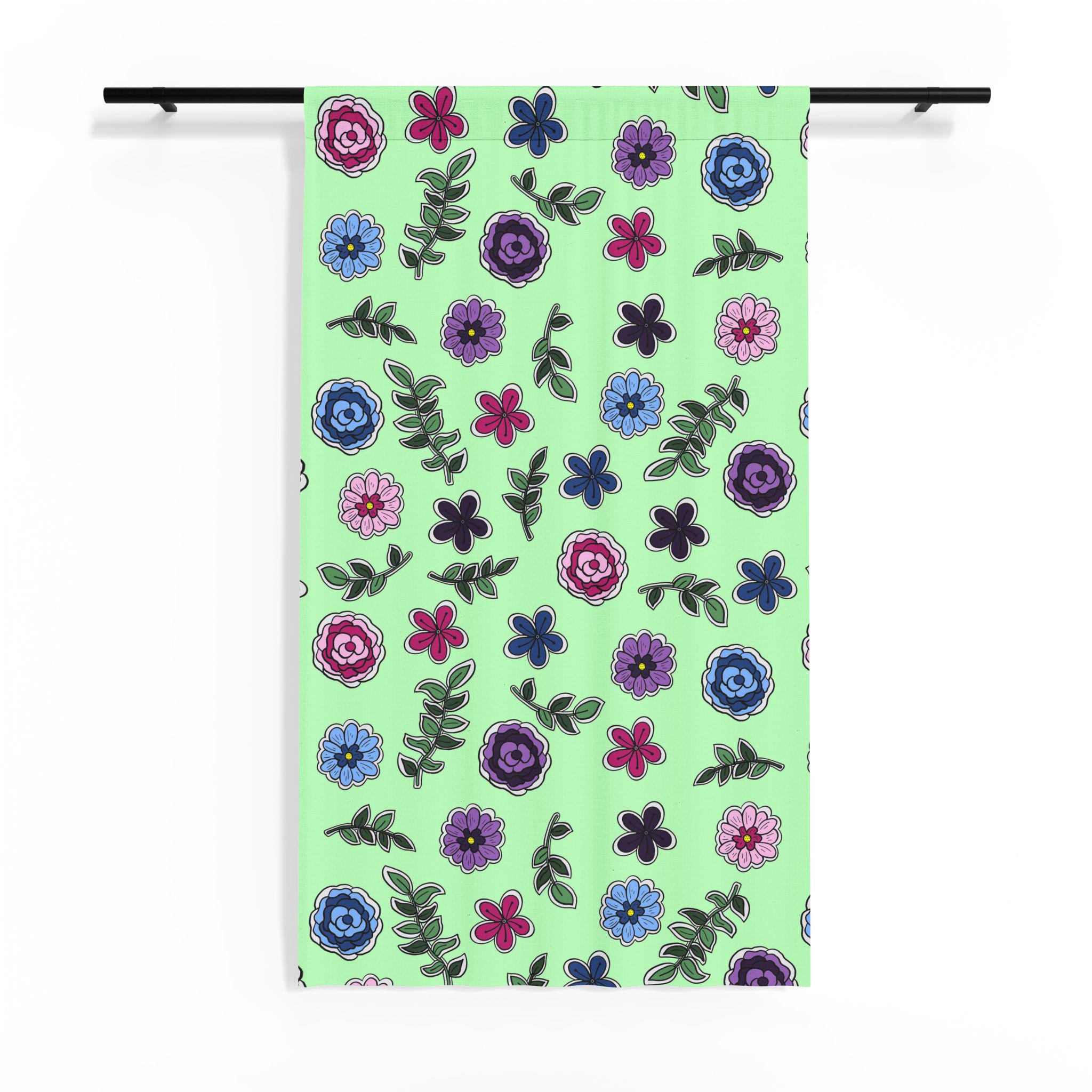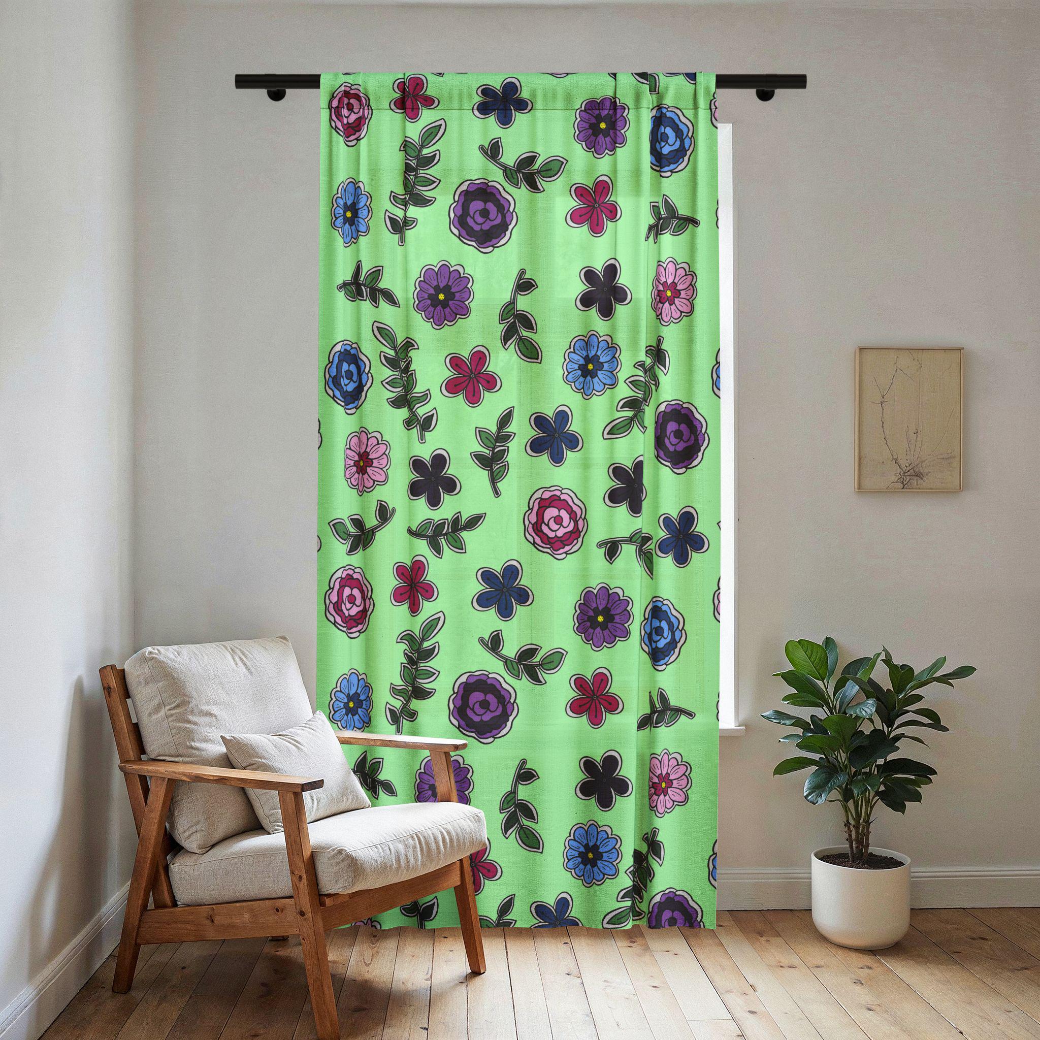 A lightweight sheer curtain painted with hand-drawn florals on a cheery green background. The playful blooms—blues, pinks, and purples with soft green leaves—float across the panel, filtering daylight into a moody, cozy glow. Hang this sheer in a reading nook or bedroom to add quiet color without blocking the view. The translucent fabric keeps the room feeling open while lending an intimate, artistic touch that works with vintage wood, rattan, or modern minimal furnishings. Bring a whisper of cottage-garden charm and late-afternoon warmth to the space.