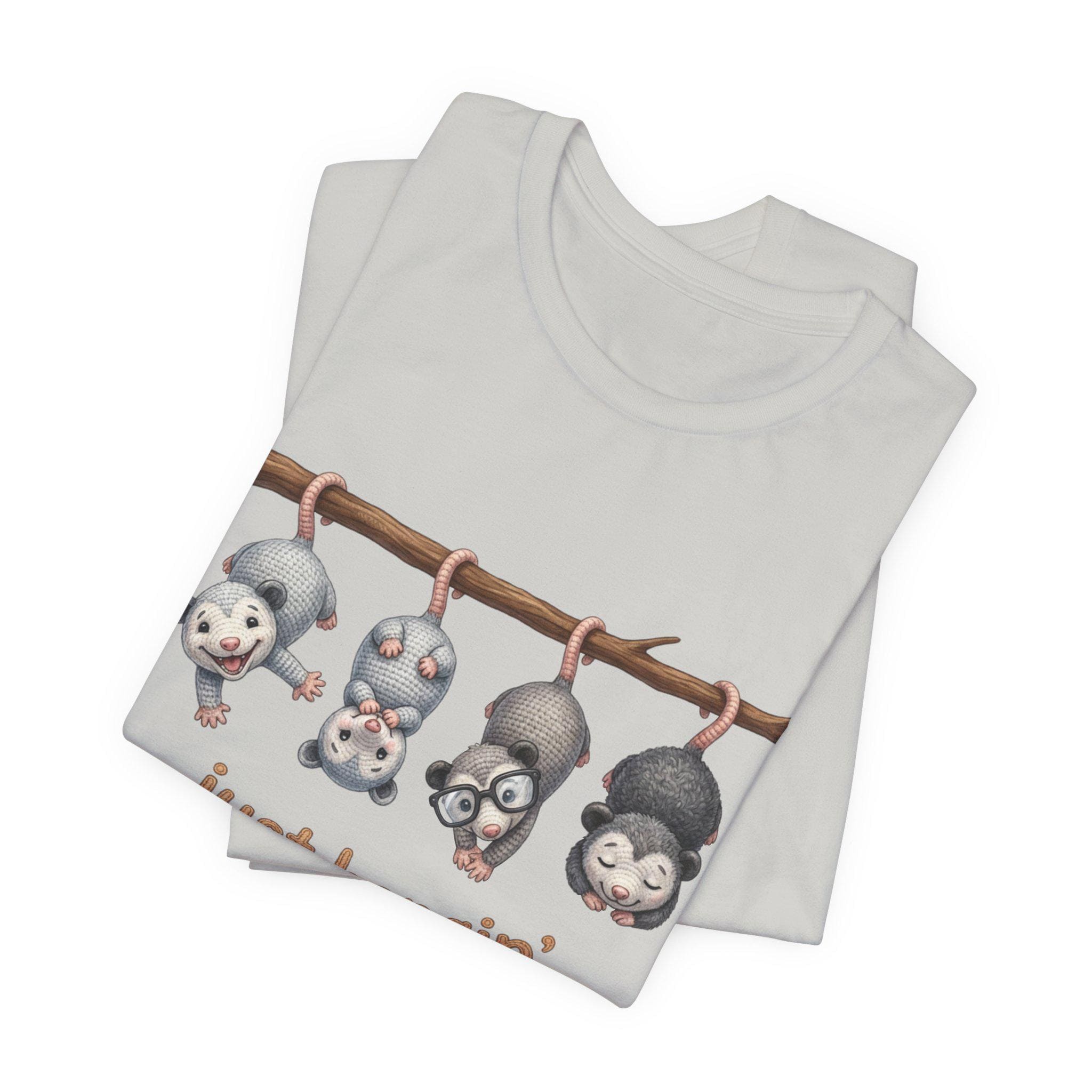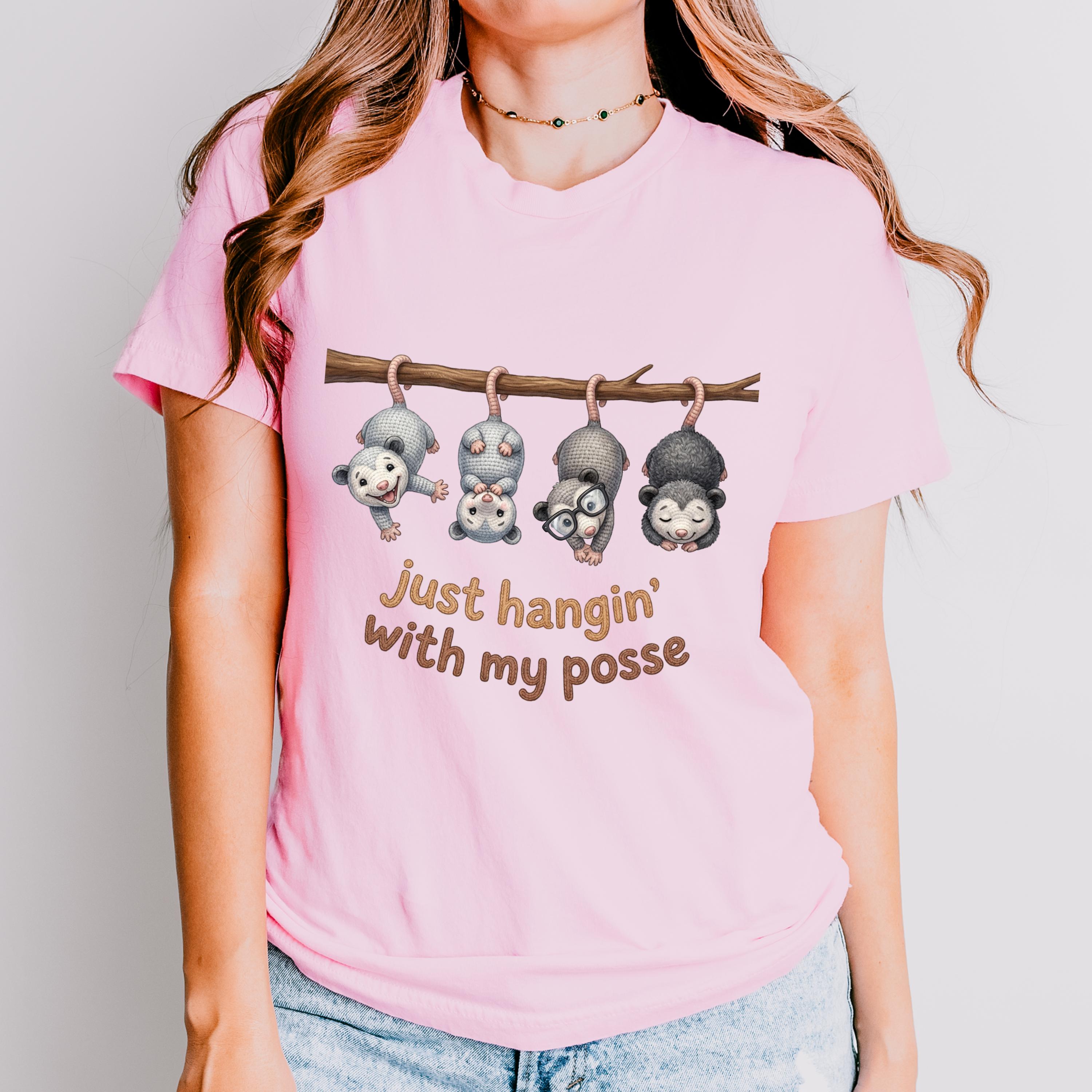 A soft, breathable tee that brings a little woodland whimsy to everyday wear. Four tiny possums hang from a branch above the playful phrase “just hangin’ with my posse,” giving the shirt a sweet, cozy vibe that feels like a laugh among friends. The lightweight Airlume combed cotton keeps you cool and comfortable whether you’re running errands, lounging at home, or layering under a jacket. The clean crew neckline and retail fit make it easy to style with jeans, overalls, or a cardigan — it slips into casual routines without fuss and sparks smiles whenever it’s seen.